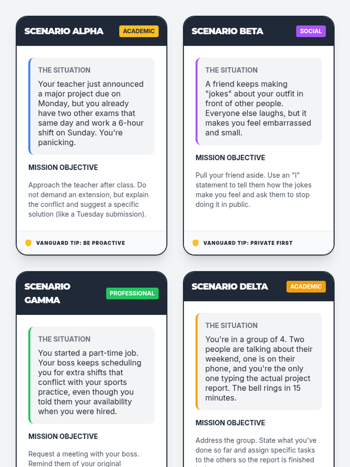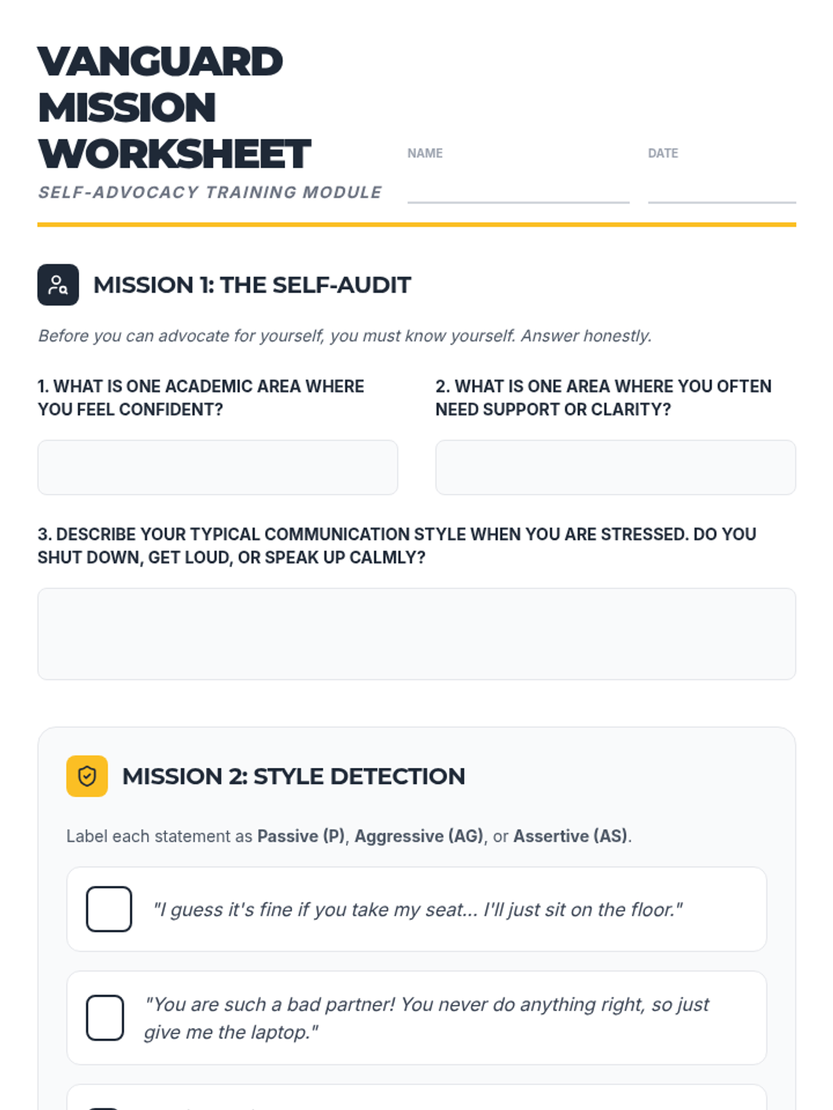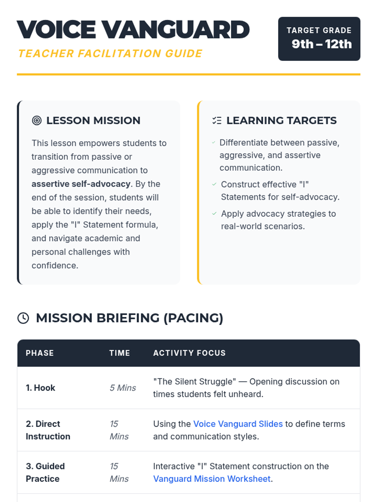 This lesson empowers 9th-12th grade students to develop self-advocacy skills through scenario analysis and role-playing, building the confidence to articulate their needs and boundaries in academic and personal settings.