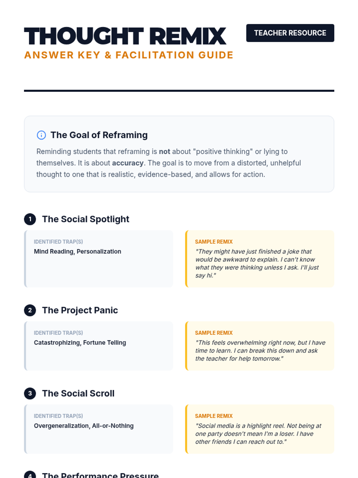 A comprehensive lesson for 10th-grade students on identifying negative thought patterns and practicing cognitive reframing techniques using relatable high school scenarios.