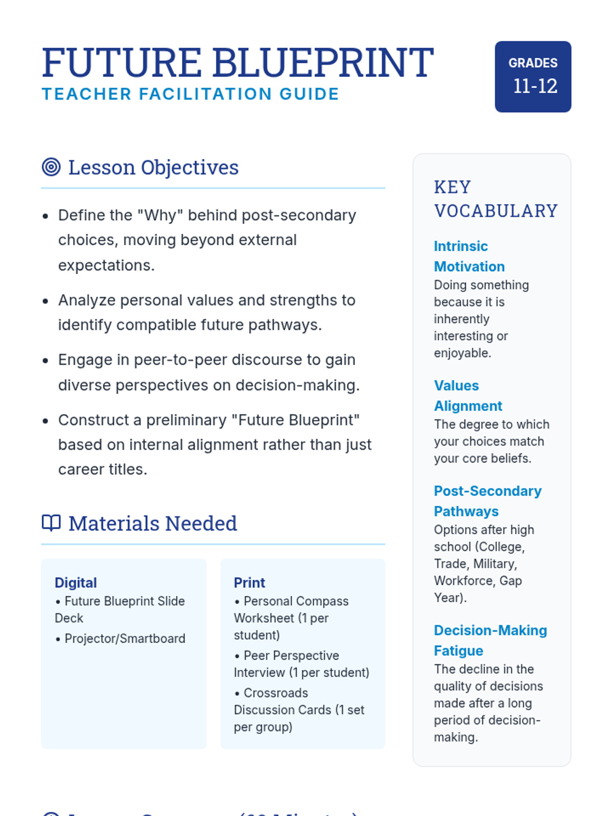 A comprehensive lesson for 11th and 12th graders focused on introspective post-secondary planning, aligning personal values and strengths with future career and education pathways.