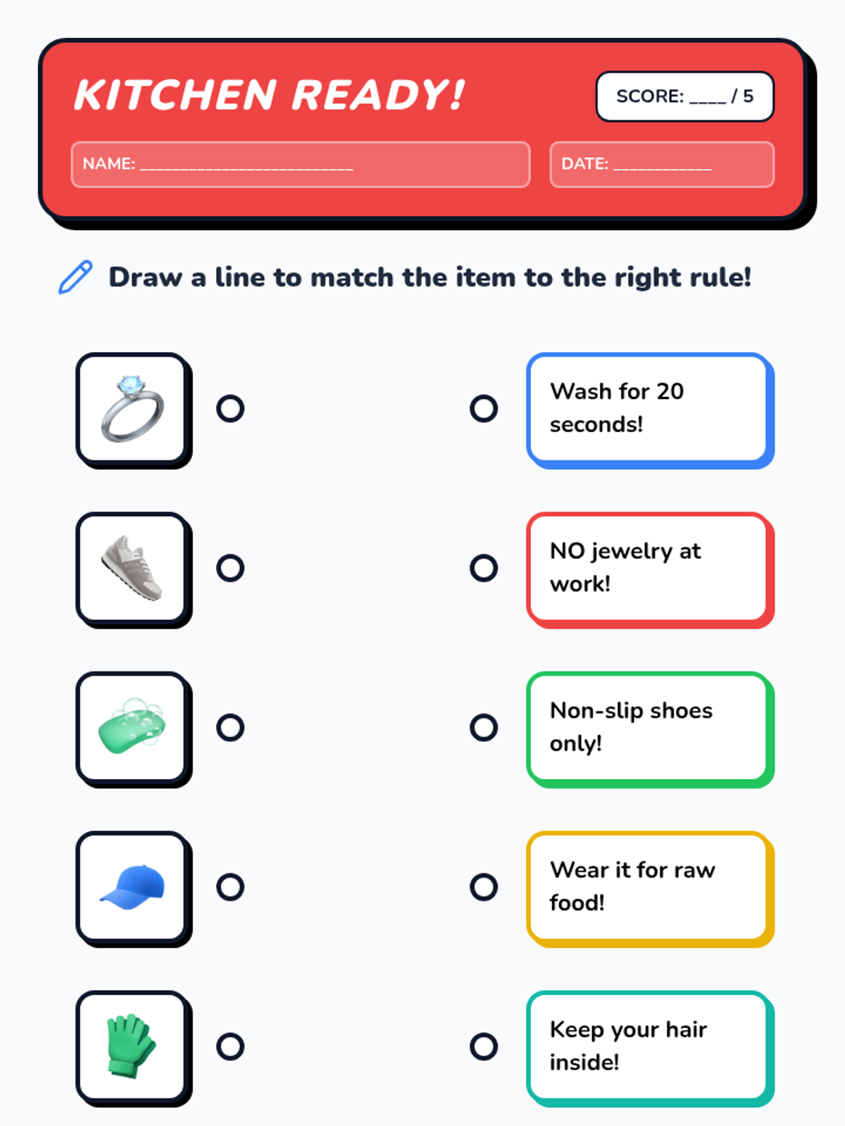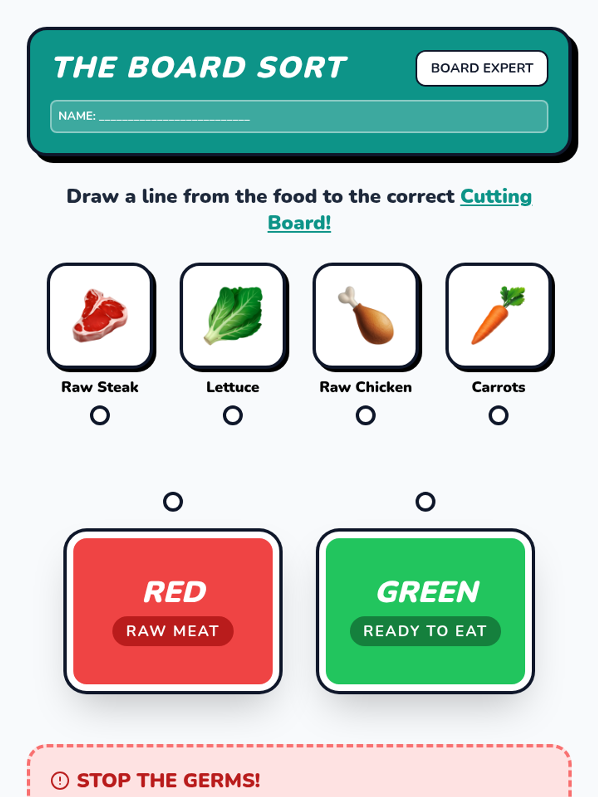 Teaches the concepts of cross-contamination and cutting board color-coding through visual analogies and interactive checks.