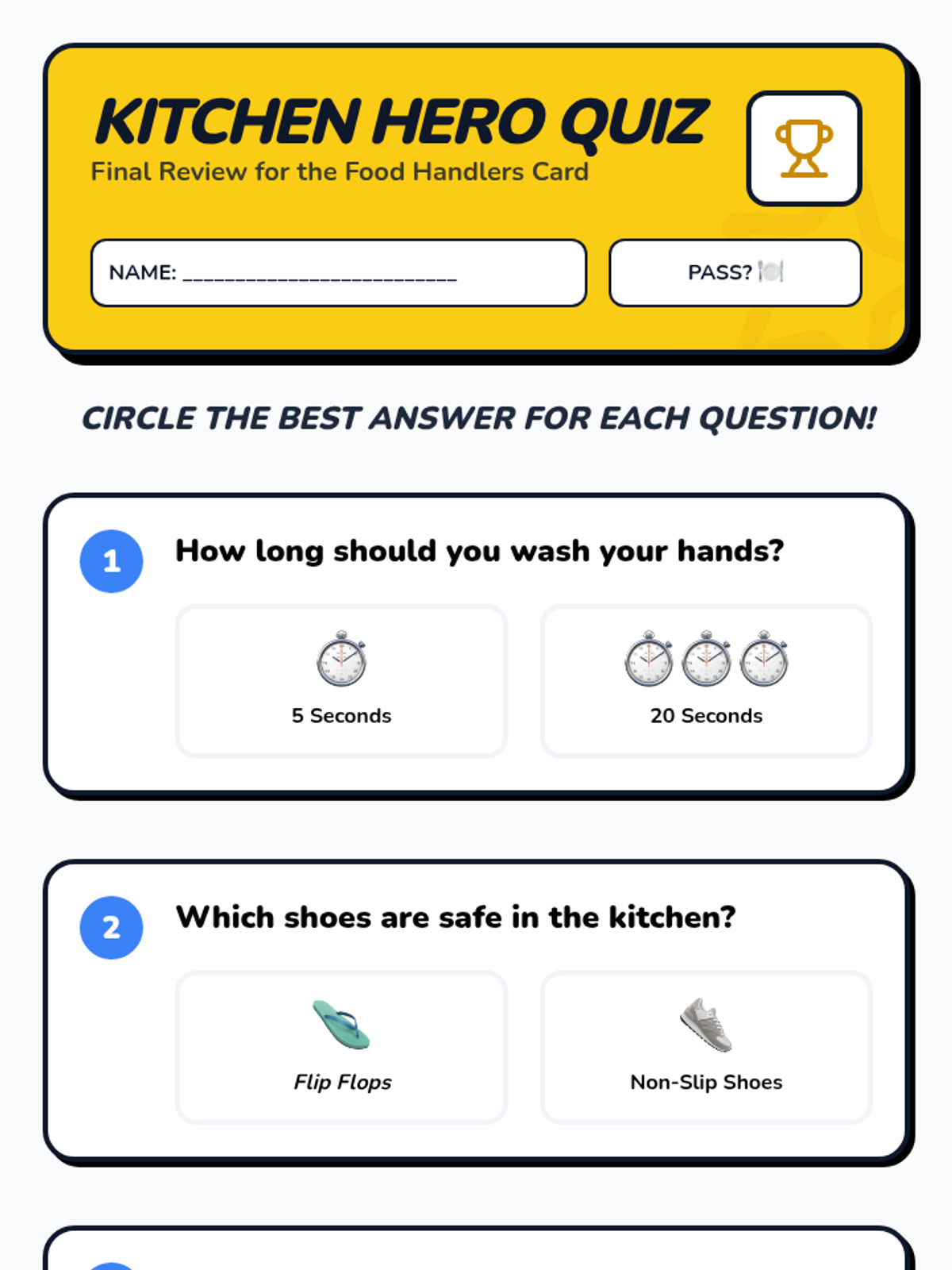 A review of all concepts and a simplified practice exam to prepare students for the official food handlers certification.