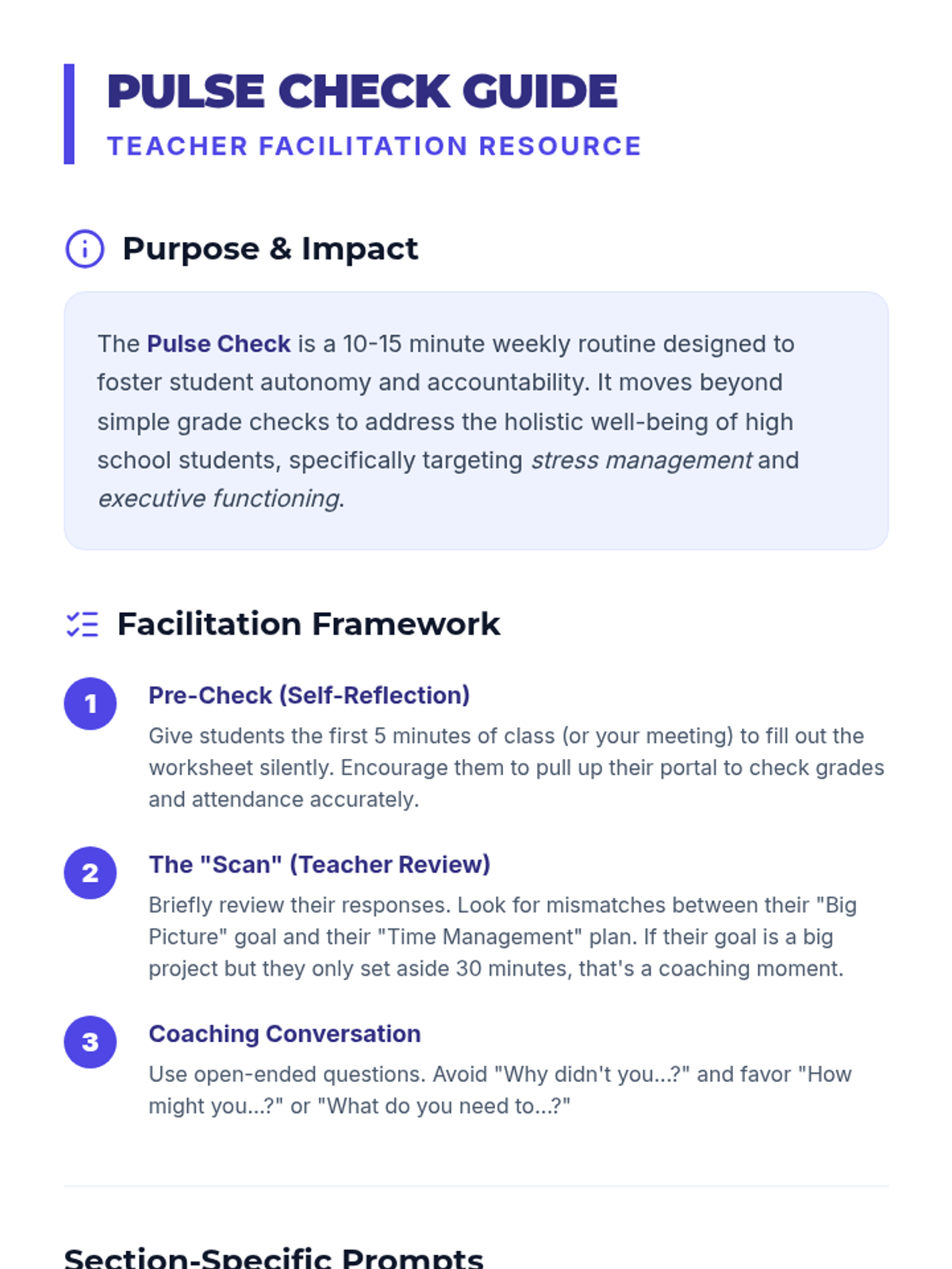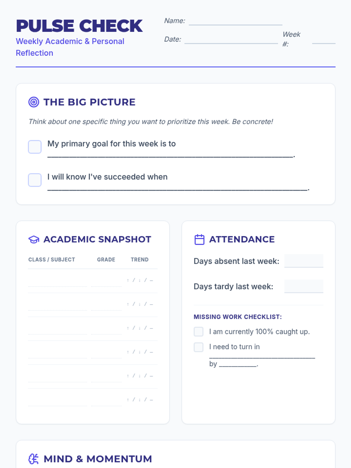 A weekly routine for high school students to monitor their academic progress, attendance, and mental well-being through structured reflection and goal setting.