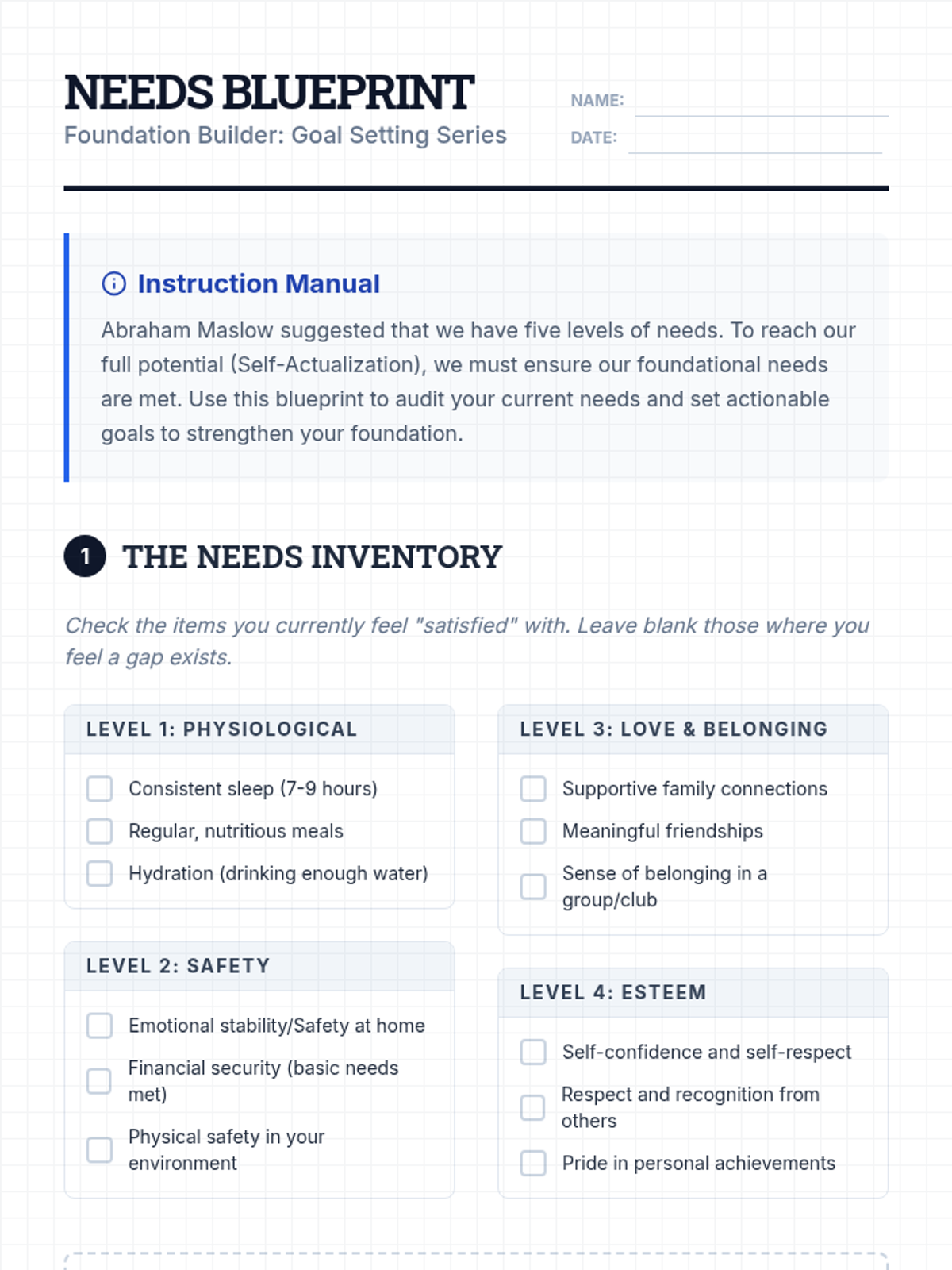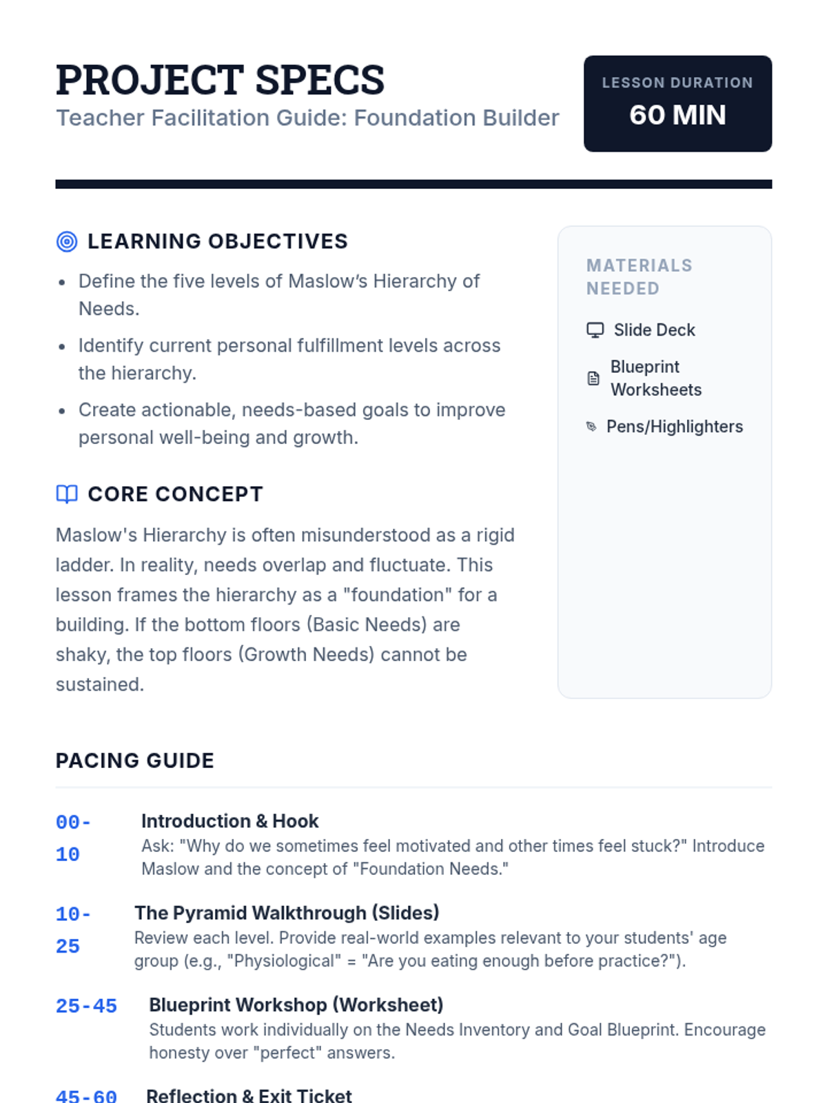 This lesson introduces Maslow's Hierarchy of Needs as a framework for understanding human motivation and setting holistic personal goals. Students will identify their current needs across the hierarchy and develop actionable goals to reach self-actualization.