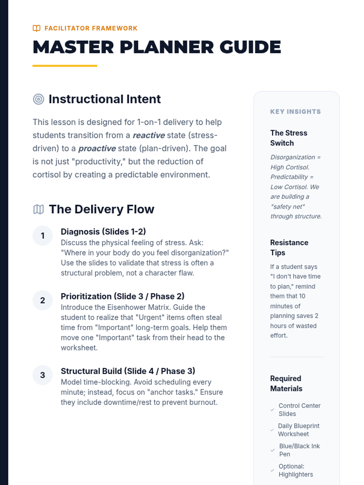 A comprehensive lesson focused on teaching students how to manage stress through effective time management and organization techniques, featuring prioritization tools and planning strategies.