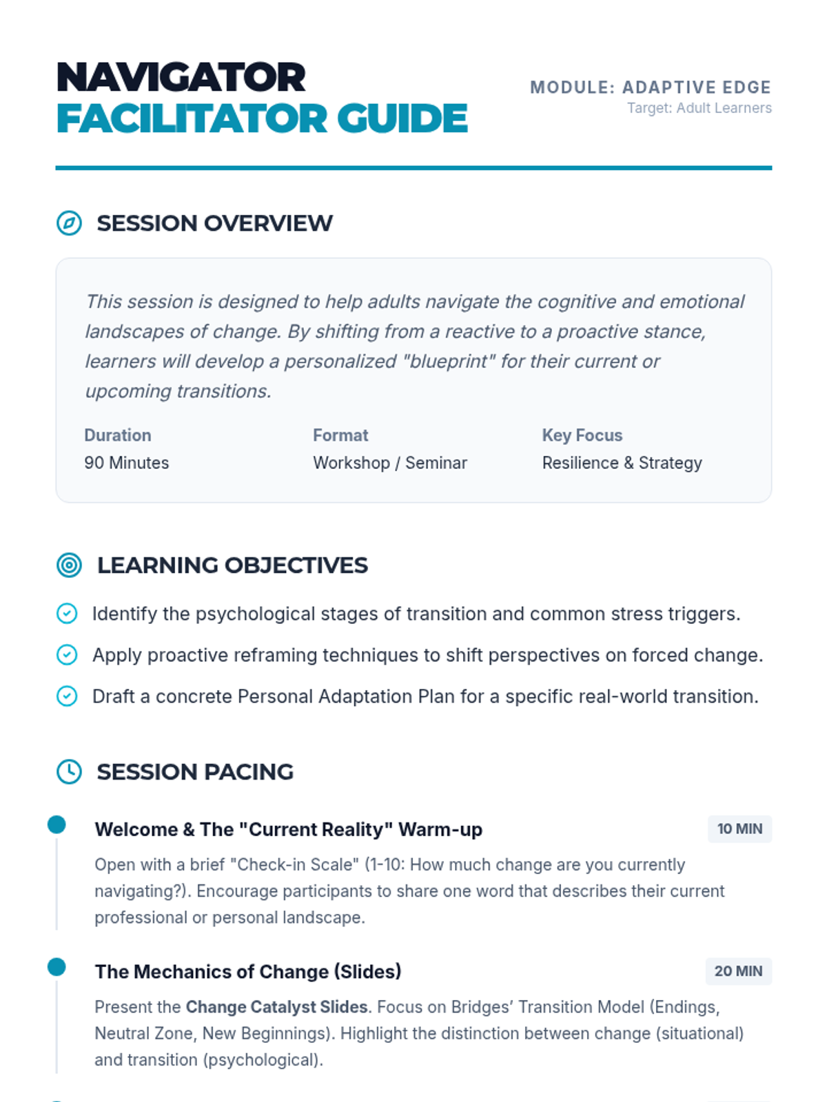 A comprehensive module for adult learners to master personal and professional transitions by building resilience and proactive adaptation strategies.