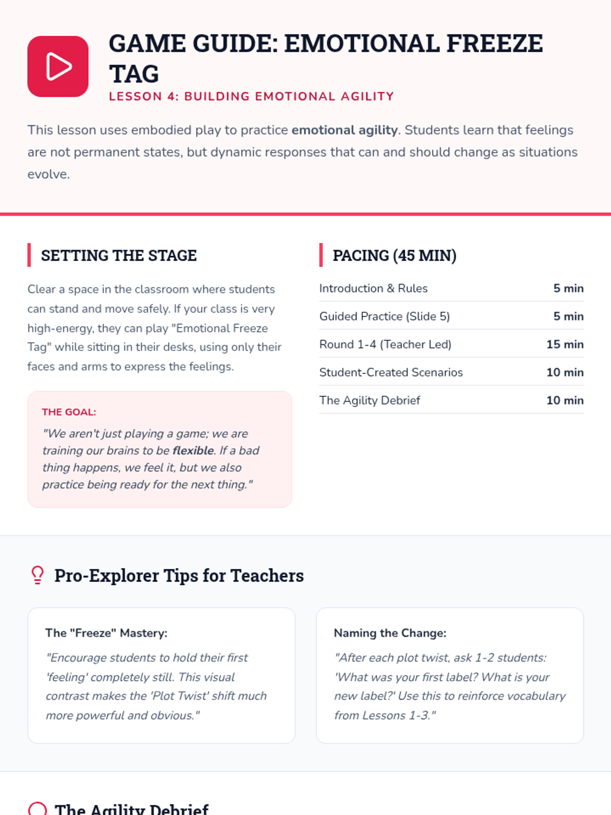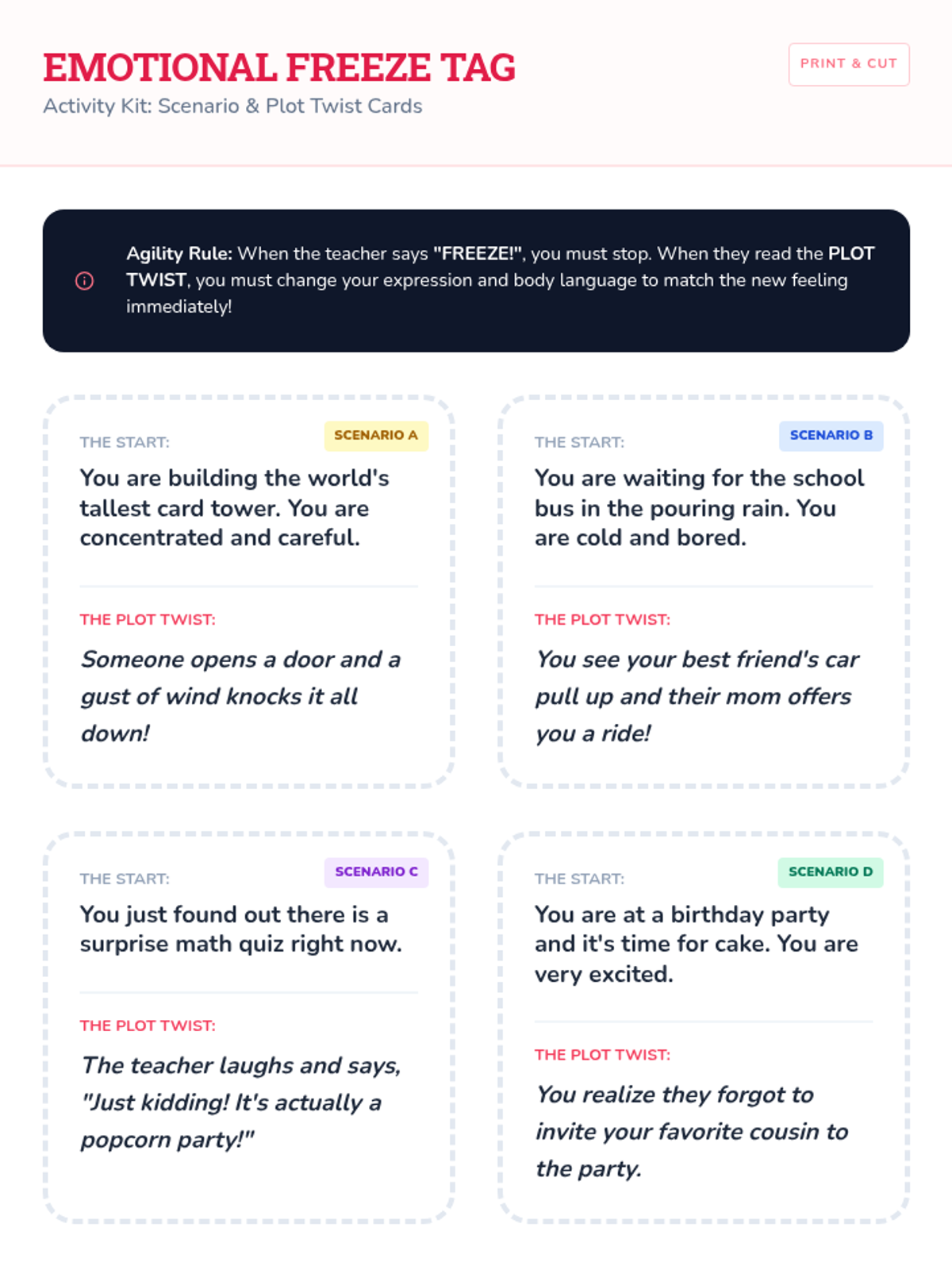 A high-energy game-based lesson where students practice emotional agility by rapidly shifting labels to match changing scenarios.