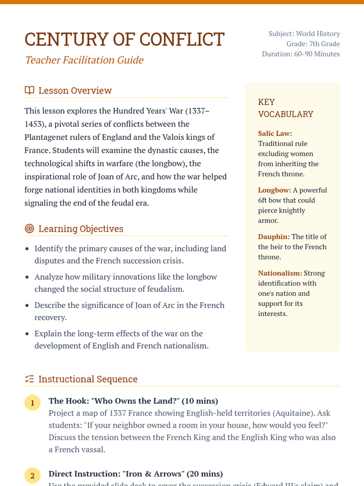 A comprehensive look at the causes, key figures like Joan of Arc, and the lasting impact of the Hundred Years' War on England and France. Students will explore how this conflict transitioned Europe from the Middle Ages toward the early modern era.