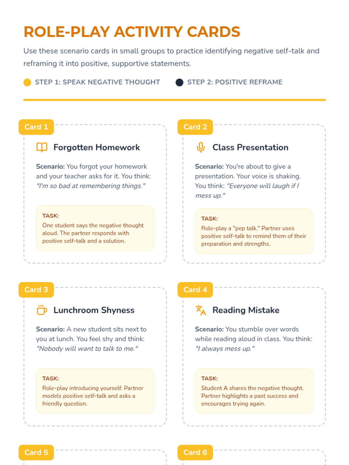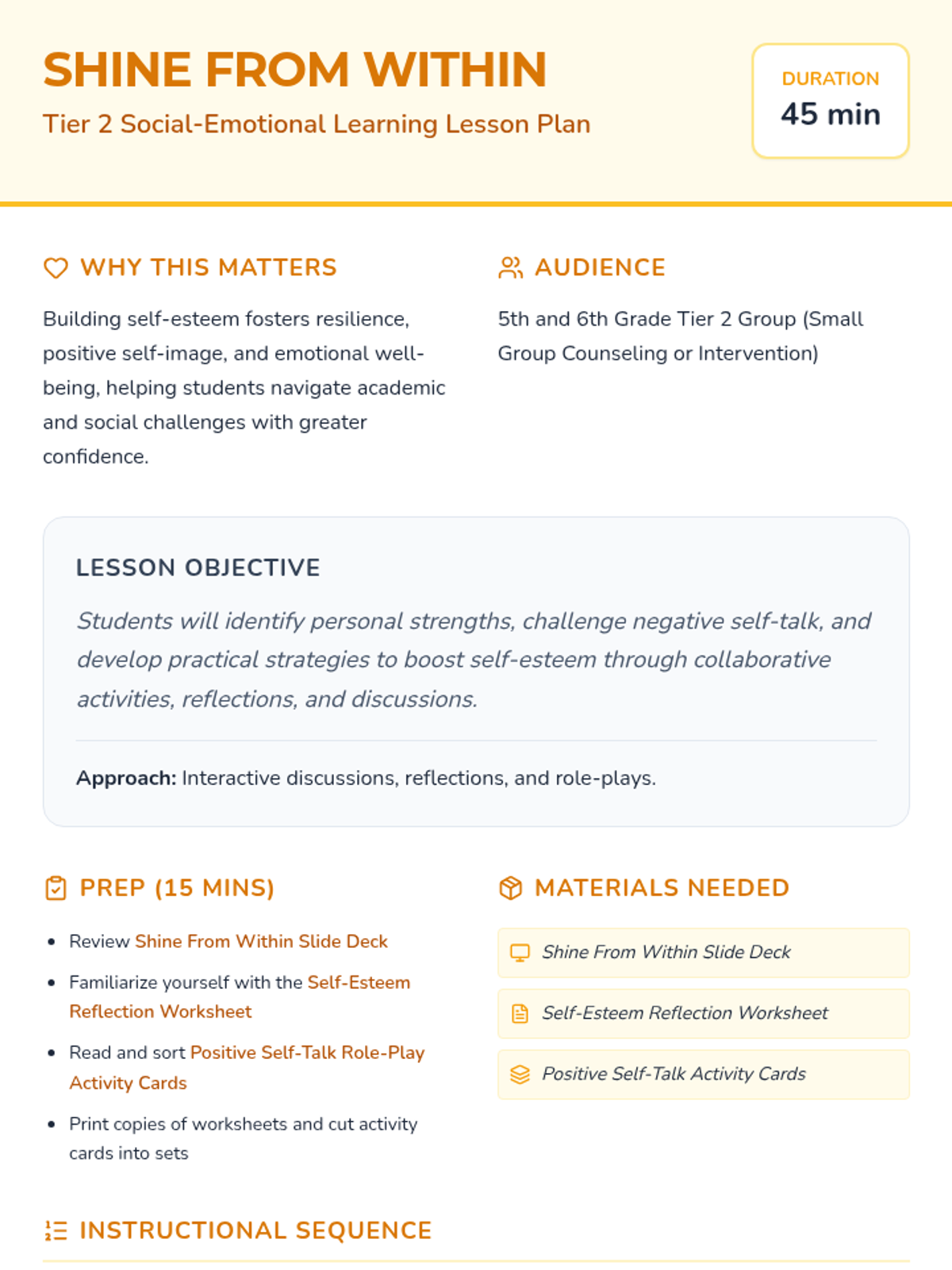 A 45-minute Tier 2 group lesson for 5th and 6th graders to build self-esteem, identify strengths, and challenge negative self-talk using interactive discussions and role-play.