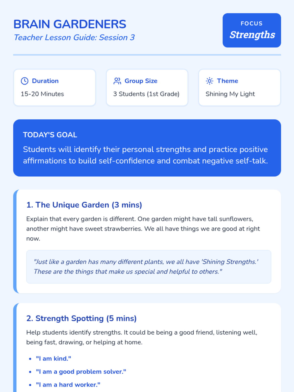 A 30-minute introduction to self-esteem for 1st graders, focusing on understanding what it means to feel good about yourself and identifying personal strengths through the theme of 'Mirror Magic'.