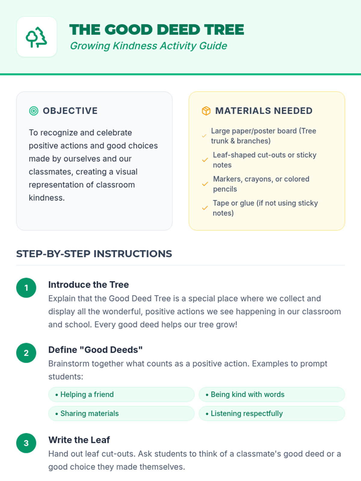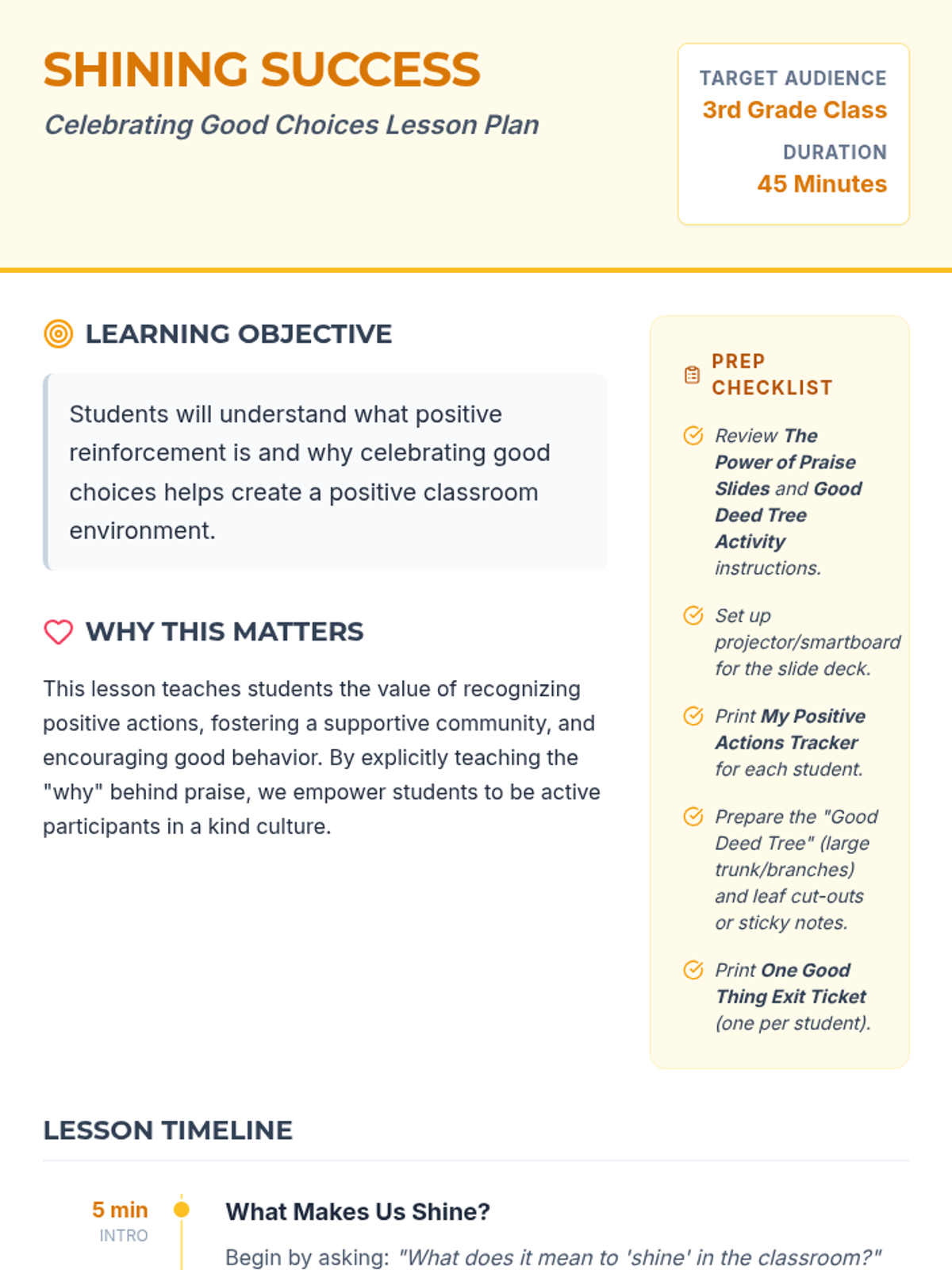A 45-minute lesson for 3rd grade that explores the importance of positive reinforcement and celebrating successes to build a supportive classroom culture. Students learn about praise, track positive actions, and contribute to a 'Good Deed Tree.'
