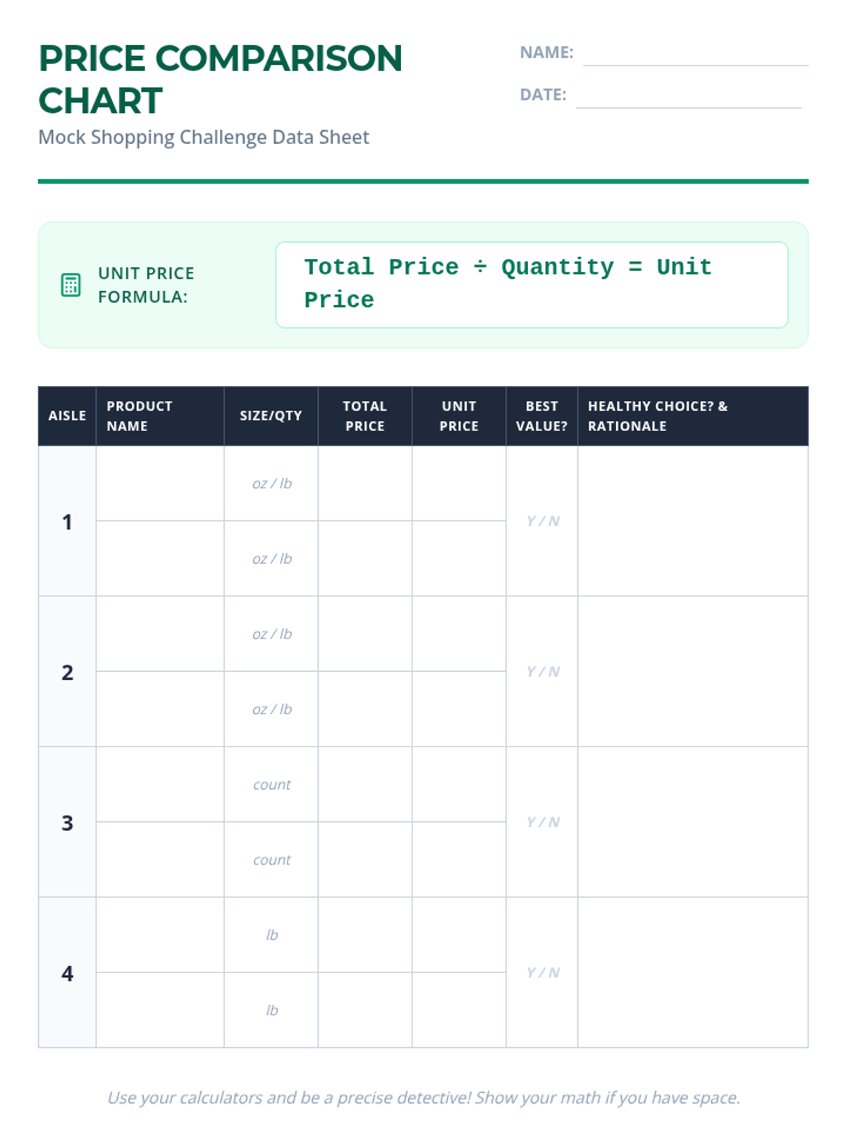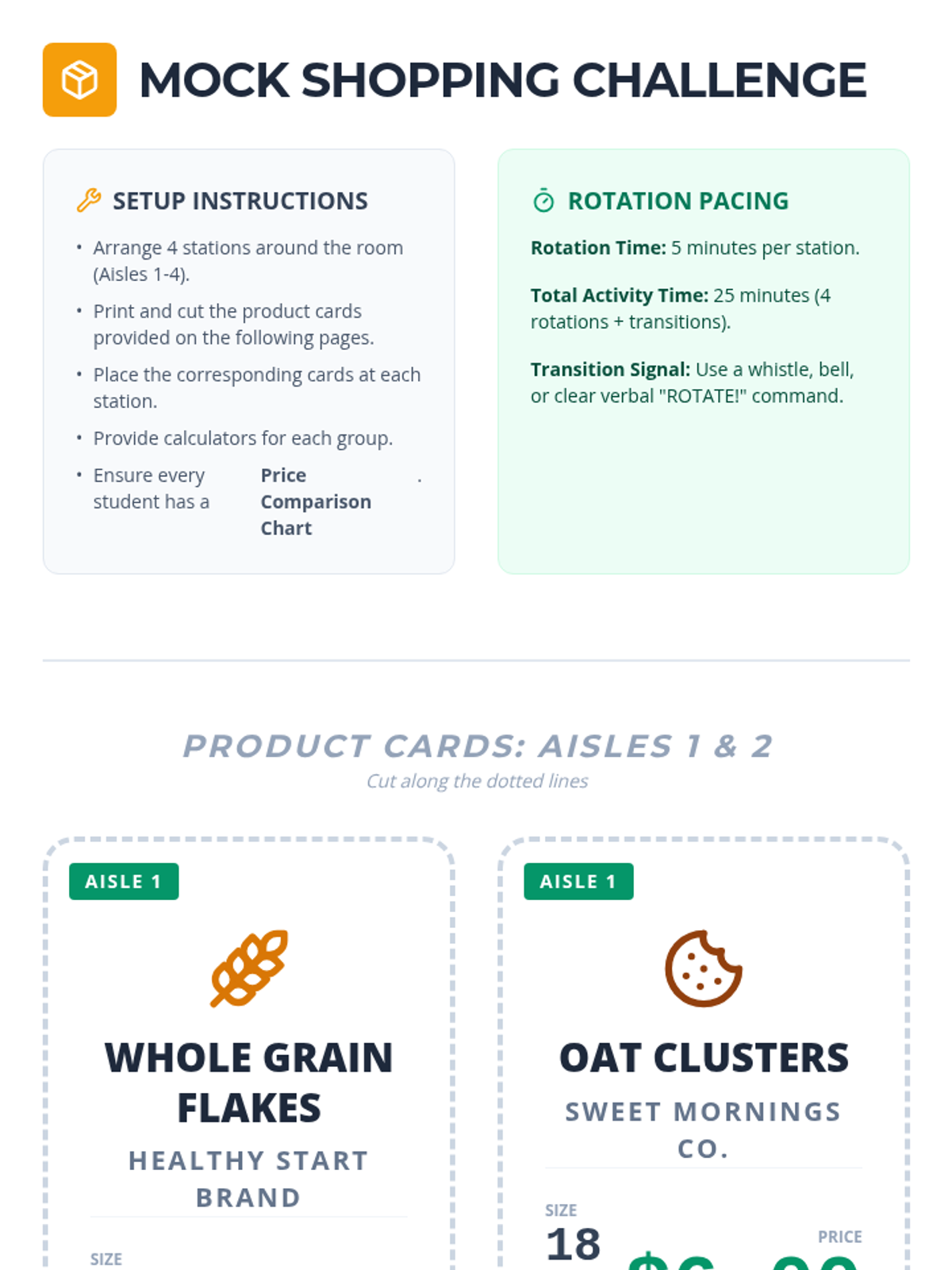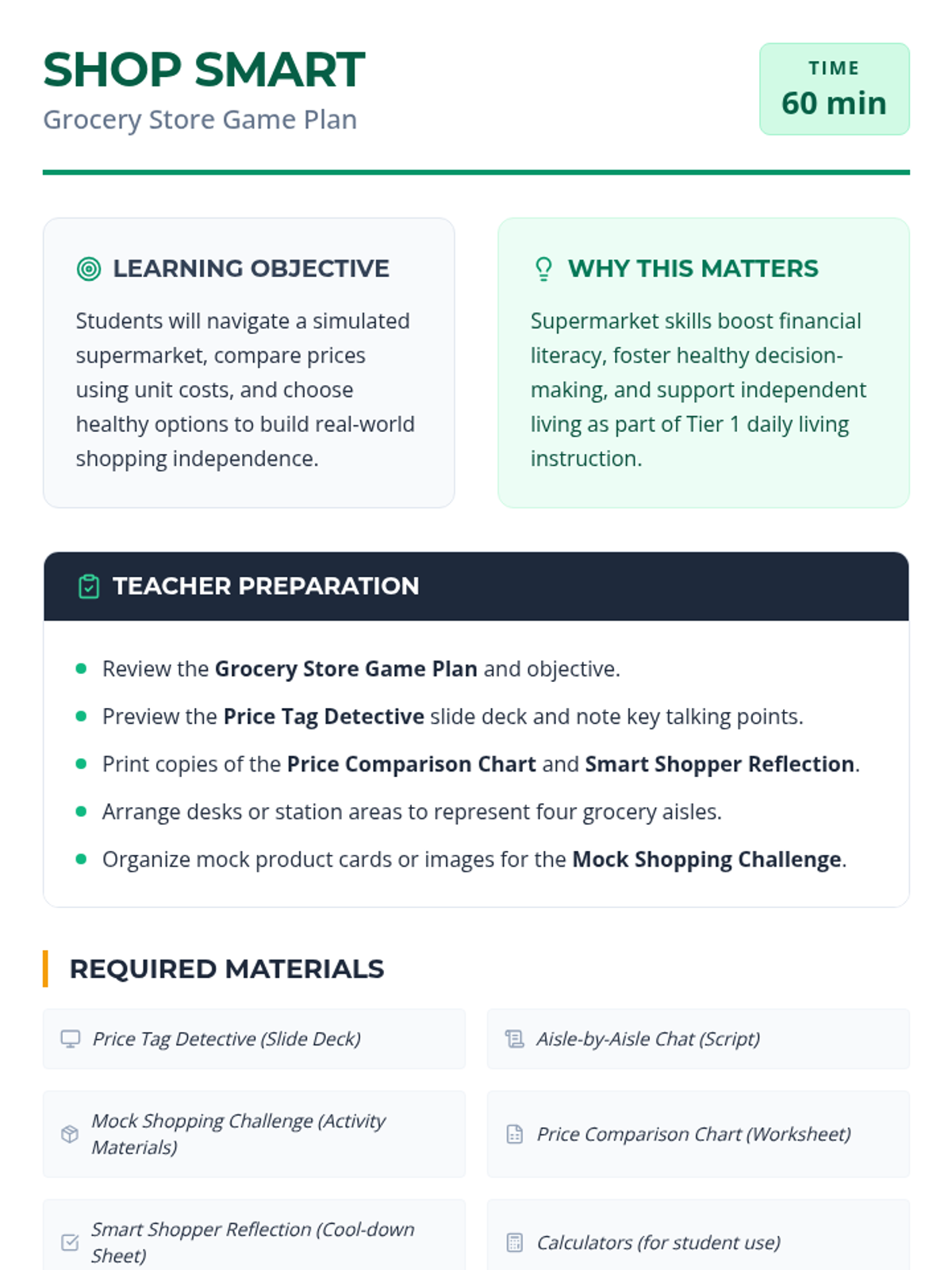A comprehensive 60-minute lesson for 9th graders focusing on supermarket navigation, price comparison (unit pricing), and making healthy, budget-conscious choices. Students engage in a slide-based tutorial followed by a hands-on mock shopping simulation.