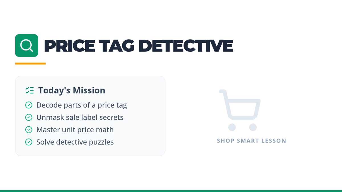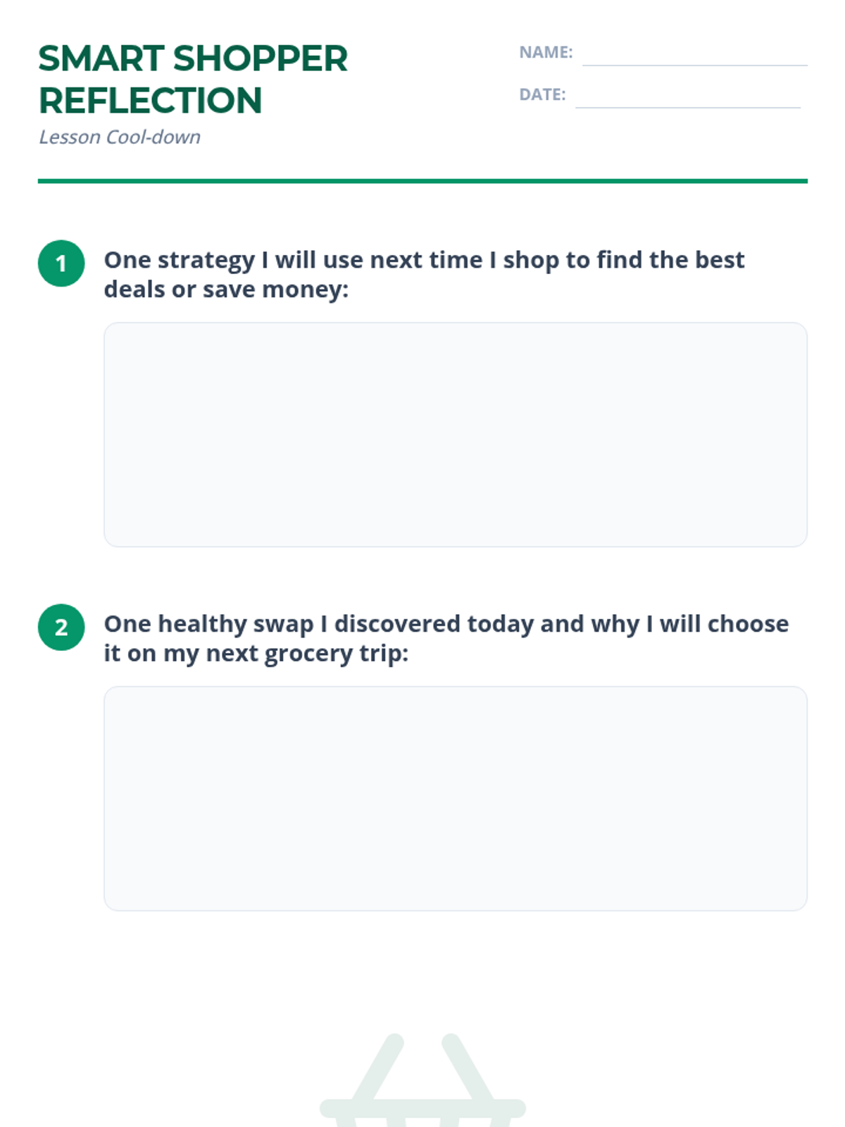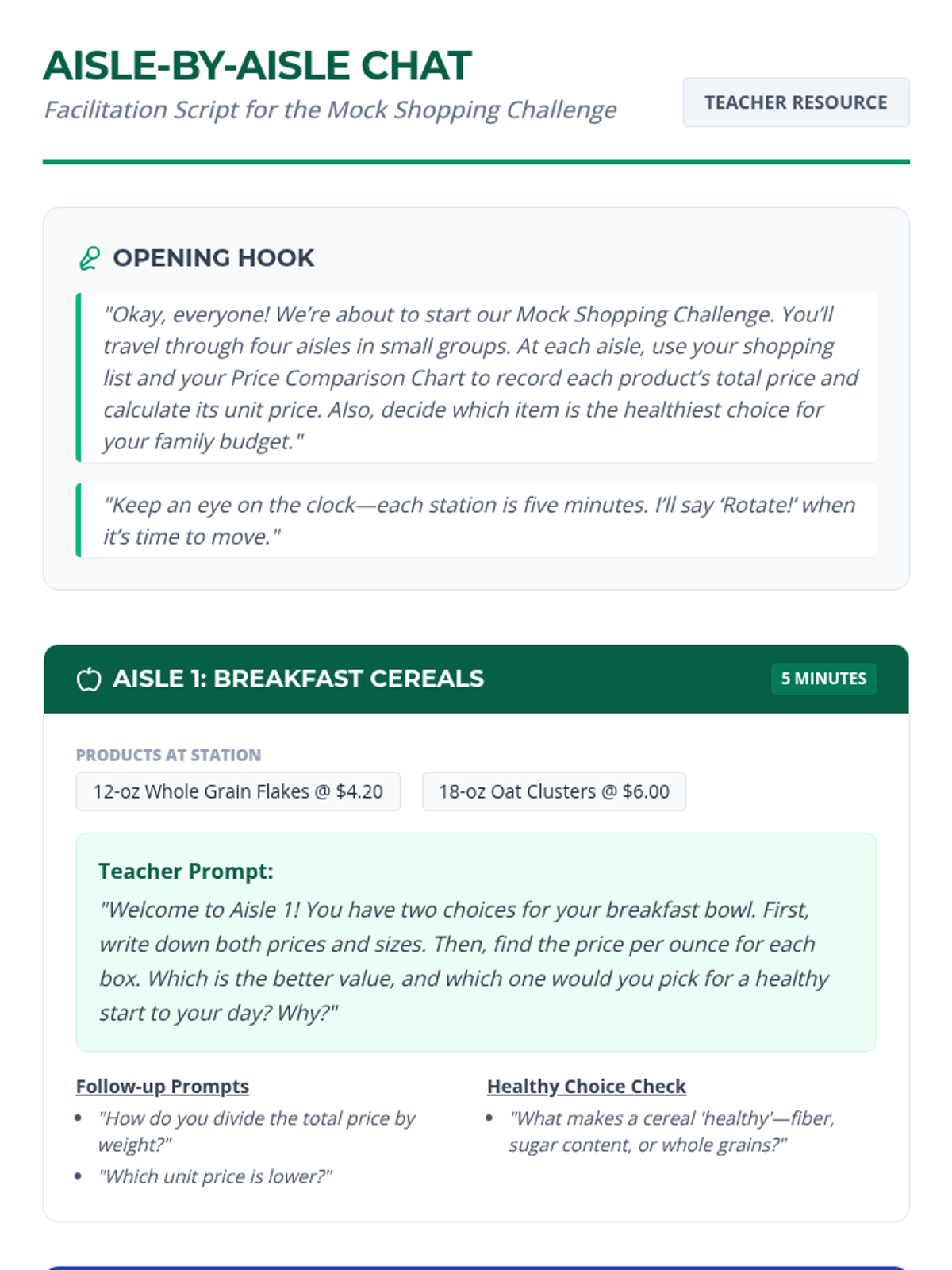 A comprehensive 60-minute lesson for 9th graders focusing on supermarket navigation, price comparison (unit pricing), and making healthy, budget-conscious choices. Students engage in a slide-based tutorial followed by a hands-on mock shopping simulation.