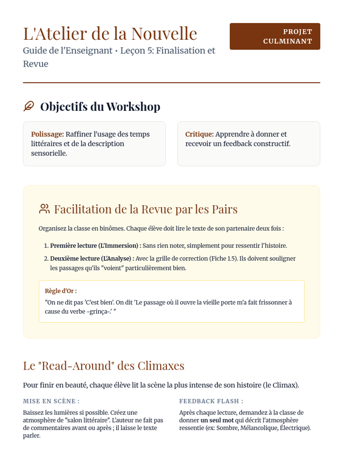 Students draft and refine their short stories, focusing on integrating the literary tenses and descriptive techniques learned. Peer reviews focus on pacing and imagery.
