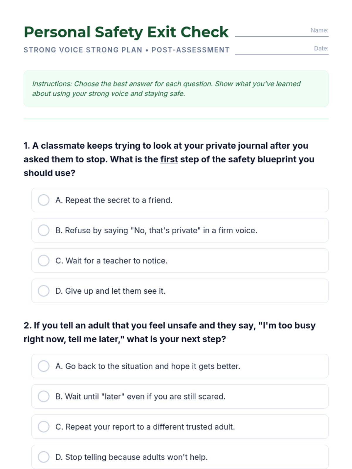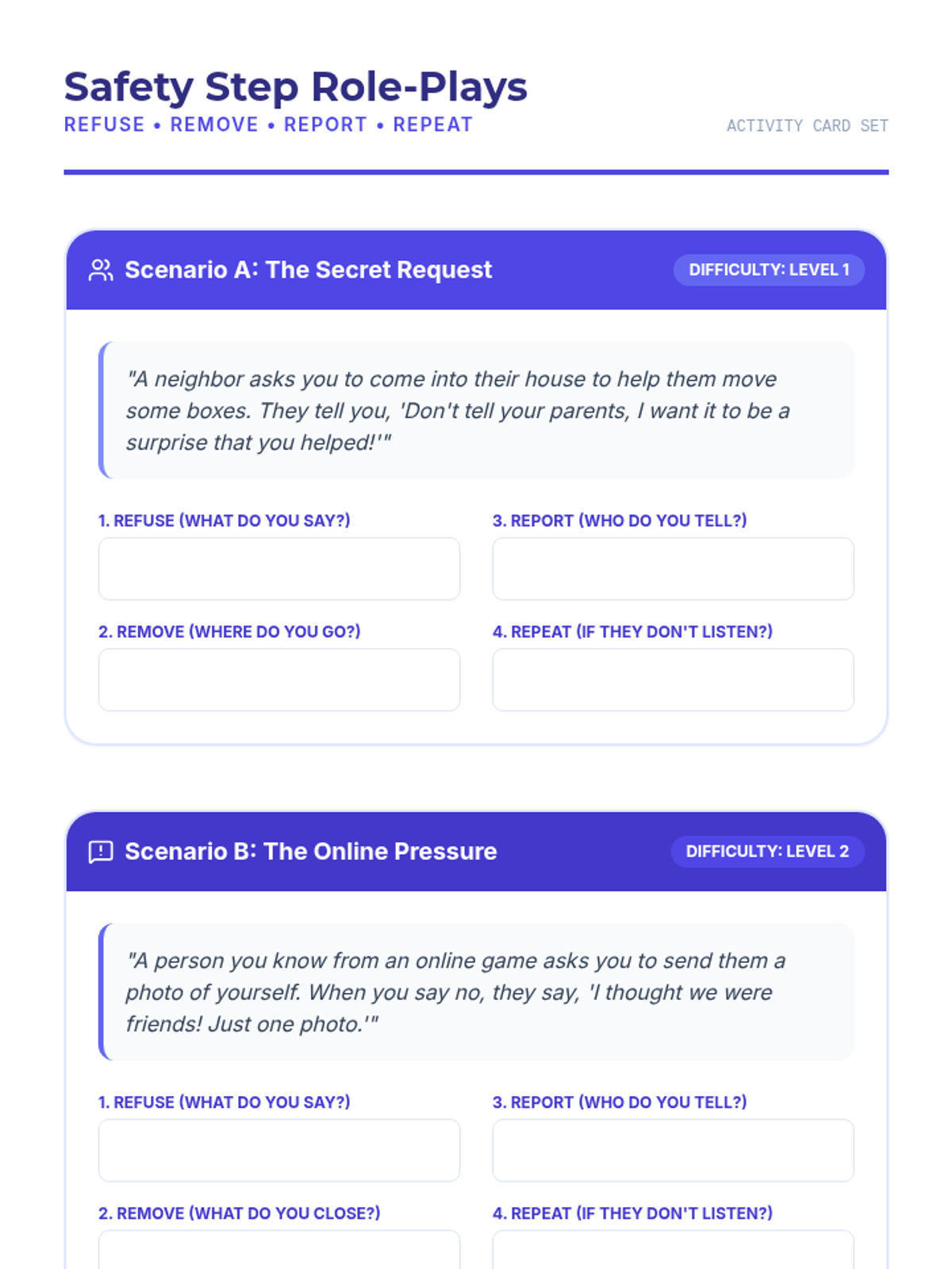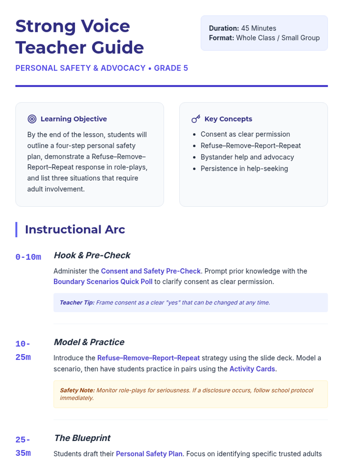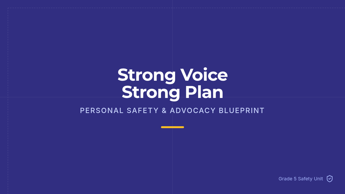 A comprehensive 5th-grade lesson on personal safety, teaching students how to set boundaries using the Refuse-Remove-Report-Repeat strategy and create a personalized safety plan. Students practice self-advocacy through role-plays and identify when and how to seek help from trusted adults.