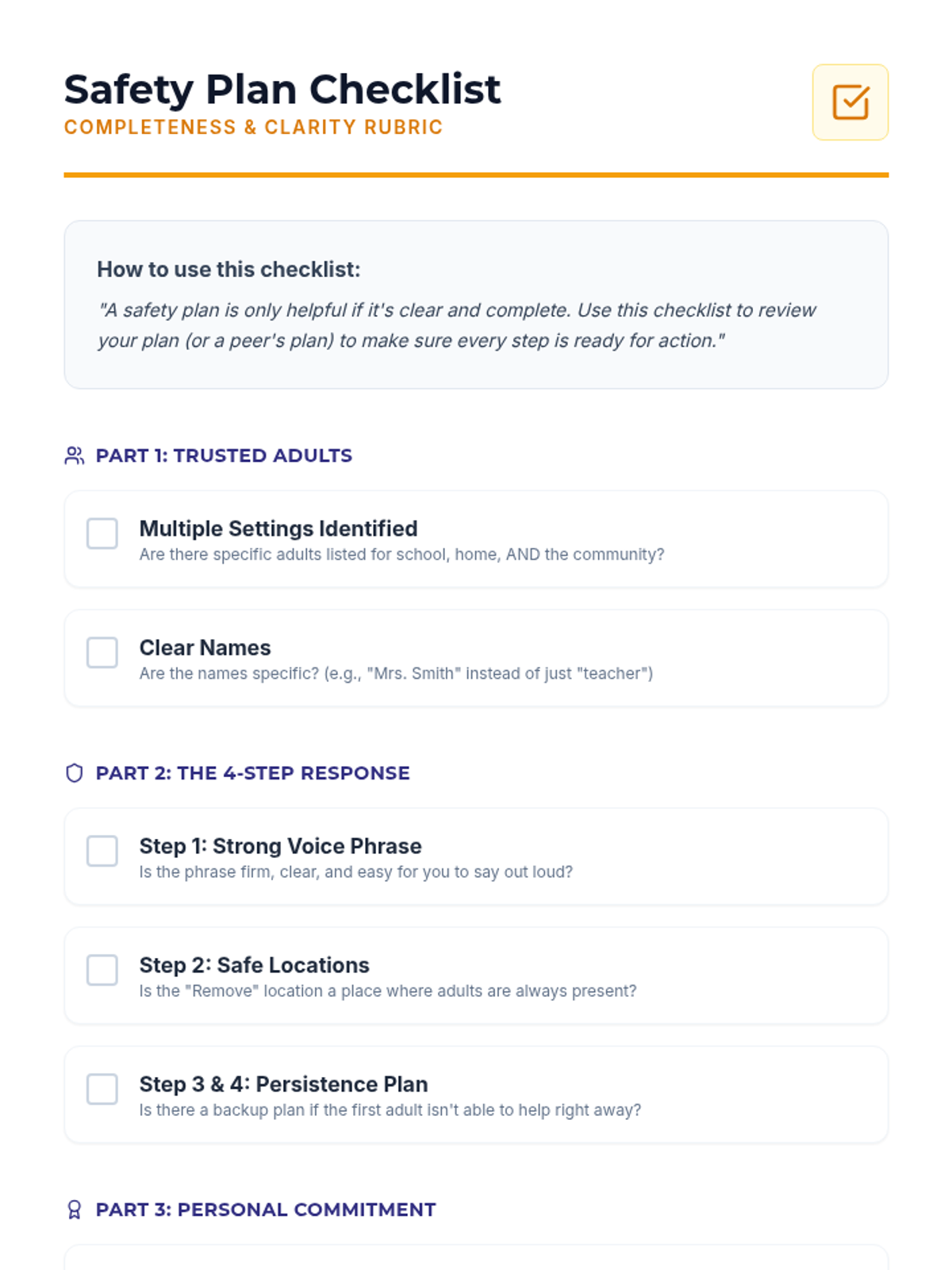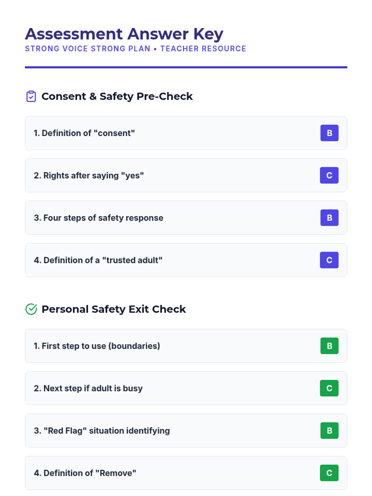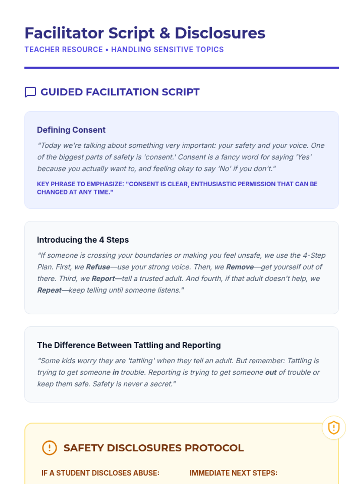 A comprehensive 5th-grade lesson on personal safety, teaching students how to set boundaries using the Refuse-Remove-Report-Repeat strategy and create a personalized safety plan. Students practice self-advocacy through role-plays and identify when and how to seek help from trusted adults.