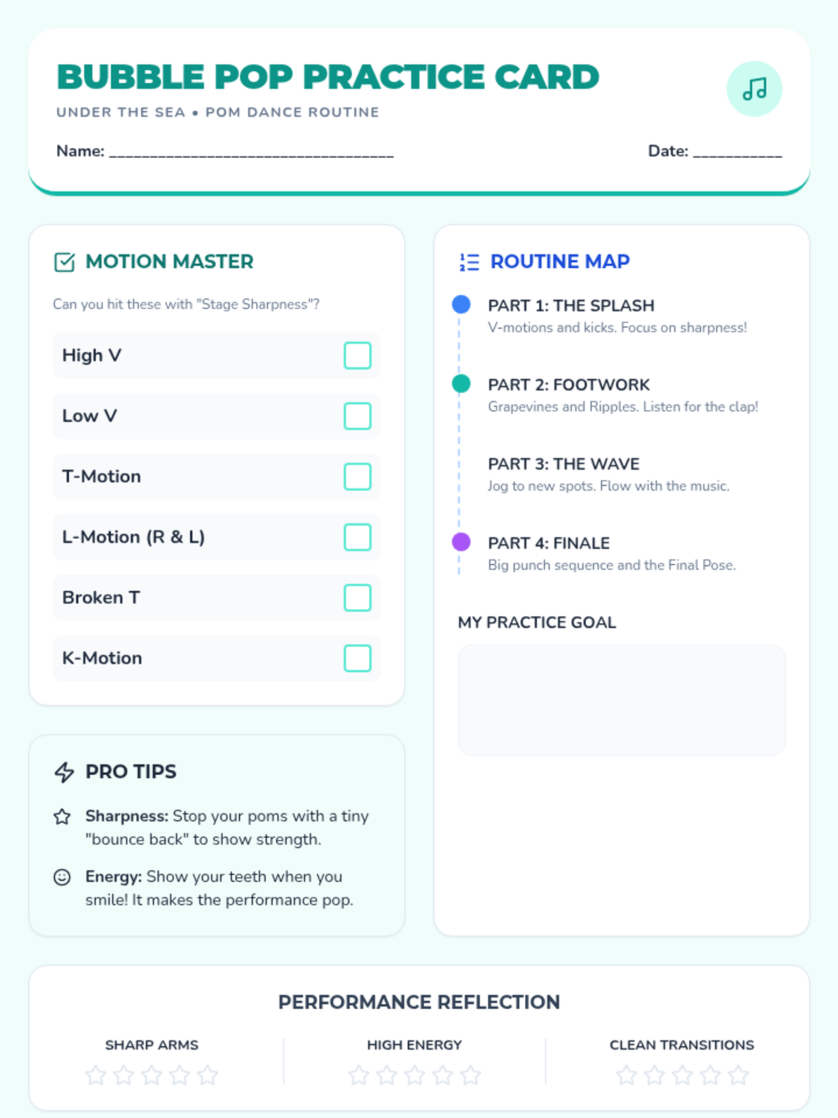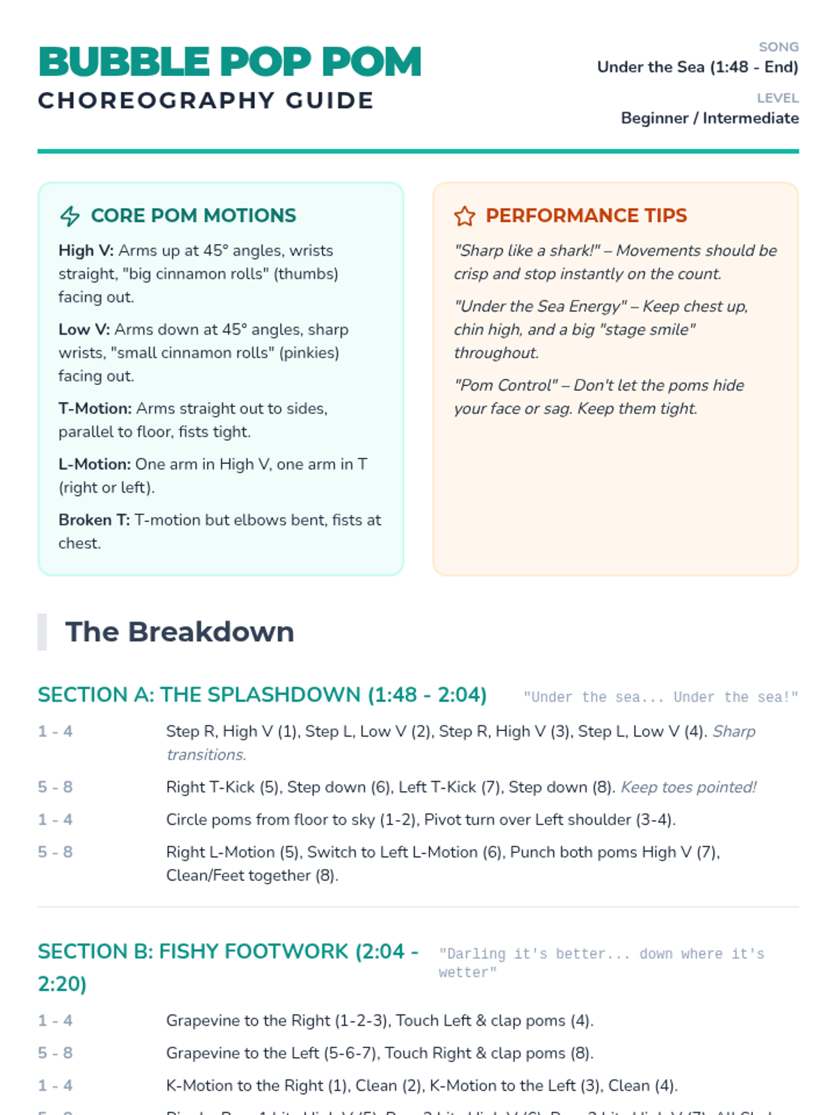 A high-energy pom dance lesson for beginner to intermediate students, featuring choreography to 'Under the Sea' from The Little Mermaid. Focuses on sharp pom motions, formations, and performance energy.