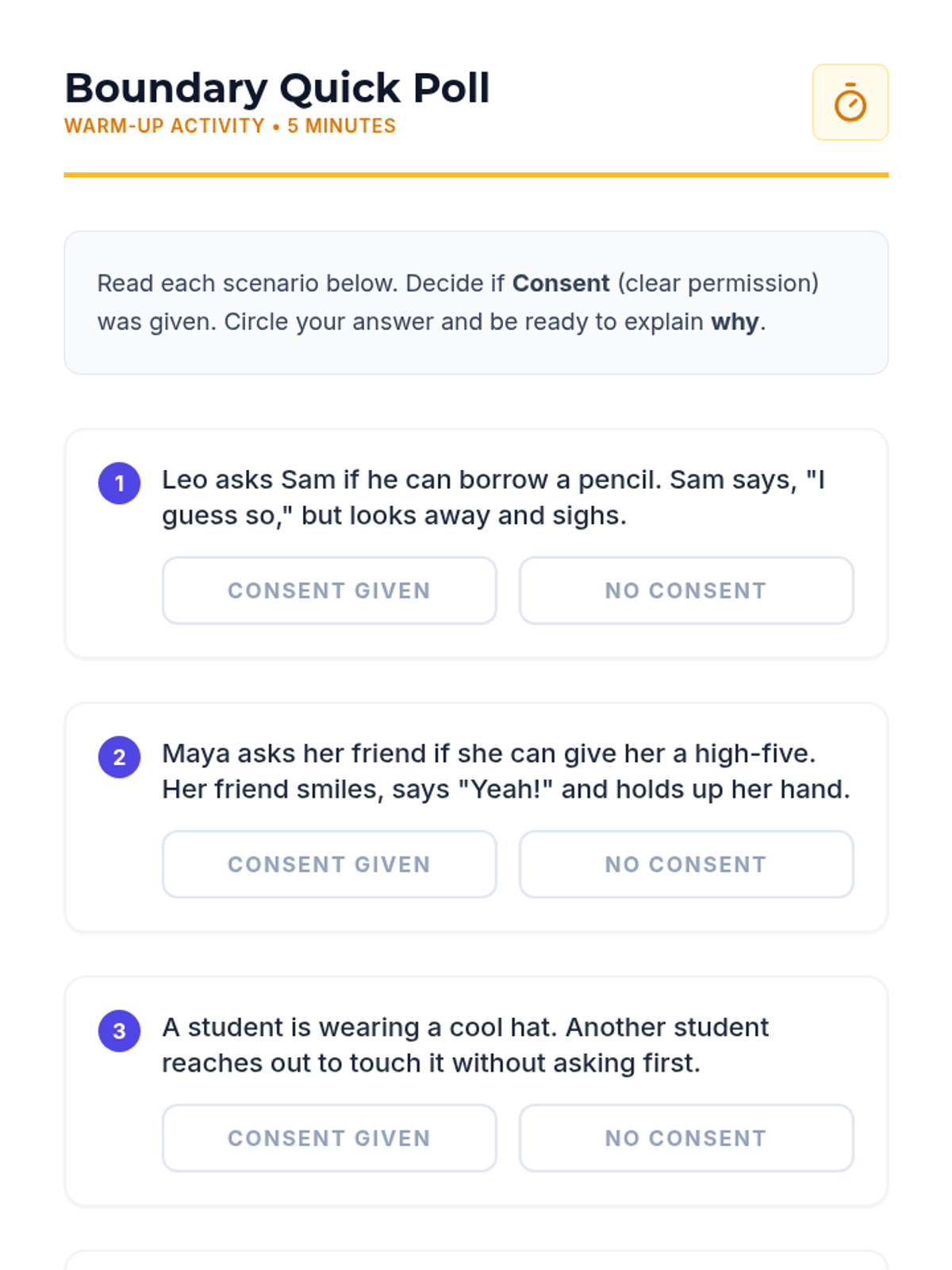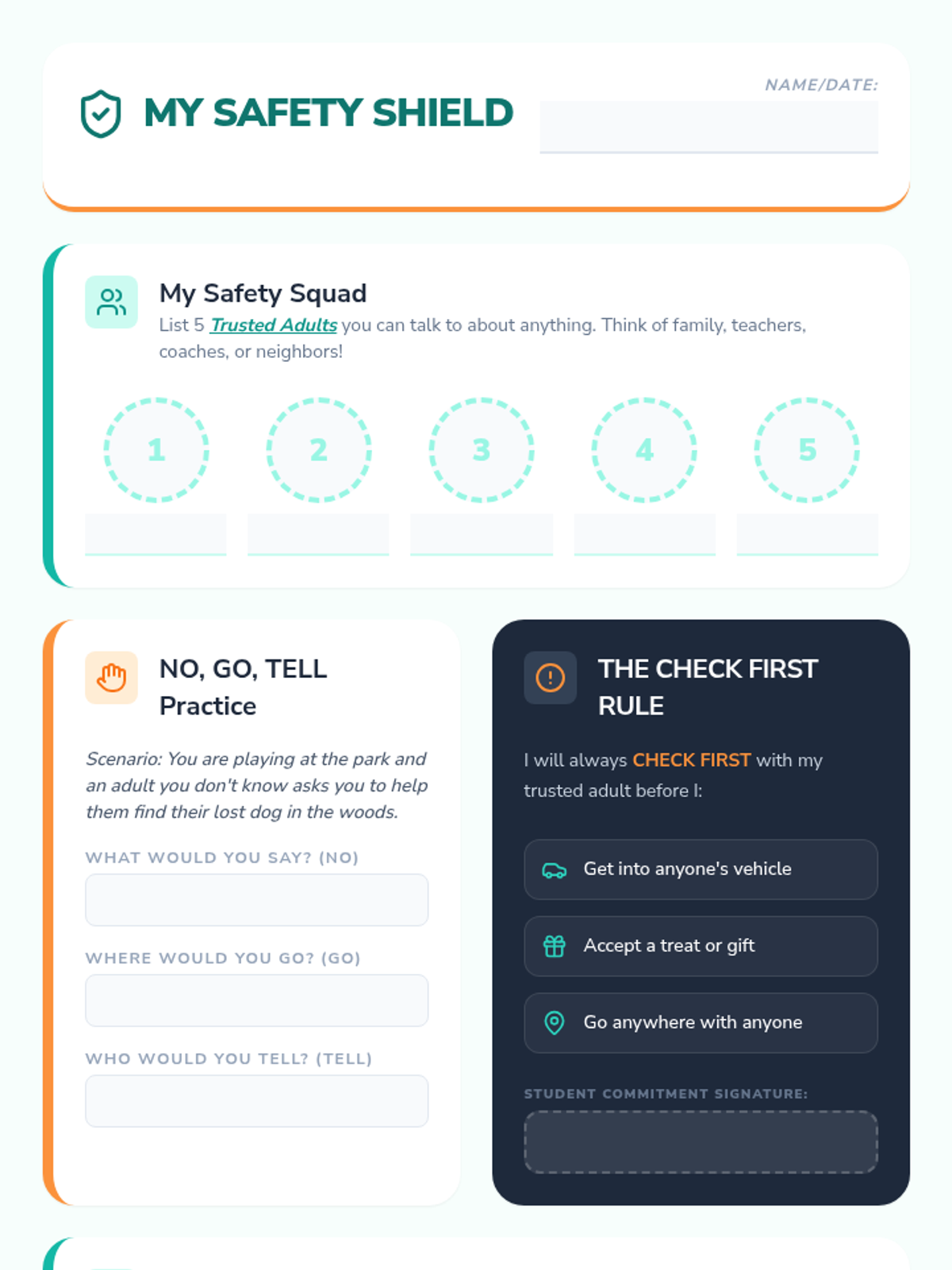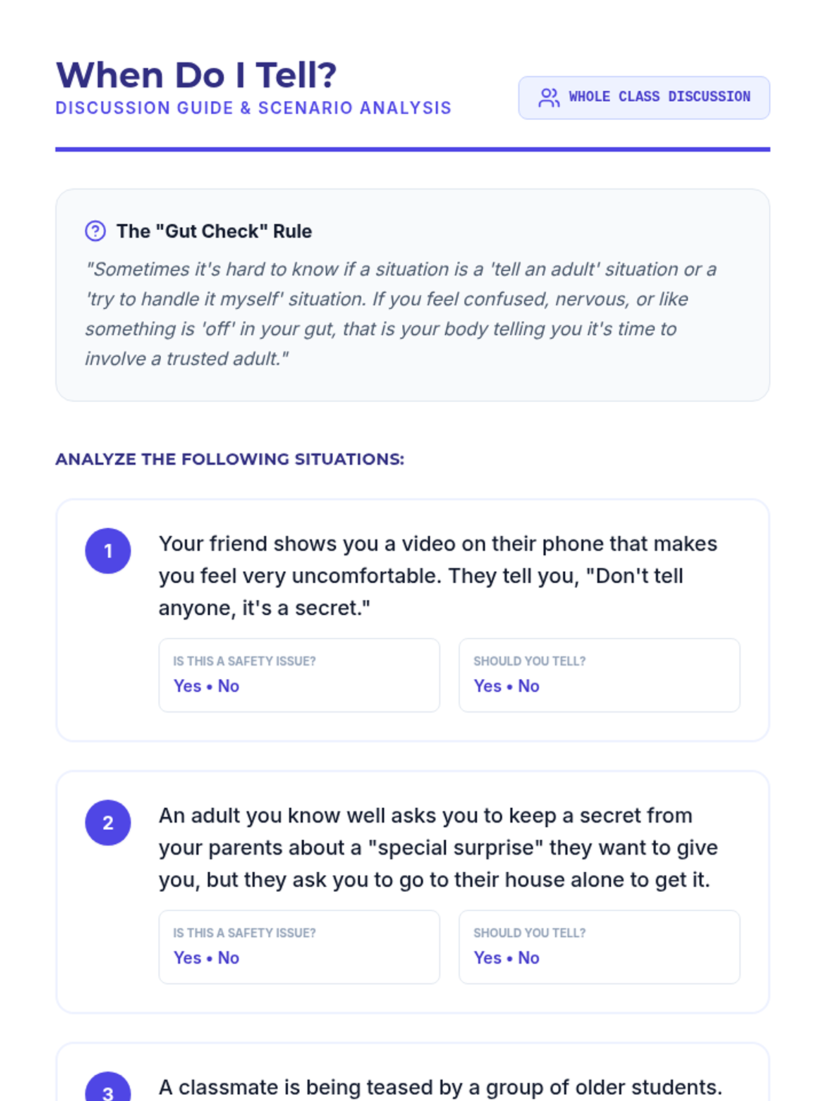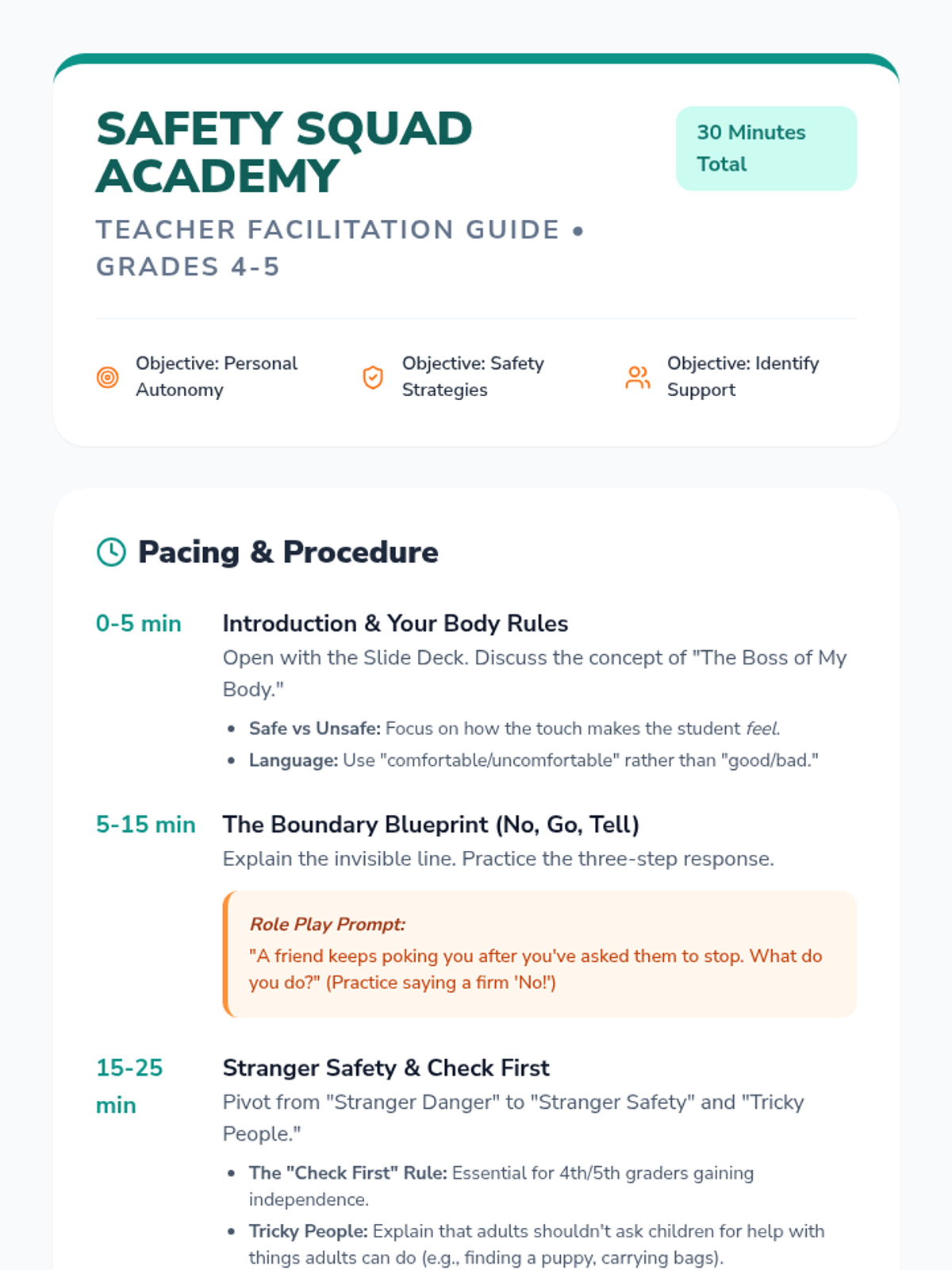 A 30-minute interactive lesson for 4th and 5th graders focusing on body autonomy, boundary setting, and practical safety strategies like 'Check First' and 'No, Go, Tell'.