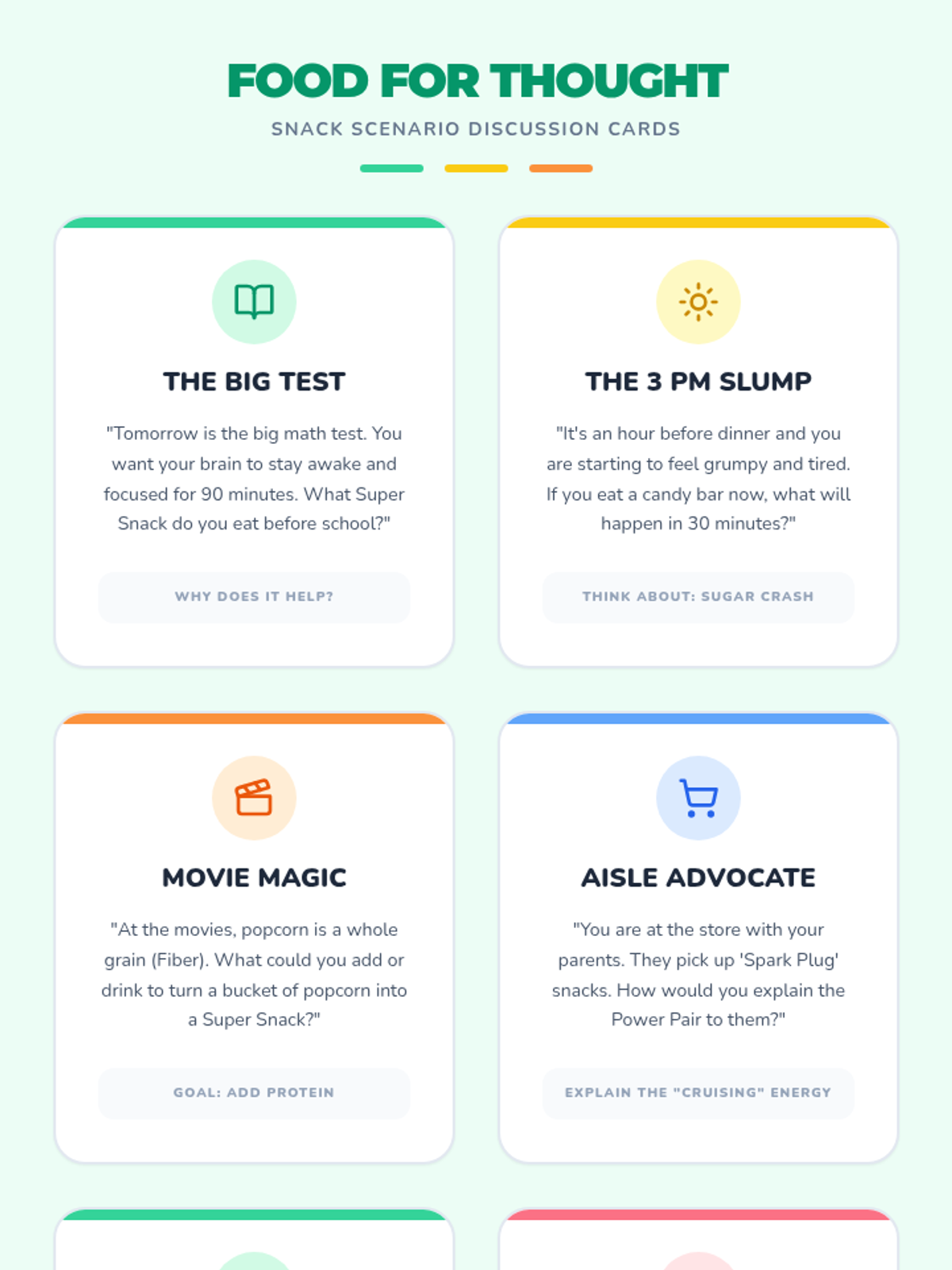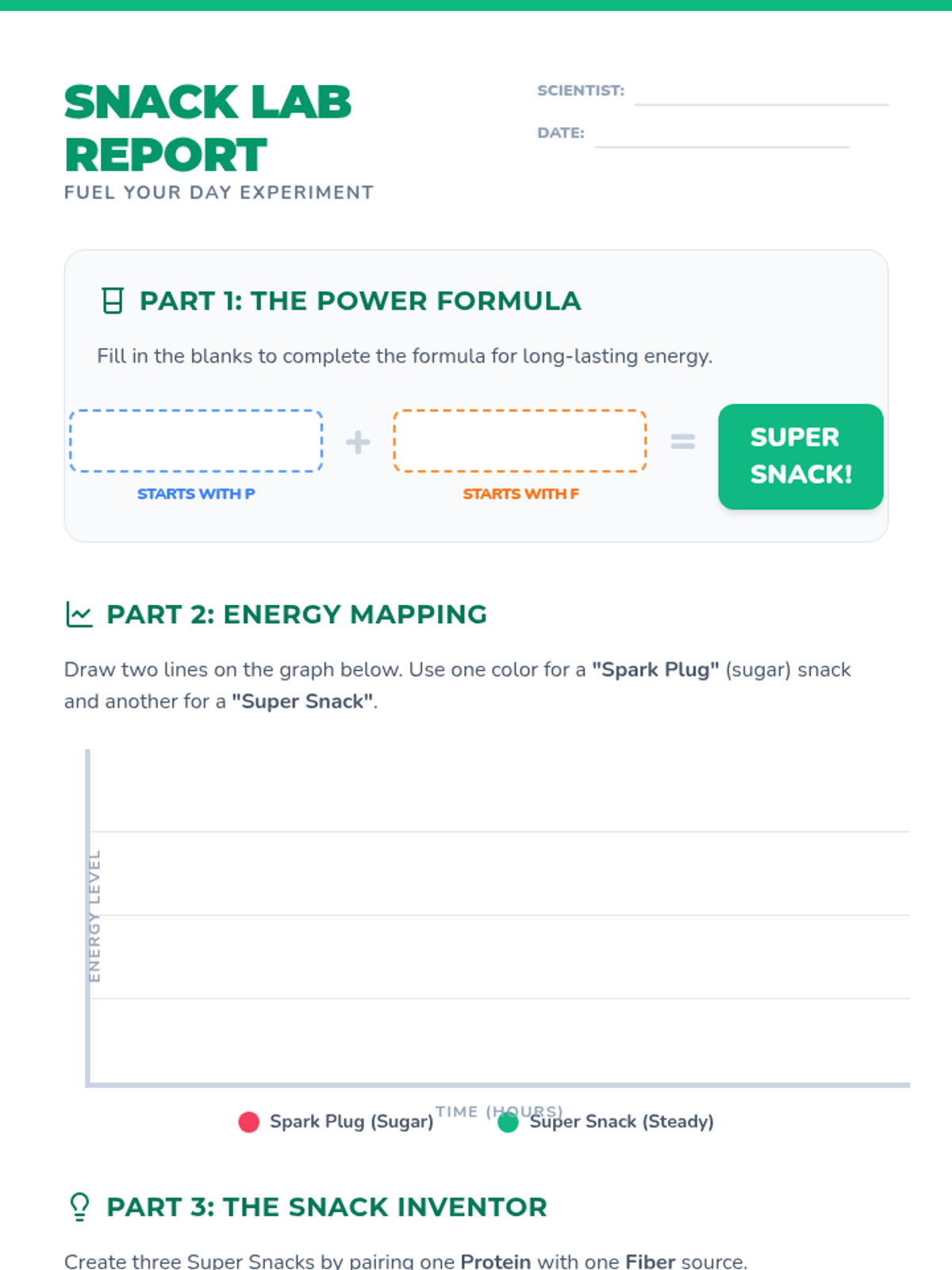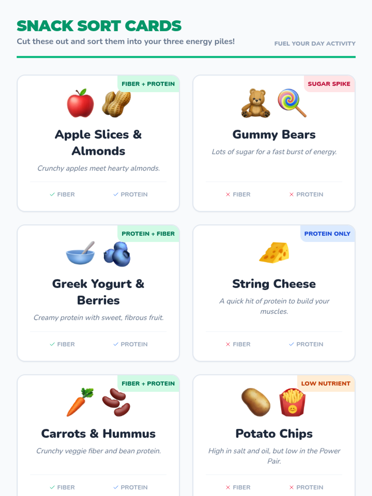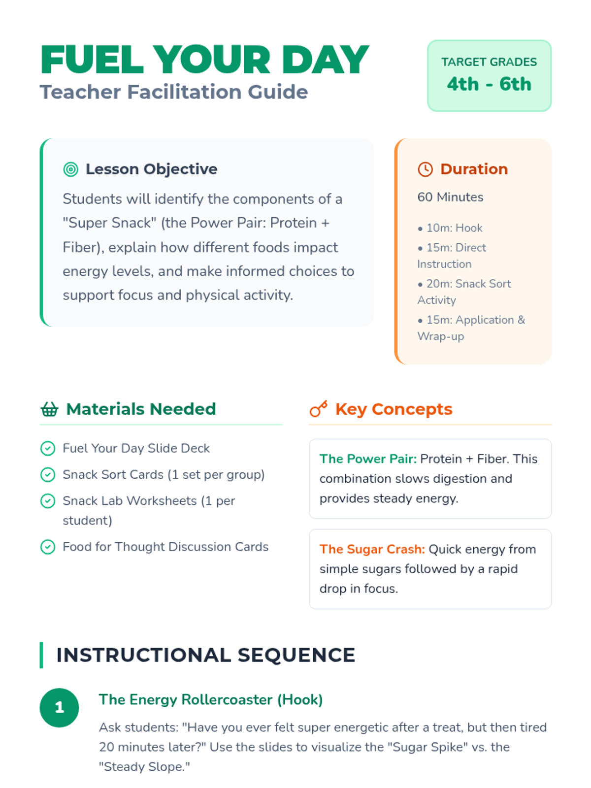 A comprehensive lesson for 4th-6th graders on making healthy snack choices to maintain energy and focus. Students will learn about the 'Power Pair' of nutrients and practice making smart decisions through interactive sorting and real-world scenarios.