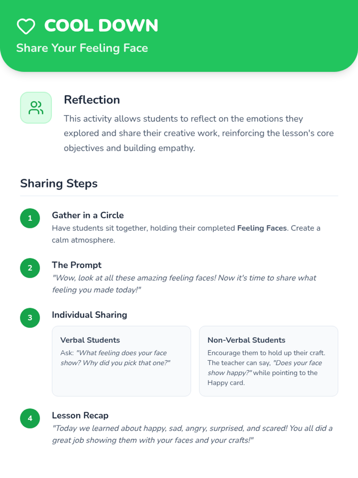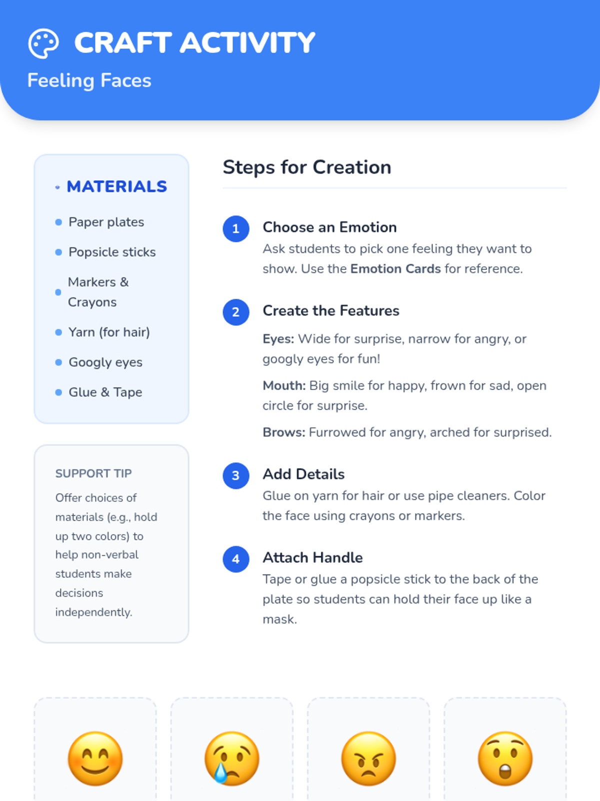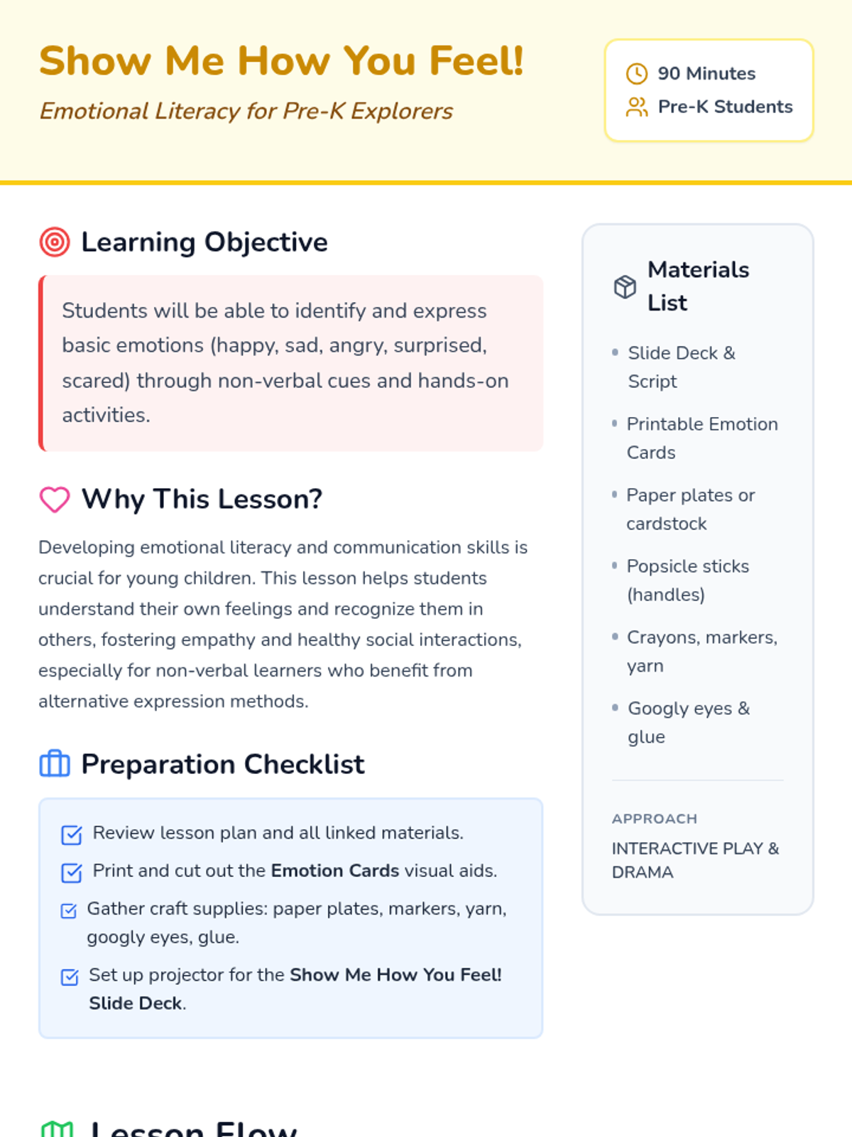 This lesson helps Pre-K students, including those who are non-verbal, explore and express emotions through hands-on activities, drama, and crafts. Students will learn to recognize and mimic basic facial expressions to better communicate their feelings.