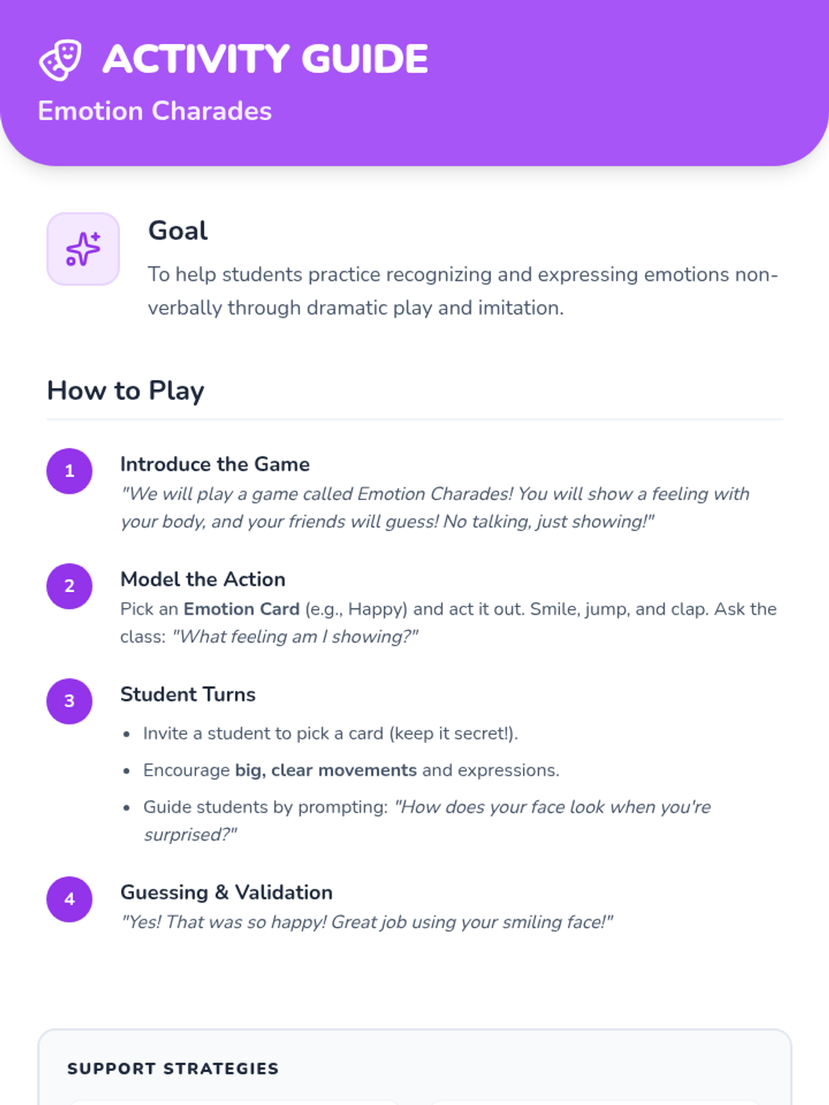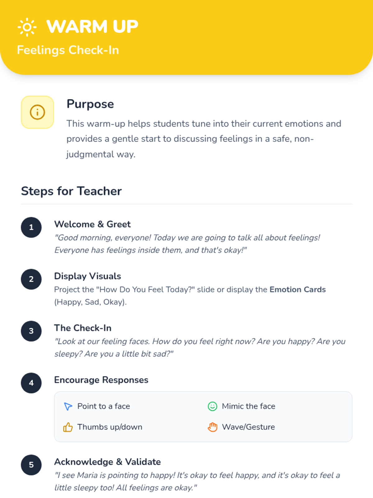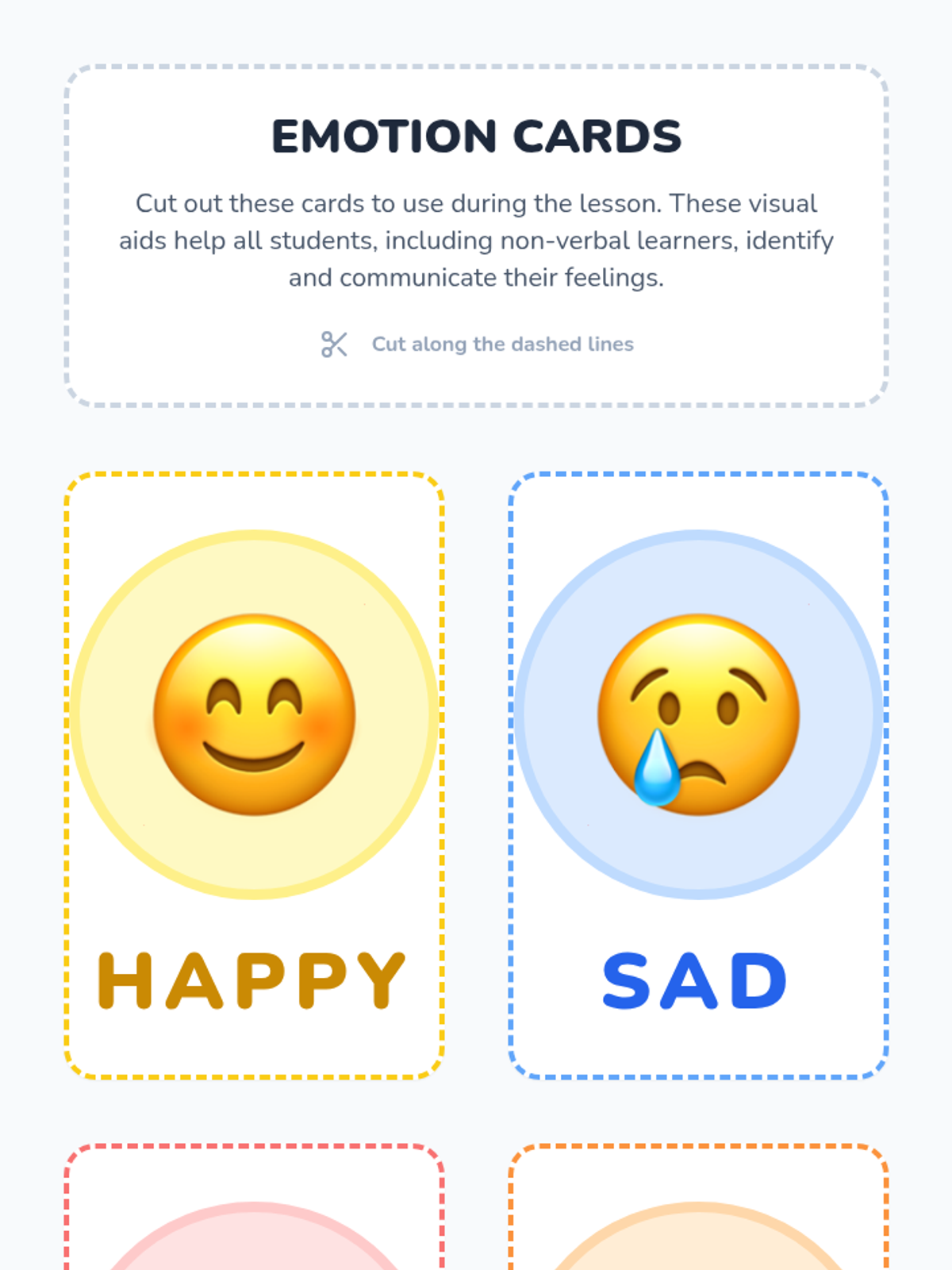 This lesson helps Pre-K students, including those who are non-verbal, explore and express emotions through hands-on activities, drama, and crafts. Students will learn to recognize and mimic basic facial expressions to better communicate their feelings.