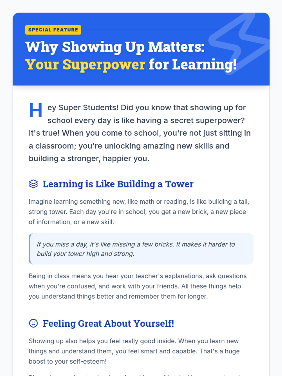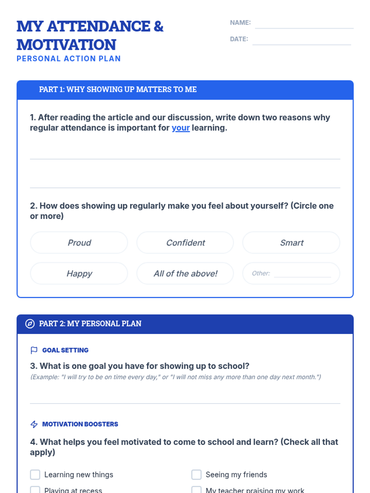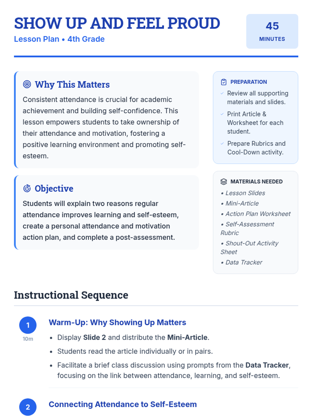 This lesson helps 4th-grade students understand the importance of regular attendance for academic success and self-esteem through reading, discussion, and personal action planning.