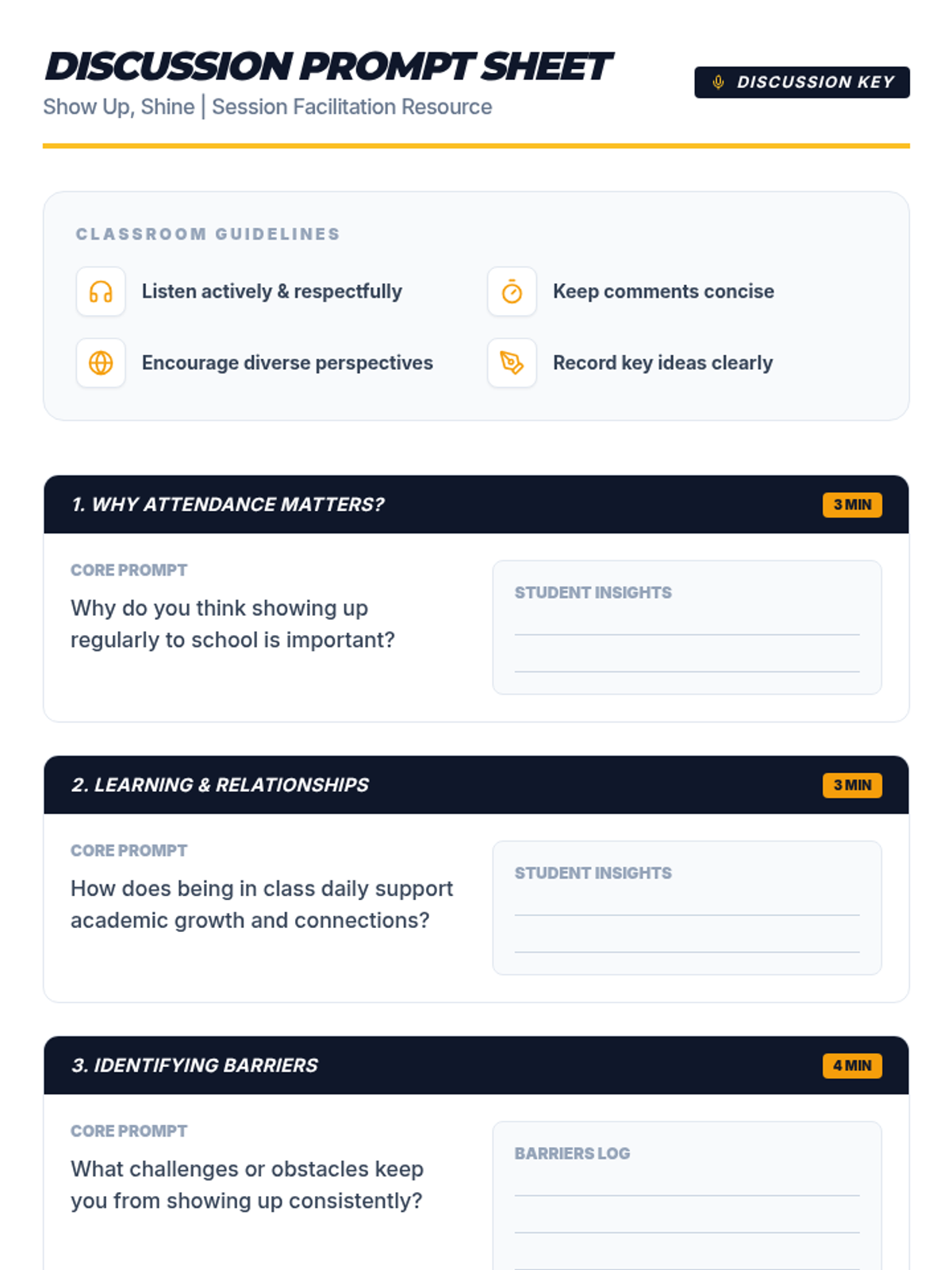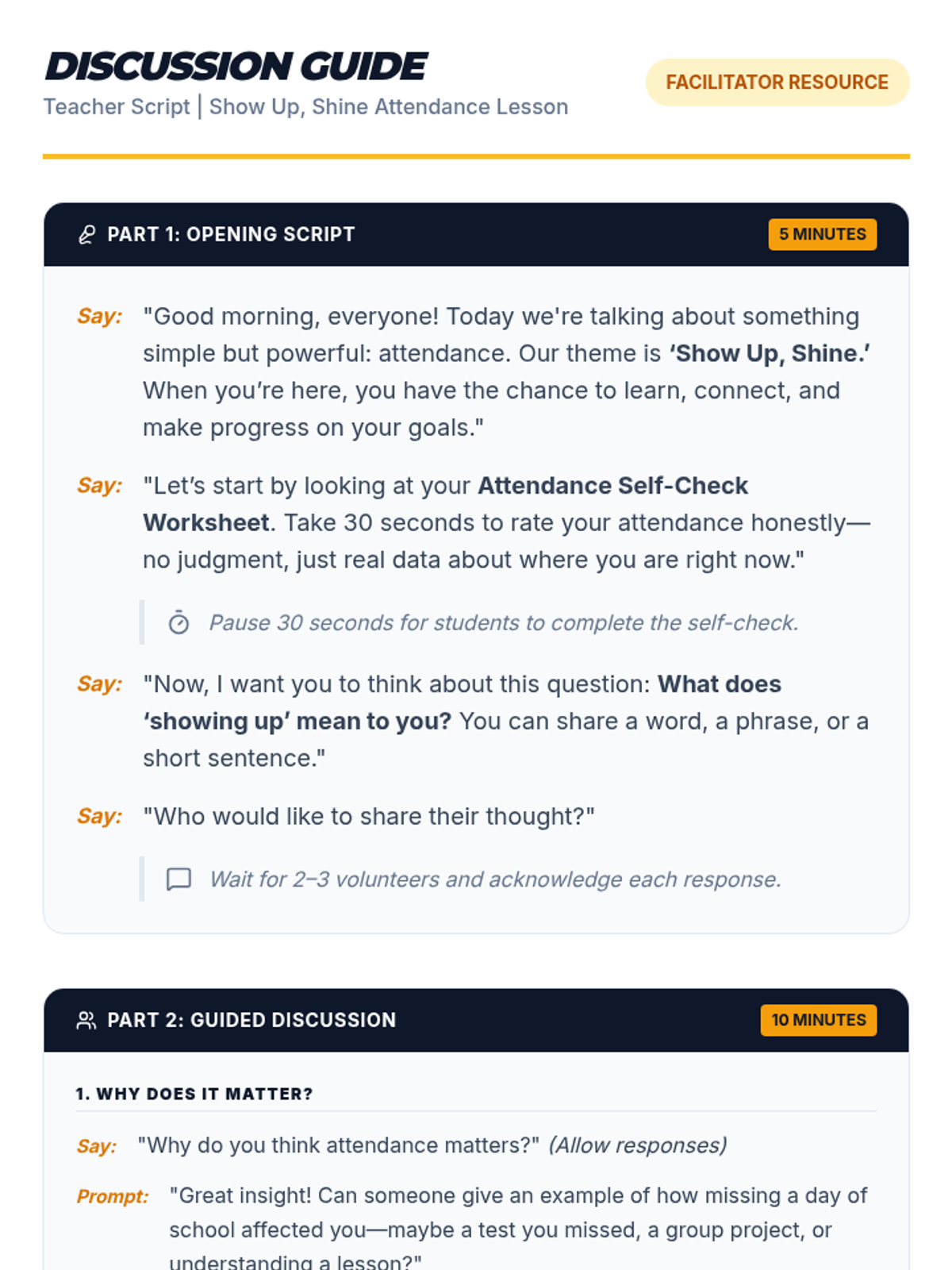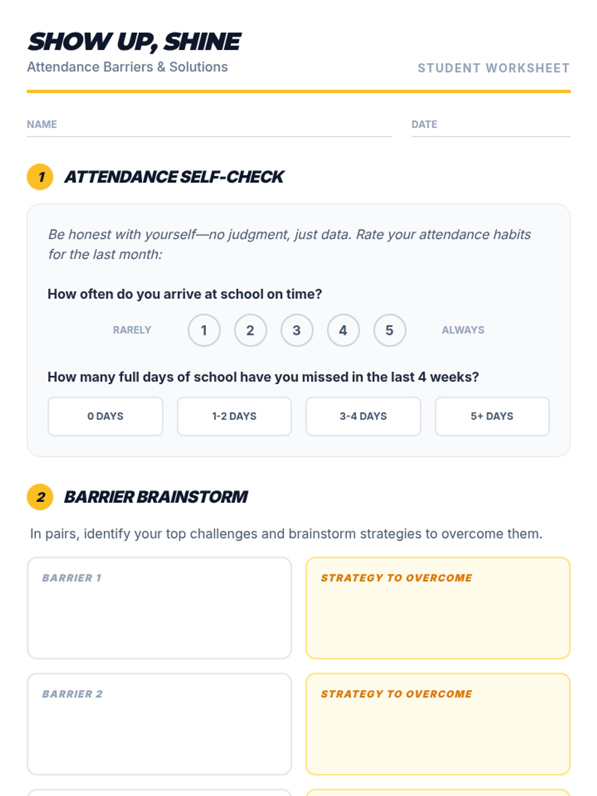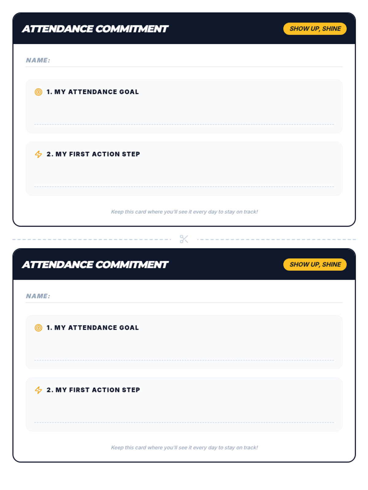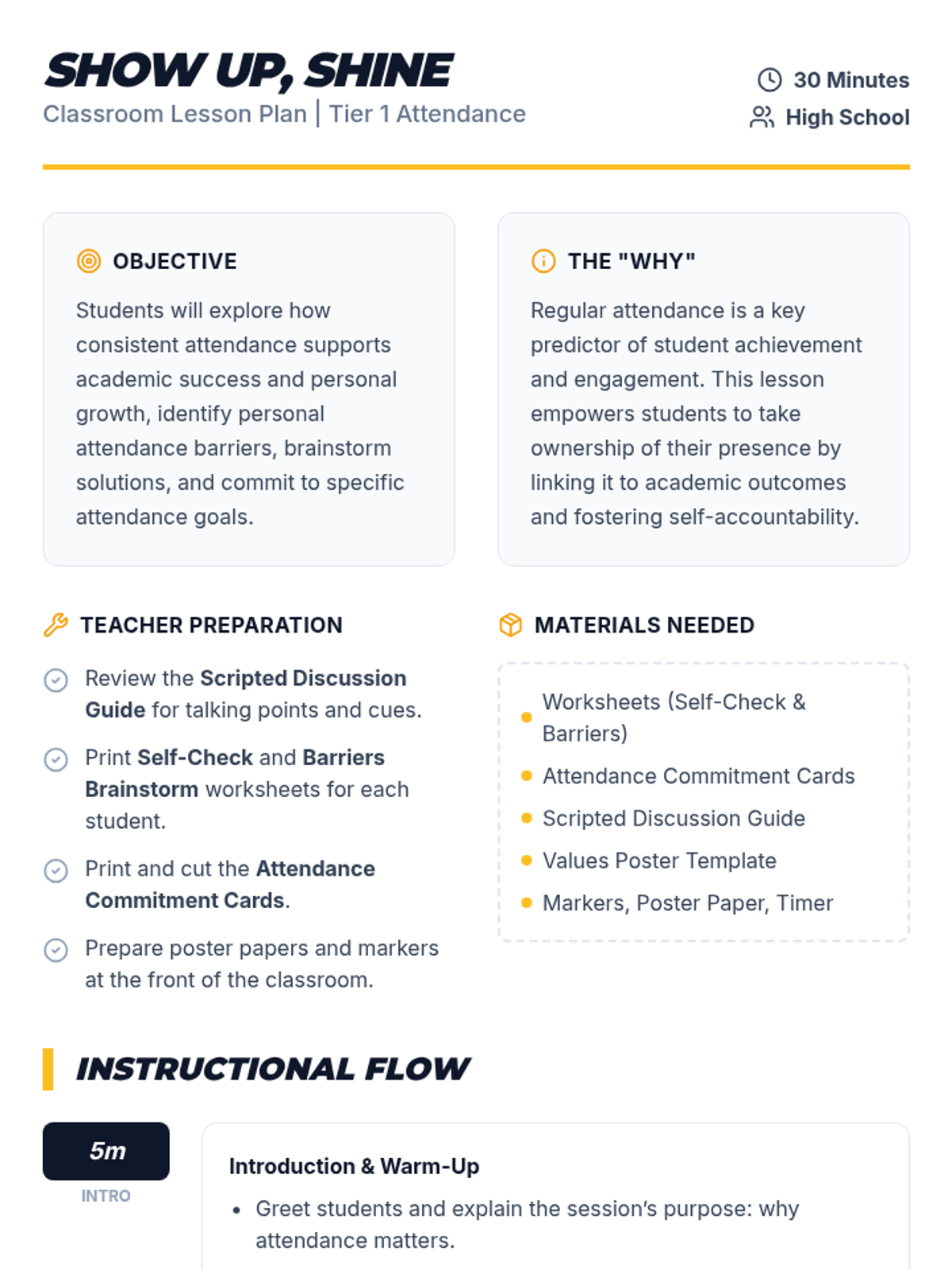 A 30-minute Tier 1 lesson for high school students to explore the importance of attendance, identify barriers, and commit to regular presence for academic success.