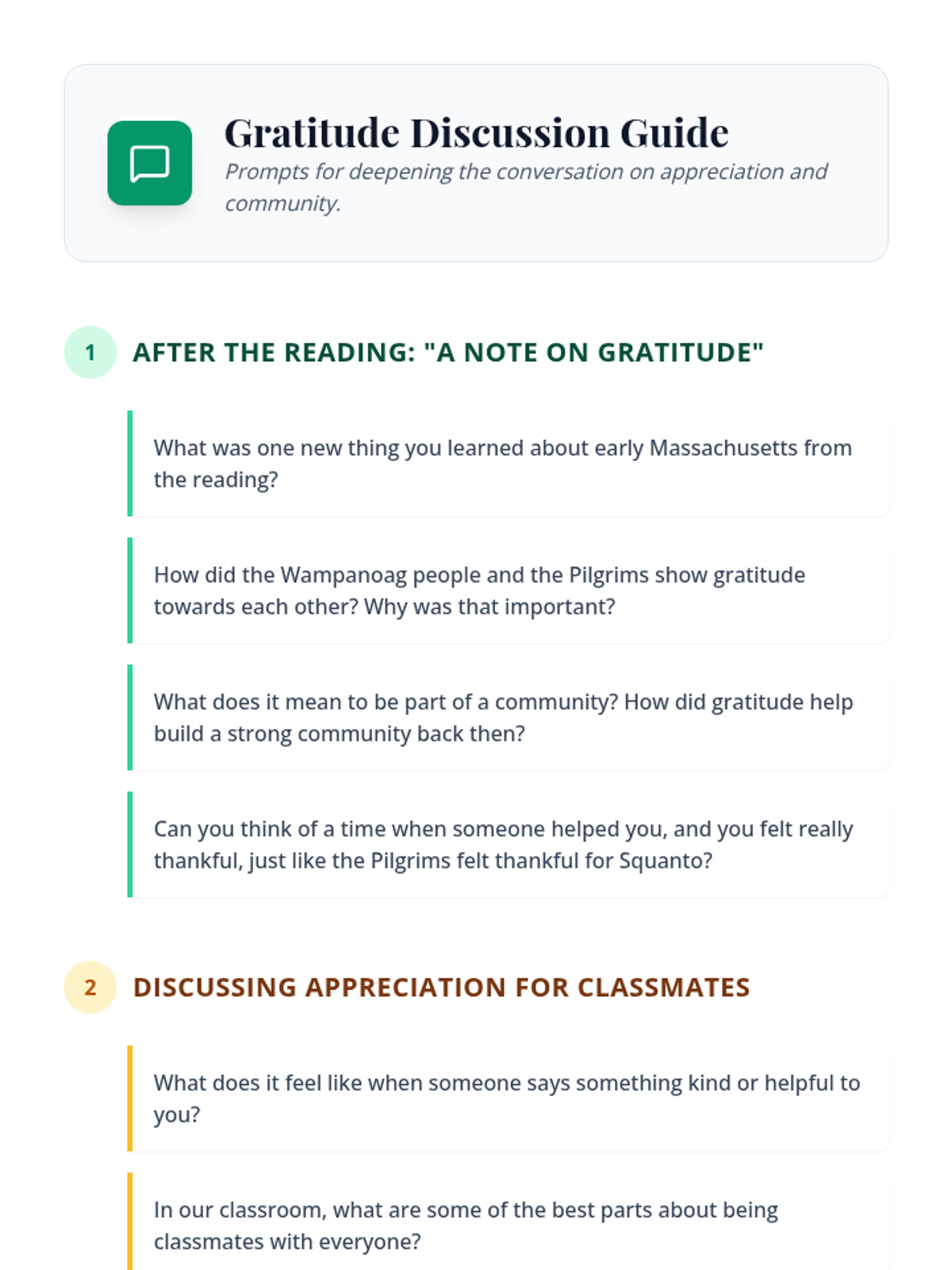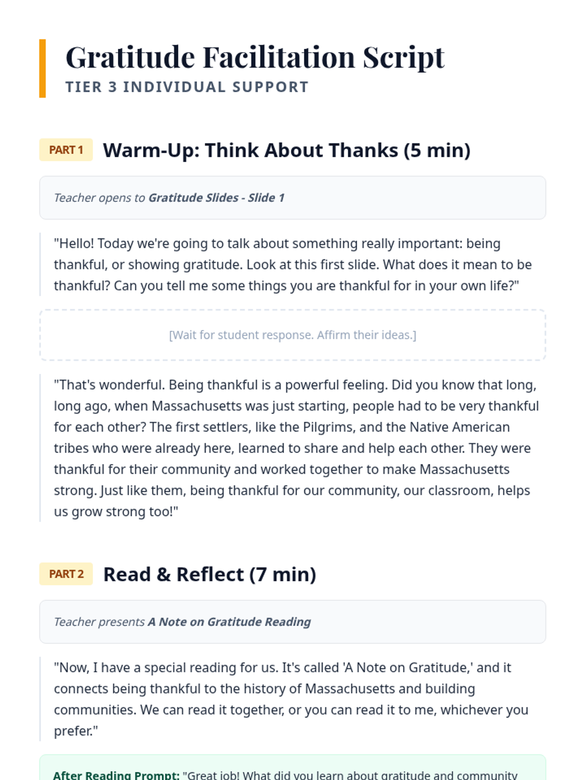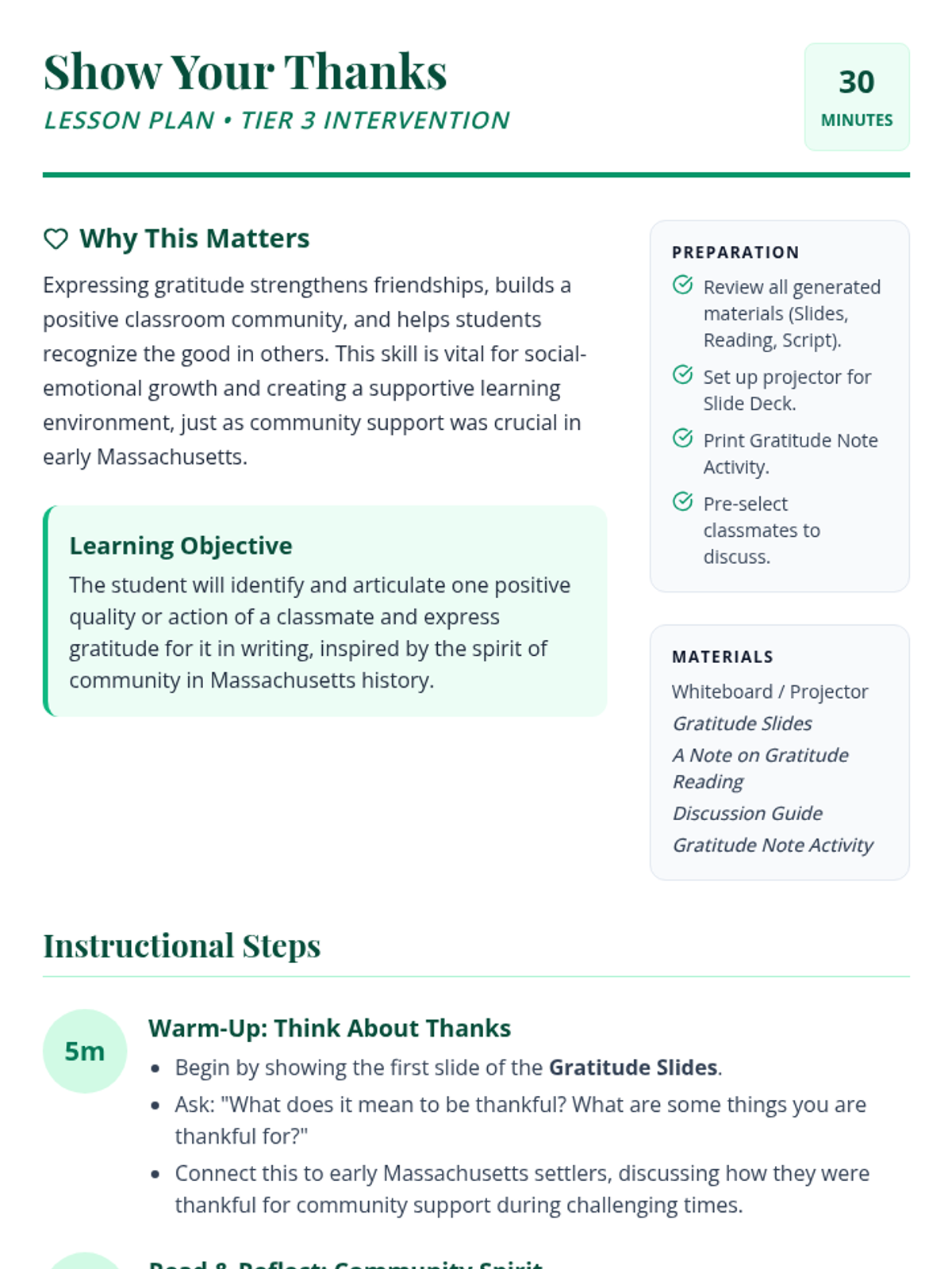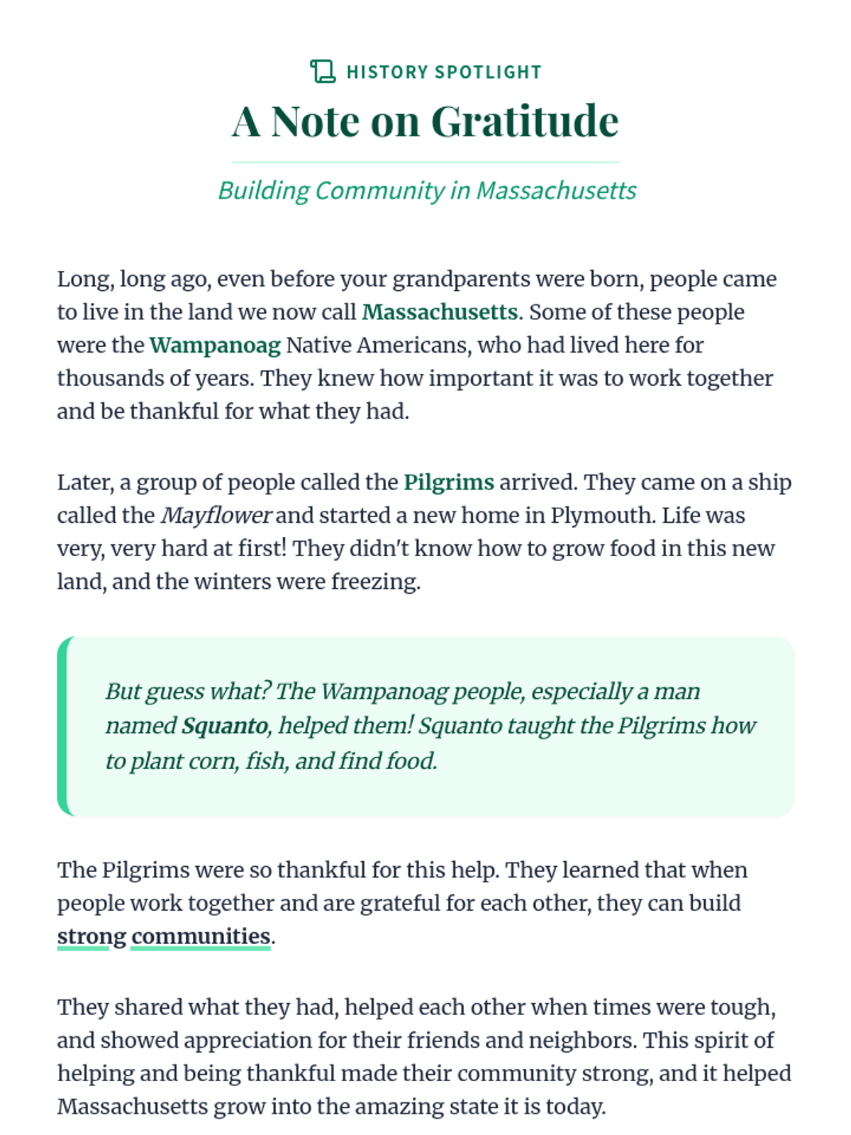 A 30-minute Tier 3 social-emotional lesson for 3rd grade that uses Massachusetts history to teach the value of gratitude and community building.