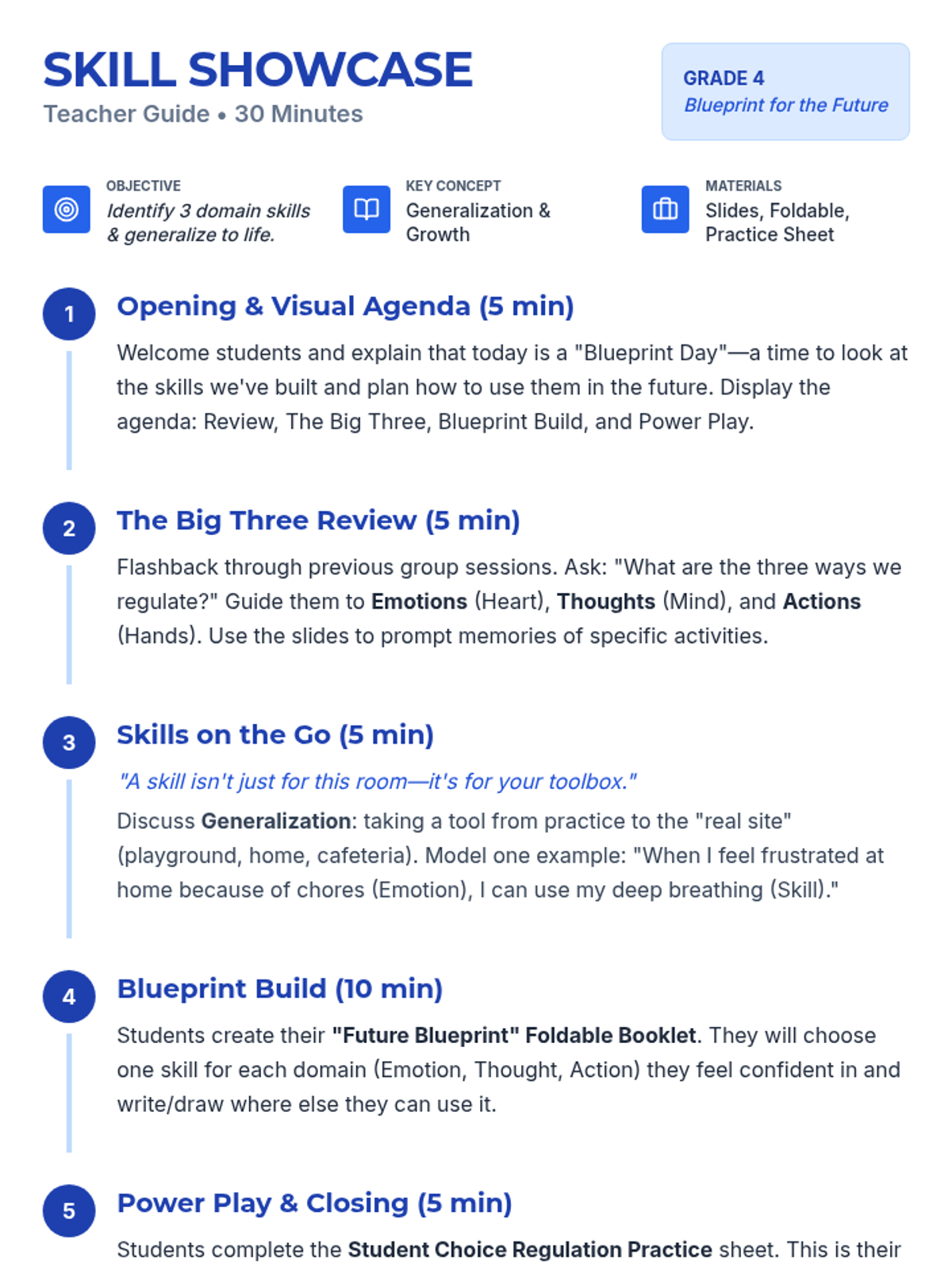 A 30-minute lesson where 4th-grade students reflect on their growth in managing emotions, thoughts, and actions, and plan how to apply these skills in real-world settings.