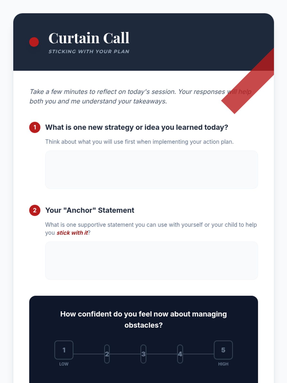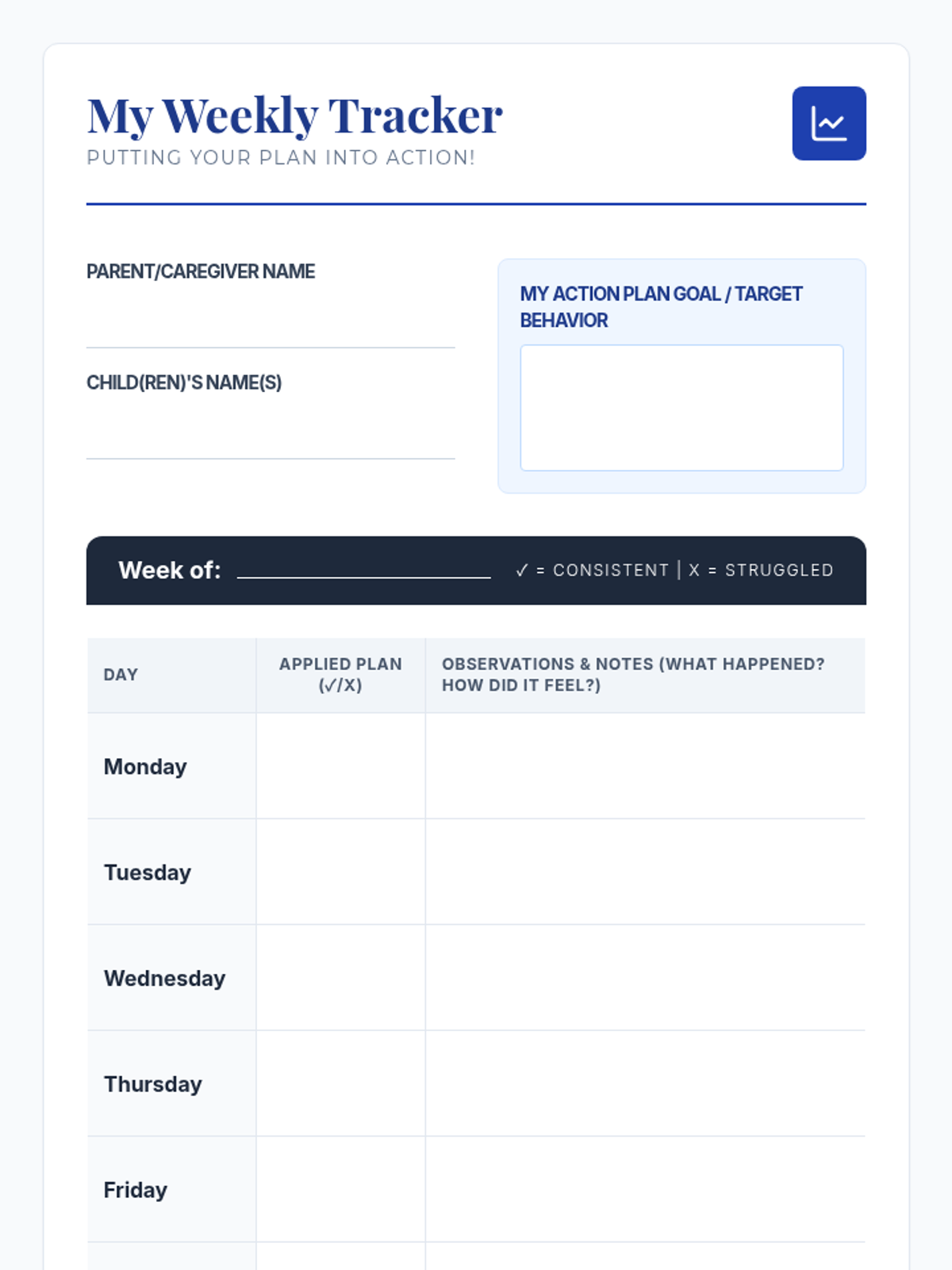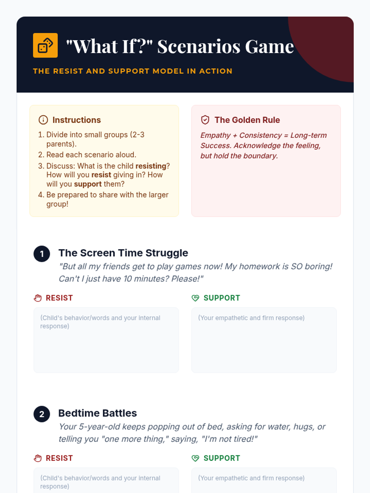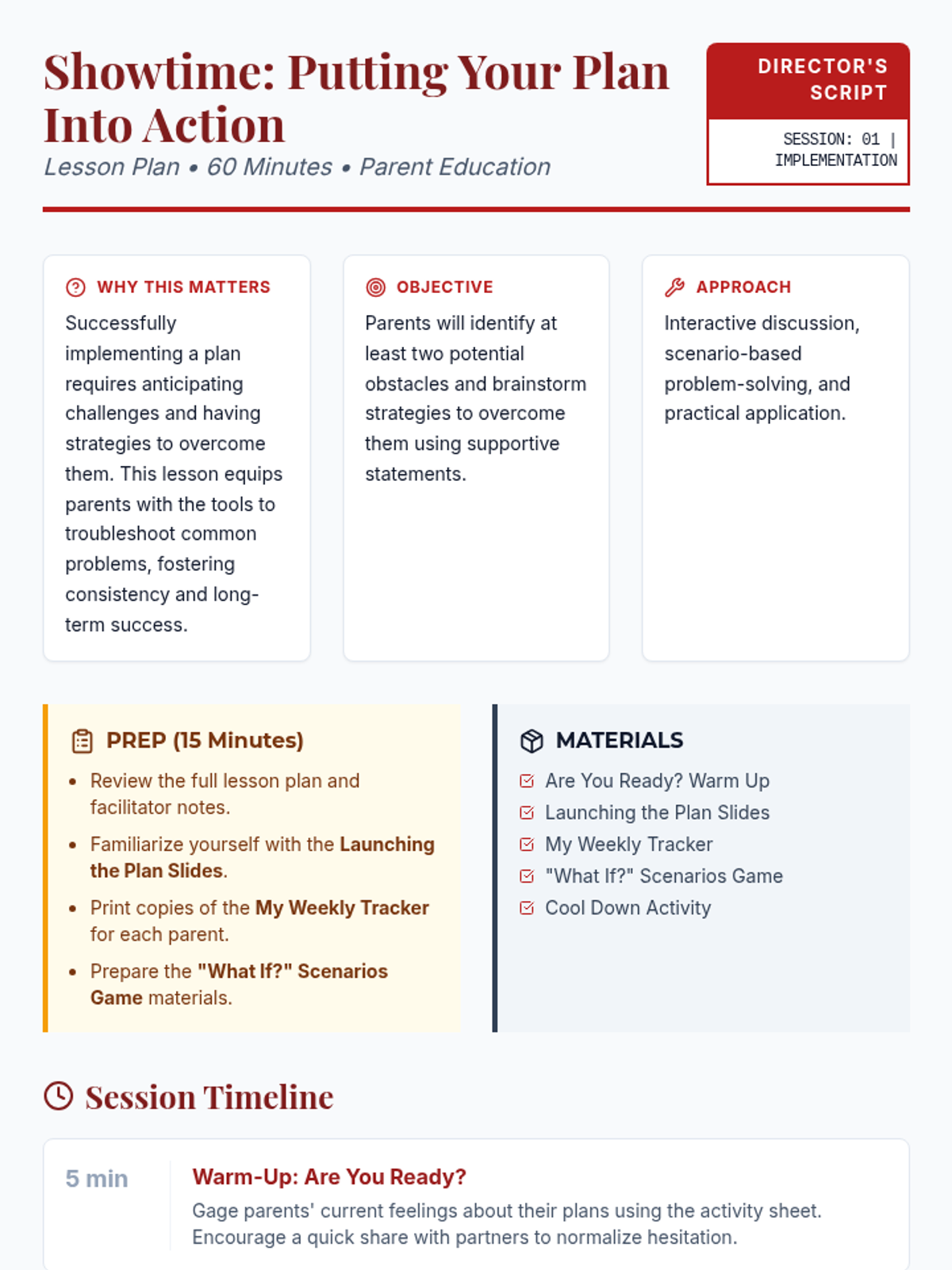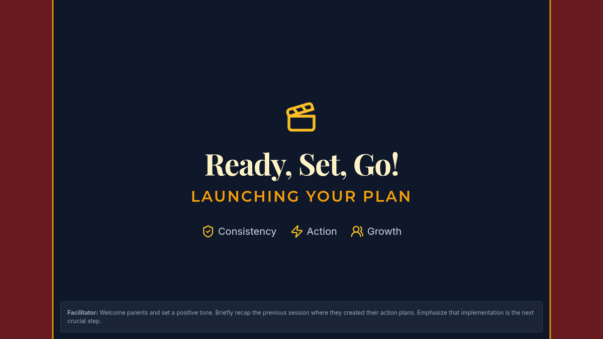 This lesson helps parents identify potential obstacles to implementing their action plan and develop strategies to overcome them using supportive statements. By the end of this 60-minute session, parents will feel more confident in maintaining consistency and problem-solving effectively.