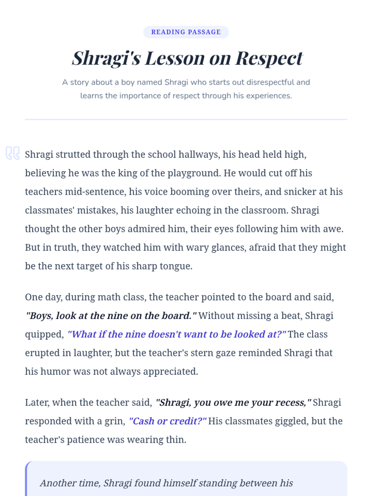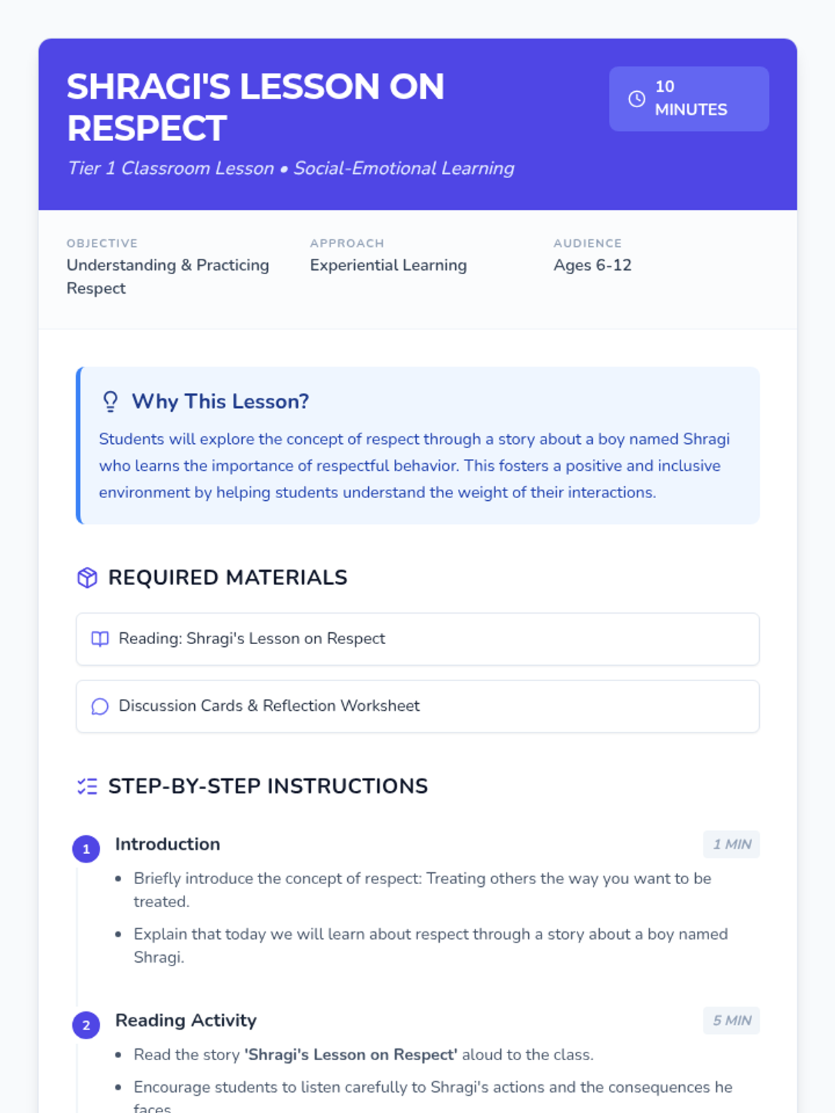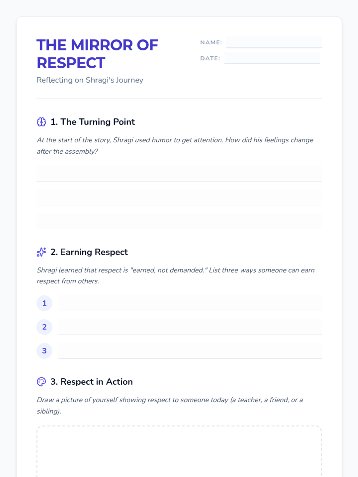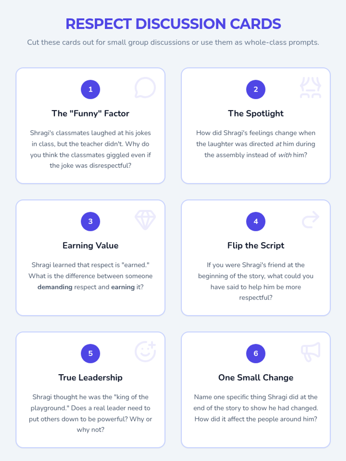 A 10-minute experiential lesson exploring respect through the story of Shragi, a boy who learns the weight of his words and actions. Students listen to a story, discuss consequences, and reflect on how to earn and give respect.