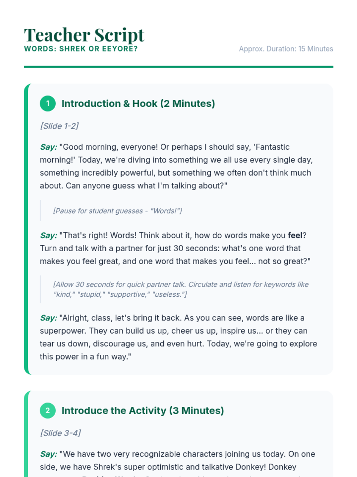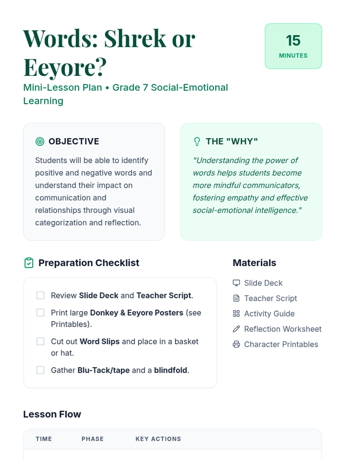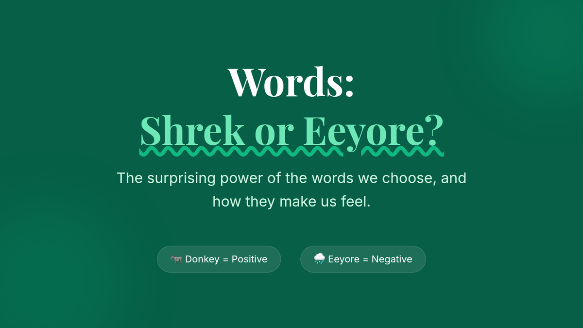 A 15-minute mini-lesson for 7th graders to explore the impact of positive and negative language using Shrek's Donkey and Eeyore as visual guides. Students engage in a blindfolded activity to categorize words and reflect on their communication choices.