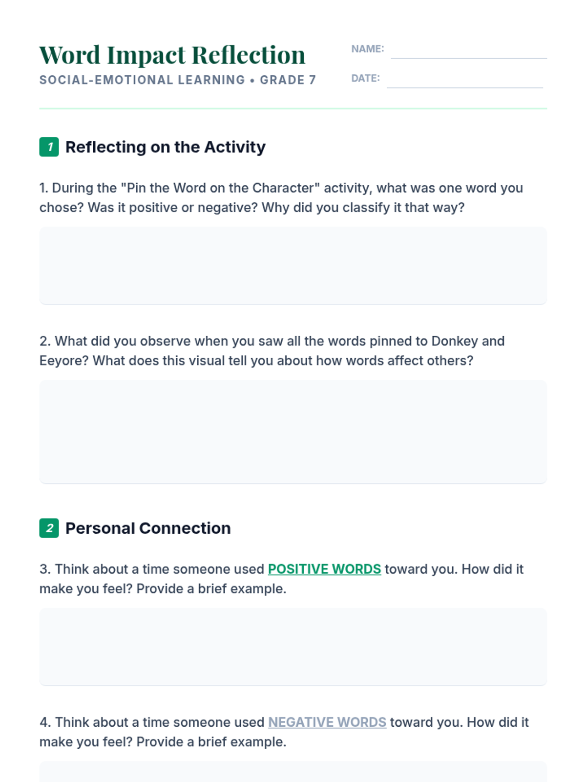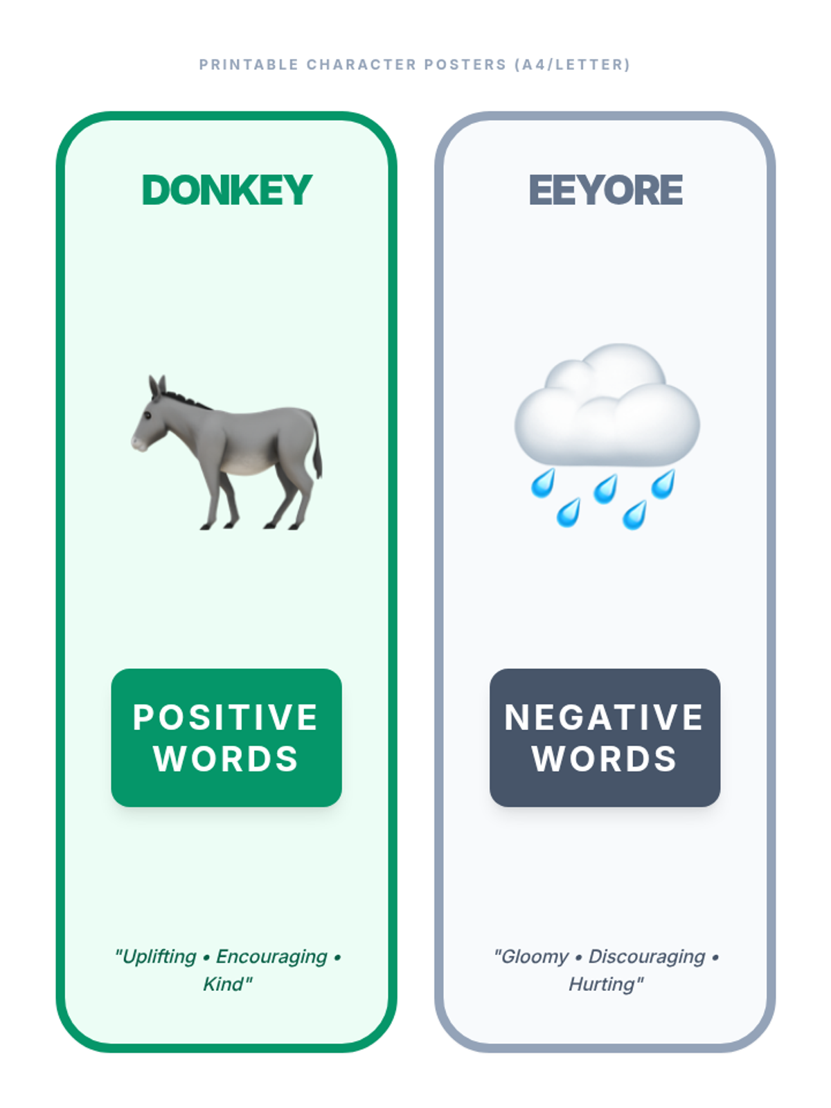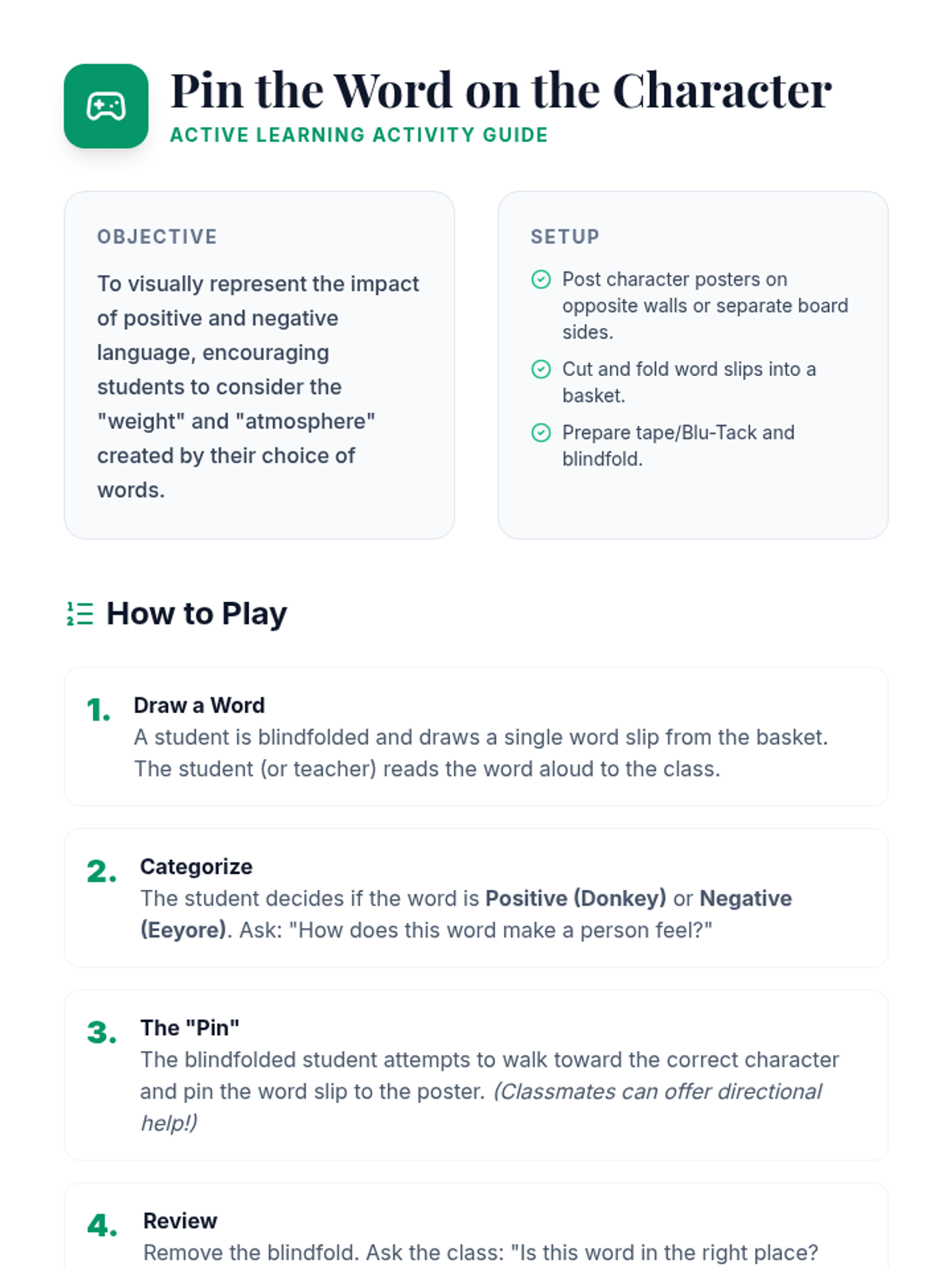 A 15-minute mini-lesson for 7th graders to explore the impact of positive and negative language using Shrek's Donkey and Eeyore as visual guides. Students engage in a blindfolded activity to categorize words and reflect on their communication choices.