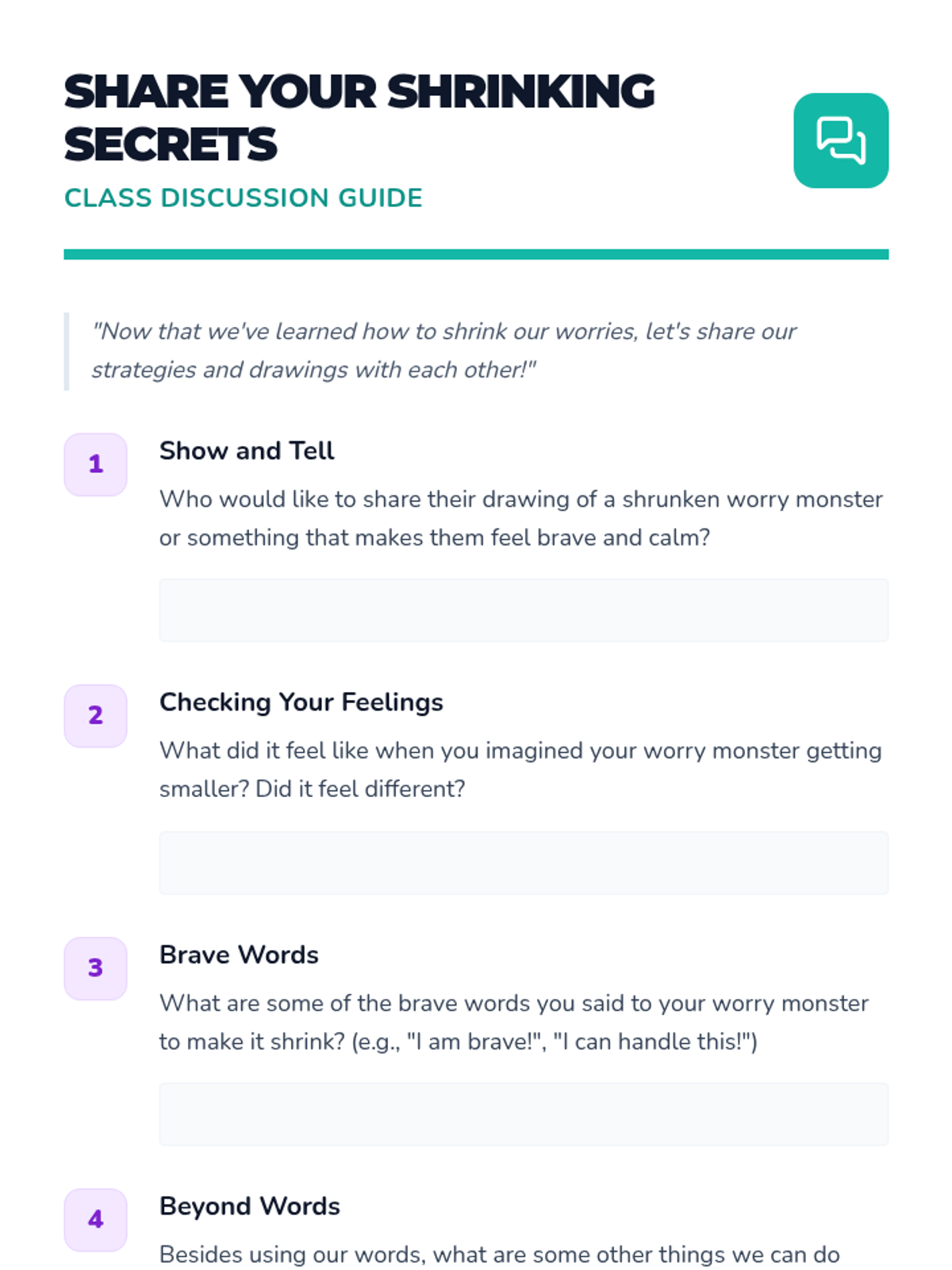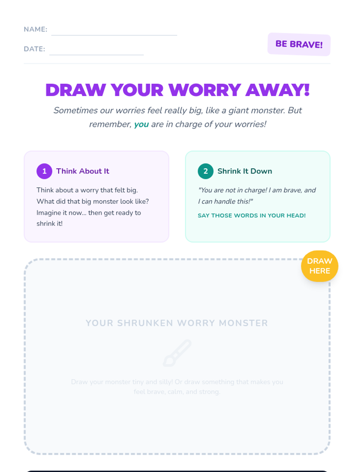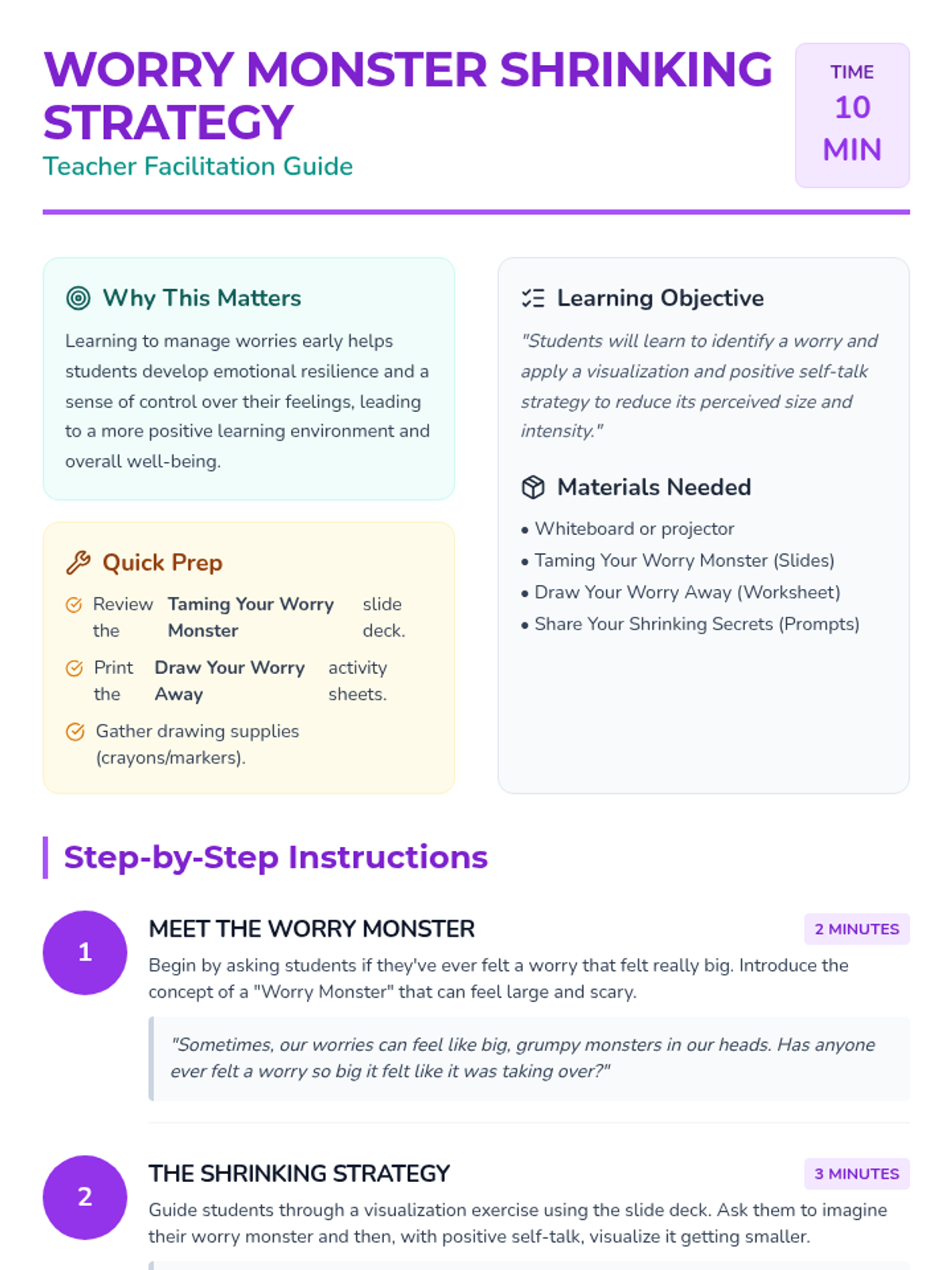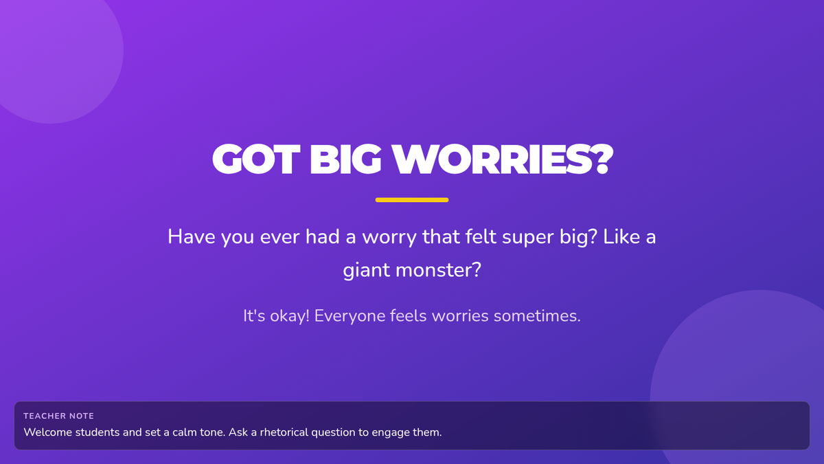 A 10-minute interactive session for 2nd graders to visualize and 'shrink' their anxieties using positive self-talk and drawing. Students learn to take control of their feelings by transforming big worries into tiny, manageable ones.