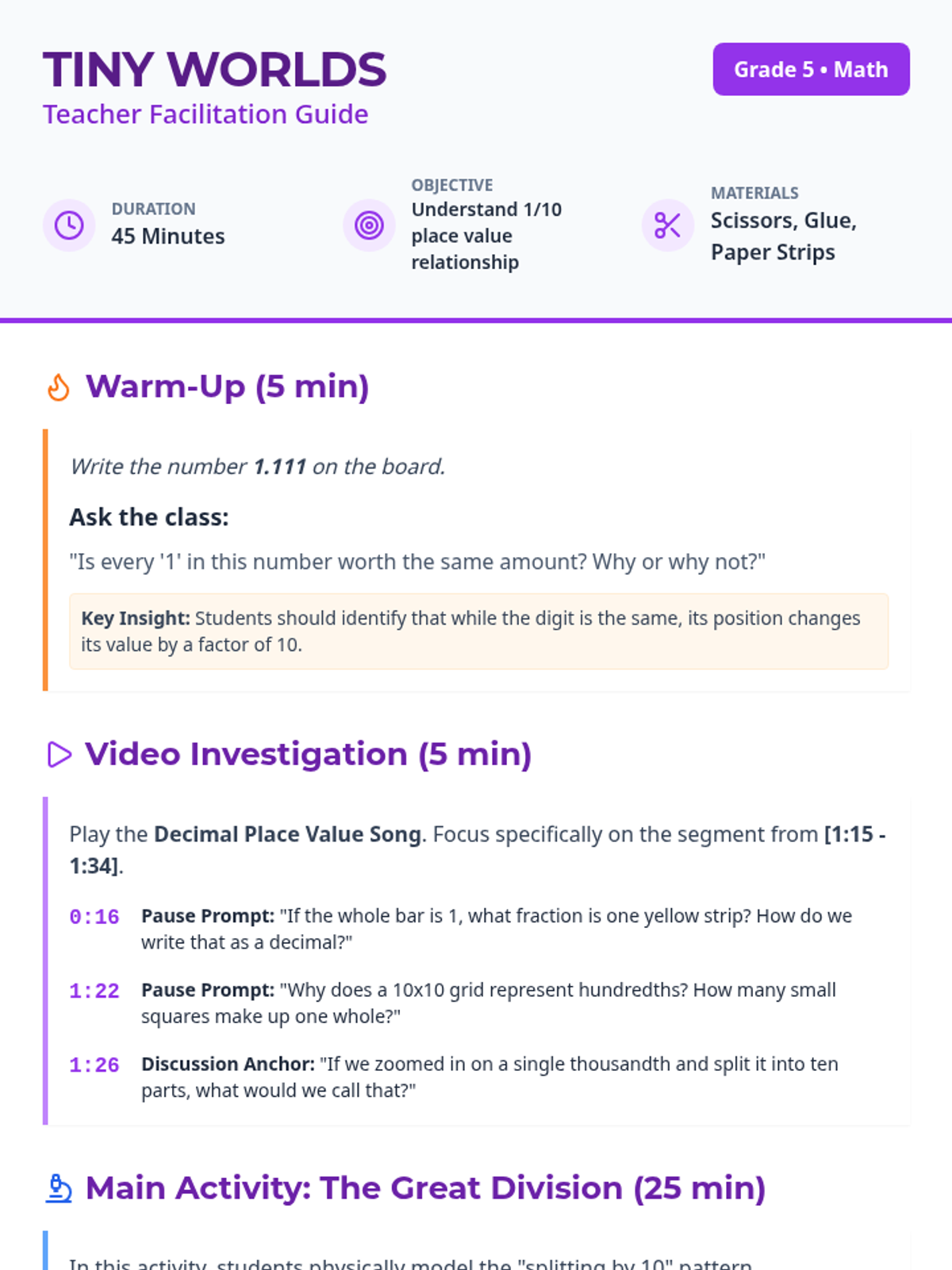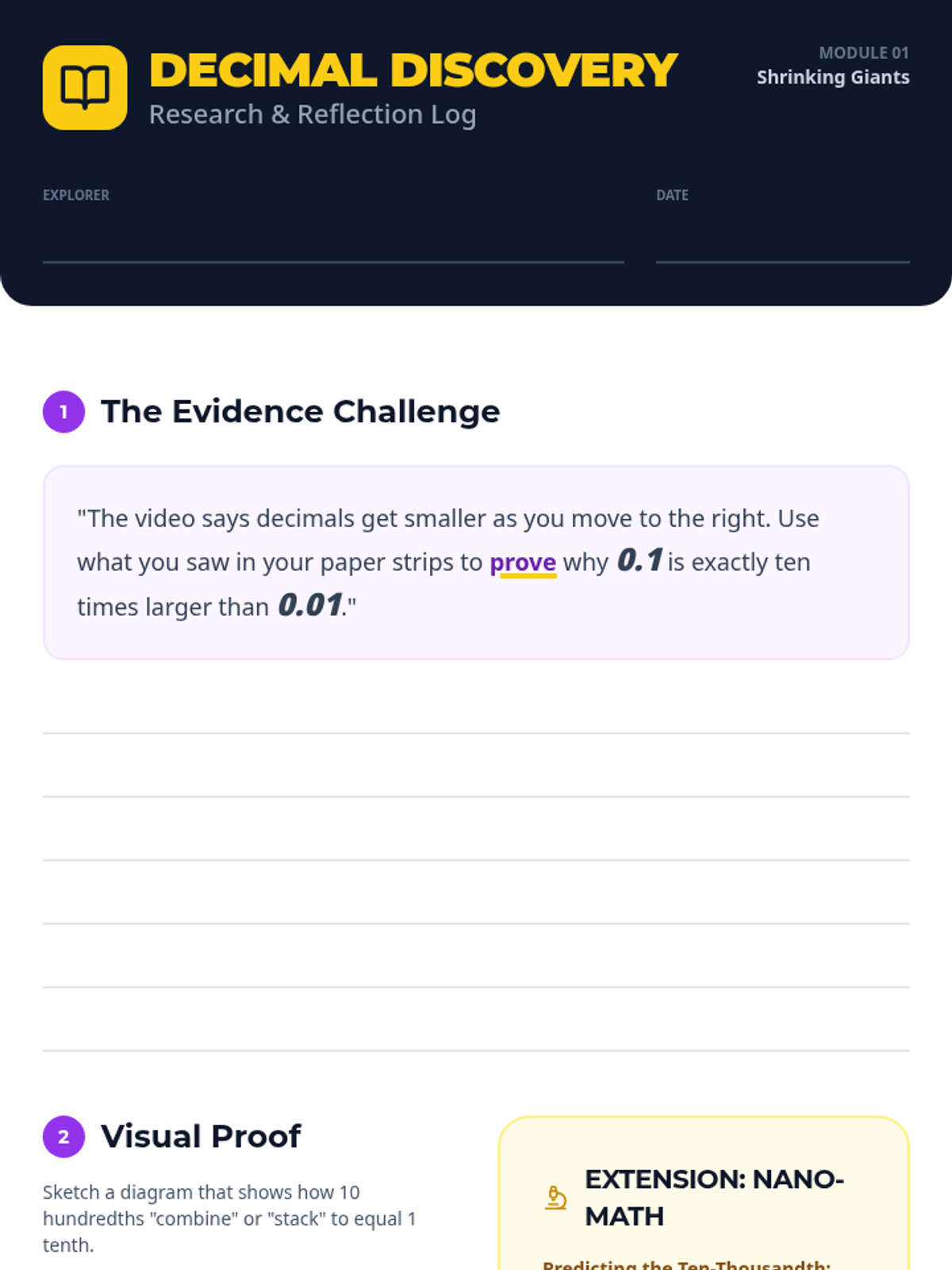 Students explore the base-ten structure of decimals, discovering that each place value is 1/10 of the value to its left through a hands-on cutting activity and visual modeling.