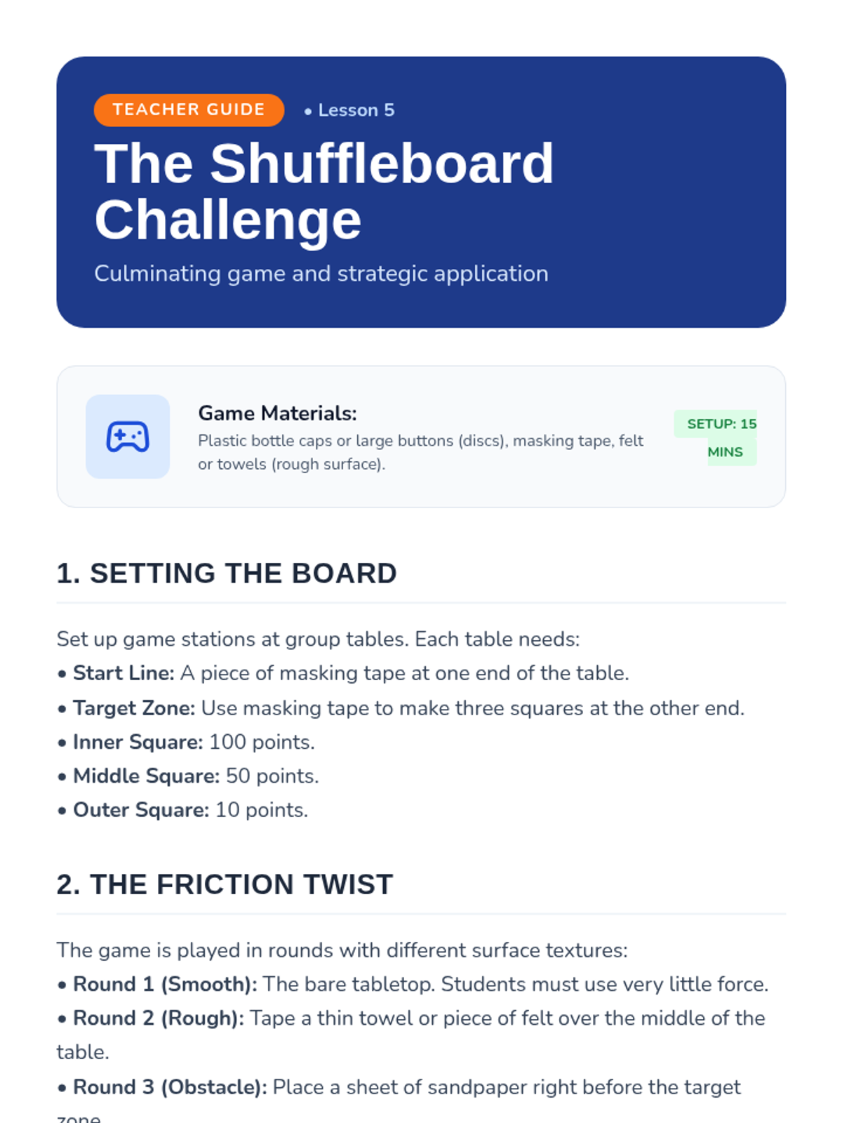A culminating game where students apply their knowledge of force and friction to hit a target.