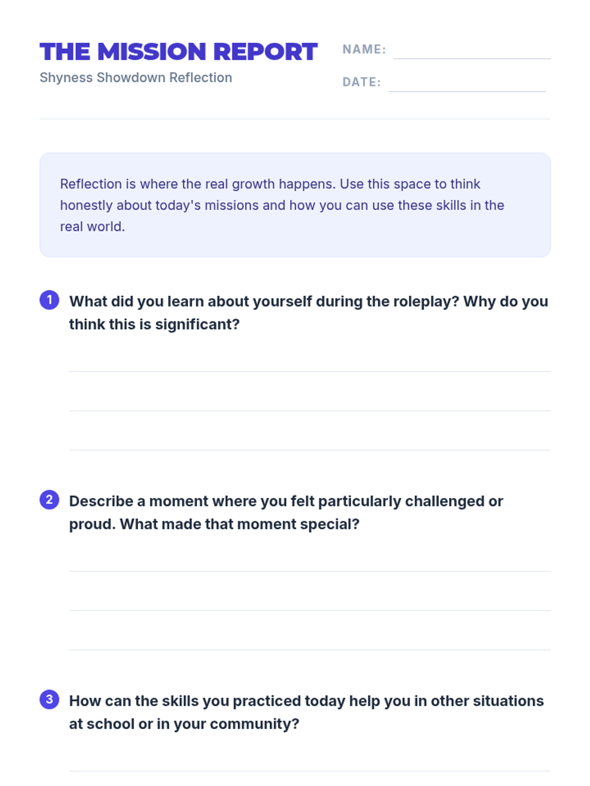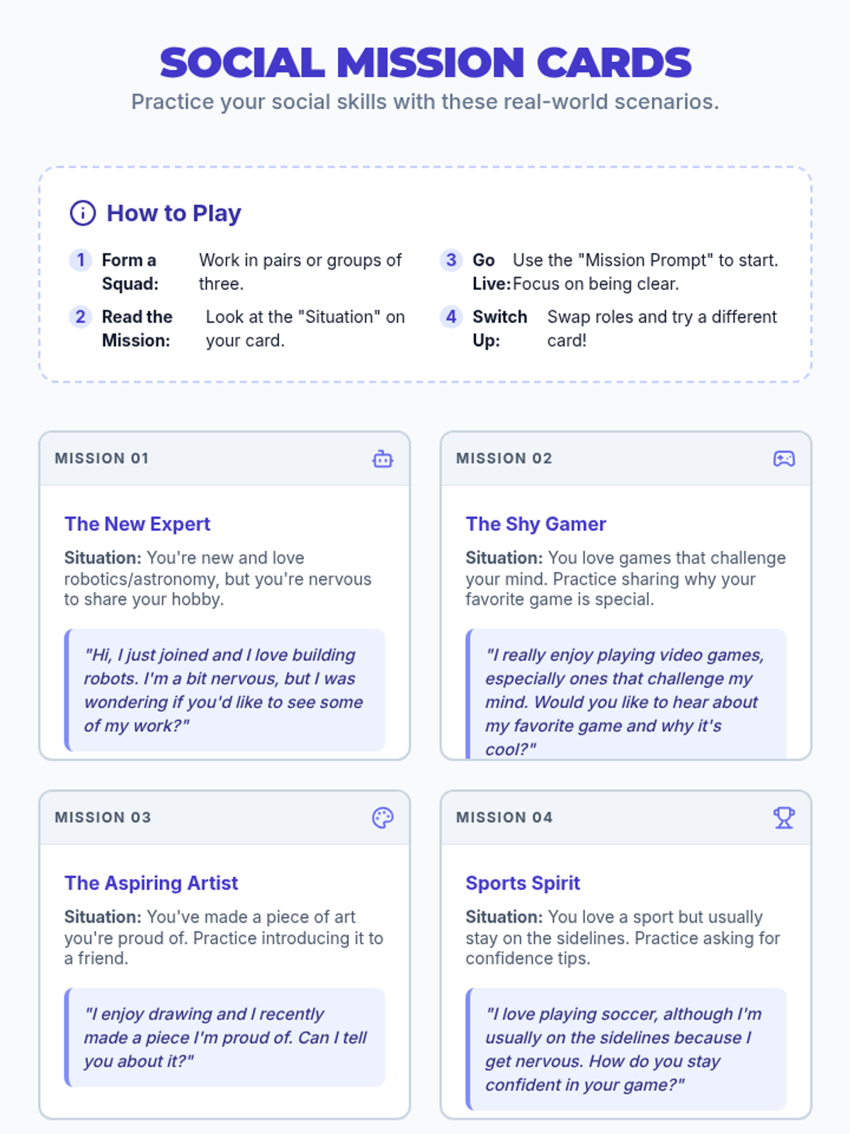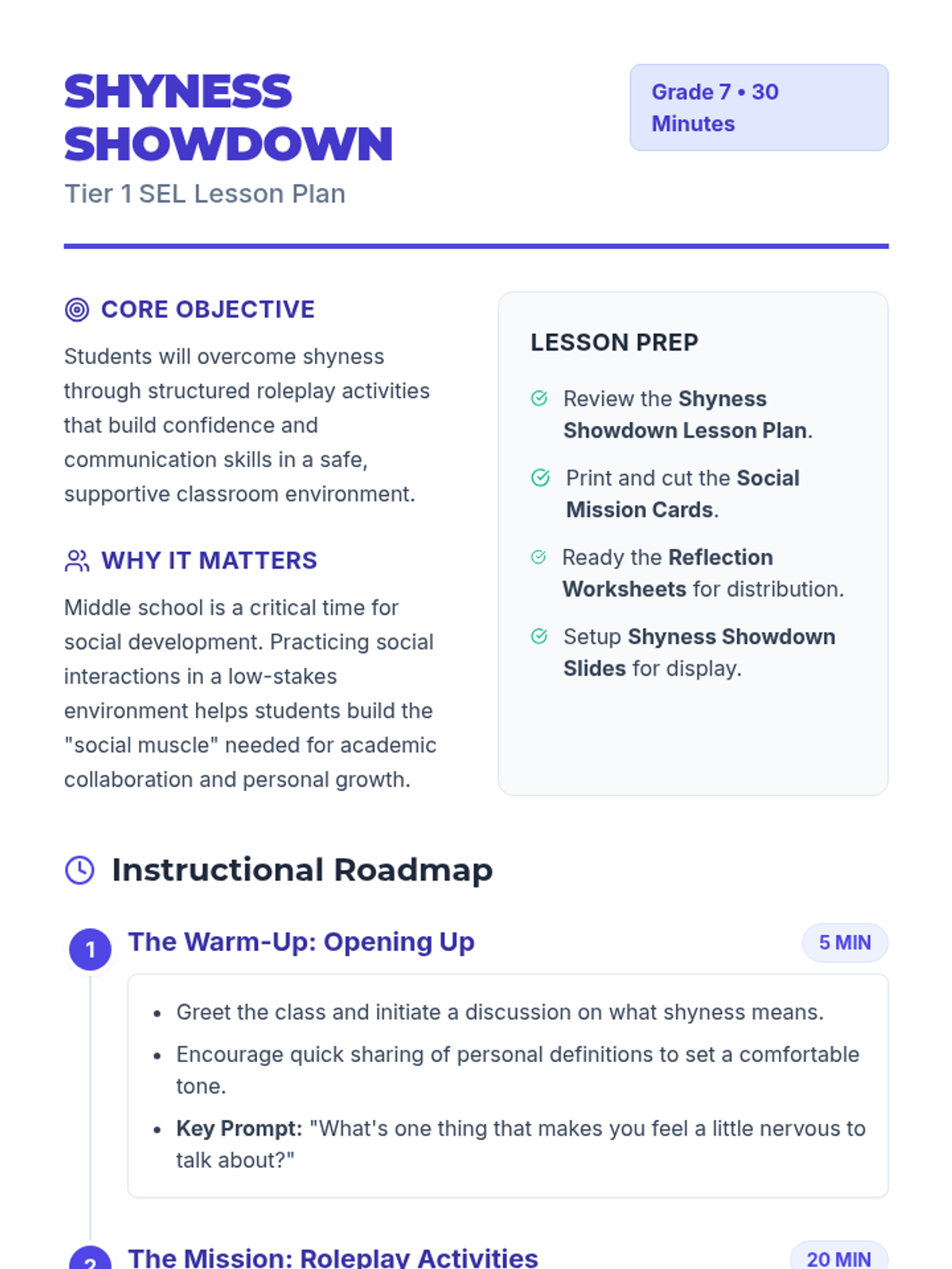 A 30-minute social-emotional learning lesson for 7th graders focused on building social confidence and overcoming shyness through structured roleplay activities. Students practice conversation starters in a supportive, low-stakes environment.