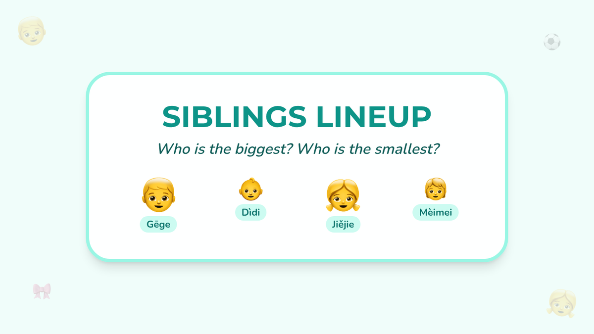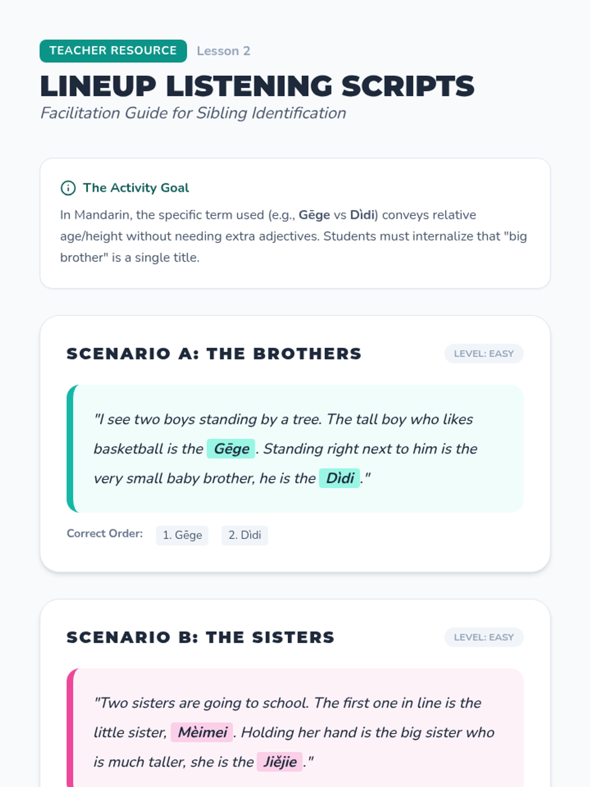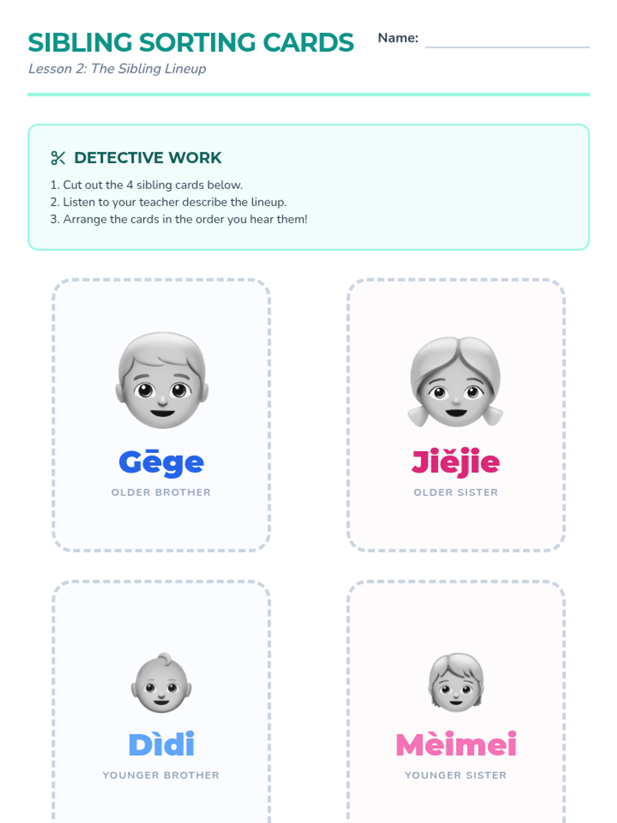 Mandarin distinguishes older/younger siblings (Gēge/Dìdi, Jiějie/Mèimei). Students listen to audio descriptions of children standing in a line and must arrange picture cards by height/age based on the terms heard.