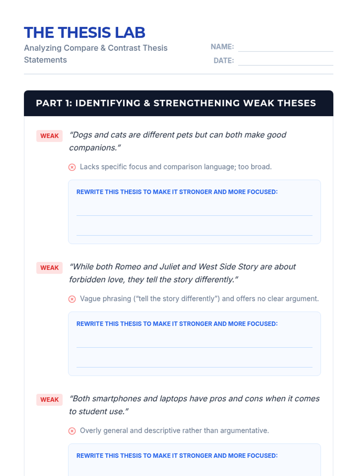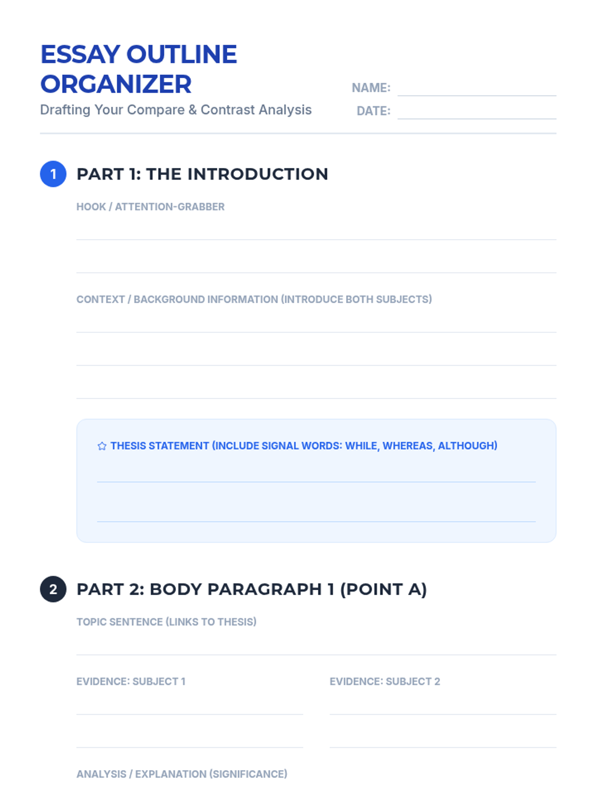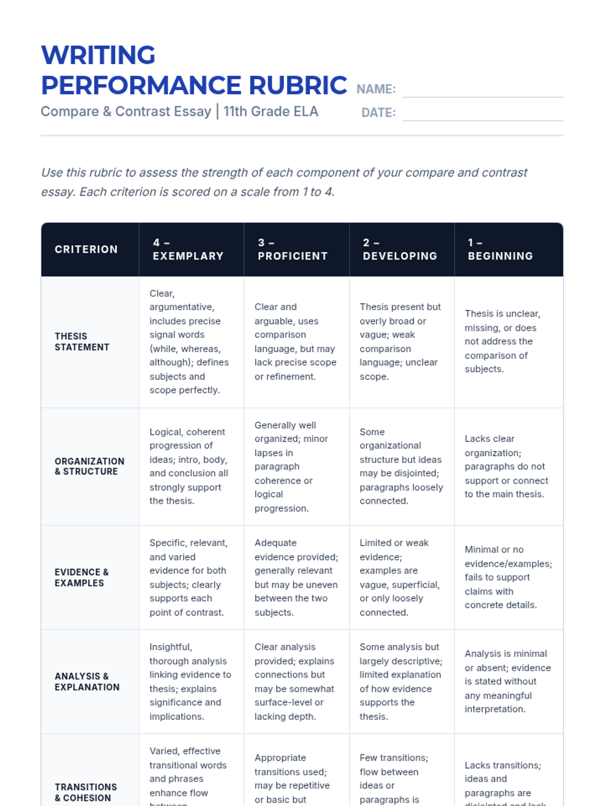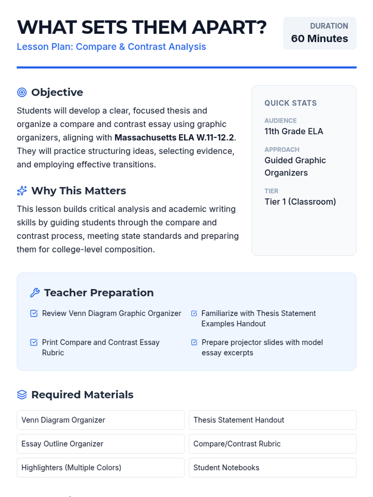 In this 60-minute lesson, 11th graders learn to craft organized compare and contrast essays. They focus on thesis development, organizational patterns, and evidence-based analysis using graphic organizers and a comprehensive rubric.