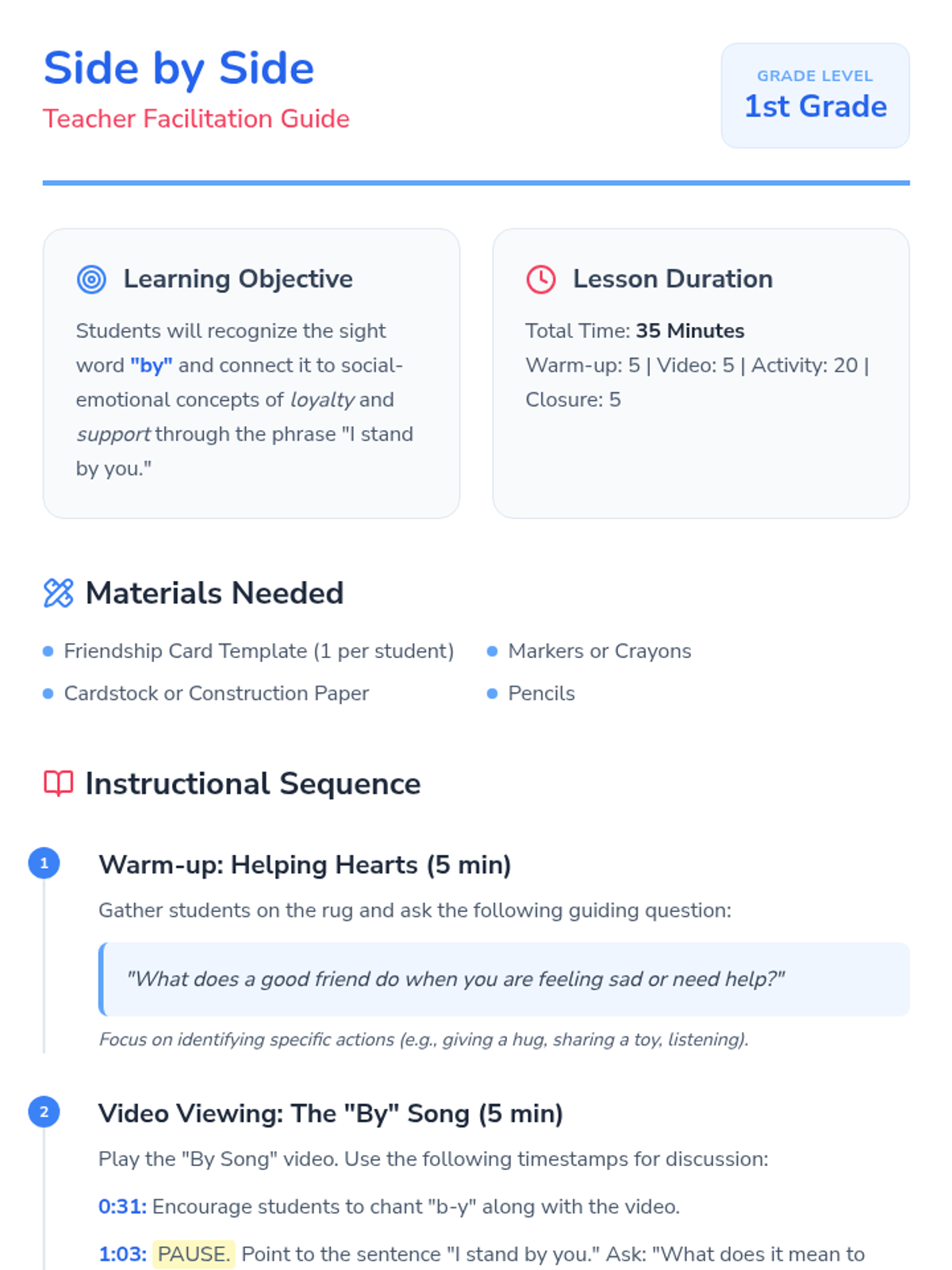A 1st-grade lesson blending literacy and social-emotional learning by exploring the sight word 'by' through the lens of friendship and loyalty. Students will watch a song, discuss the phrase 'I stand by you,' and create personalized friendship cards.