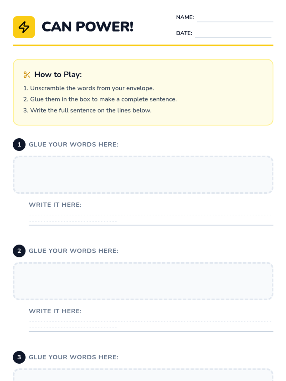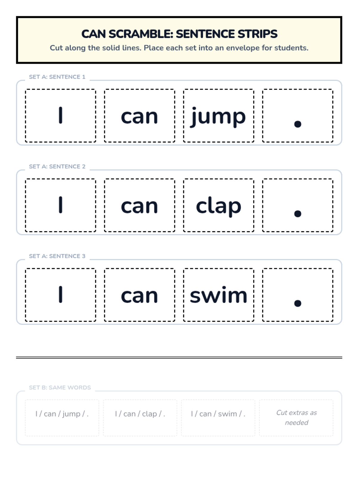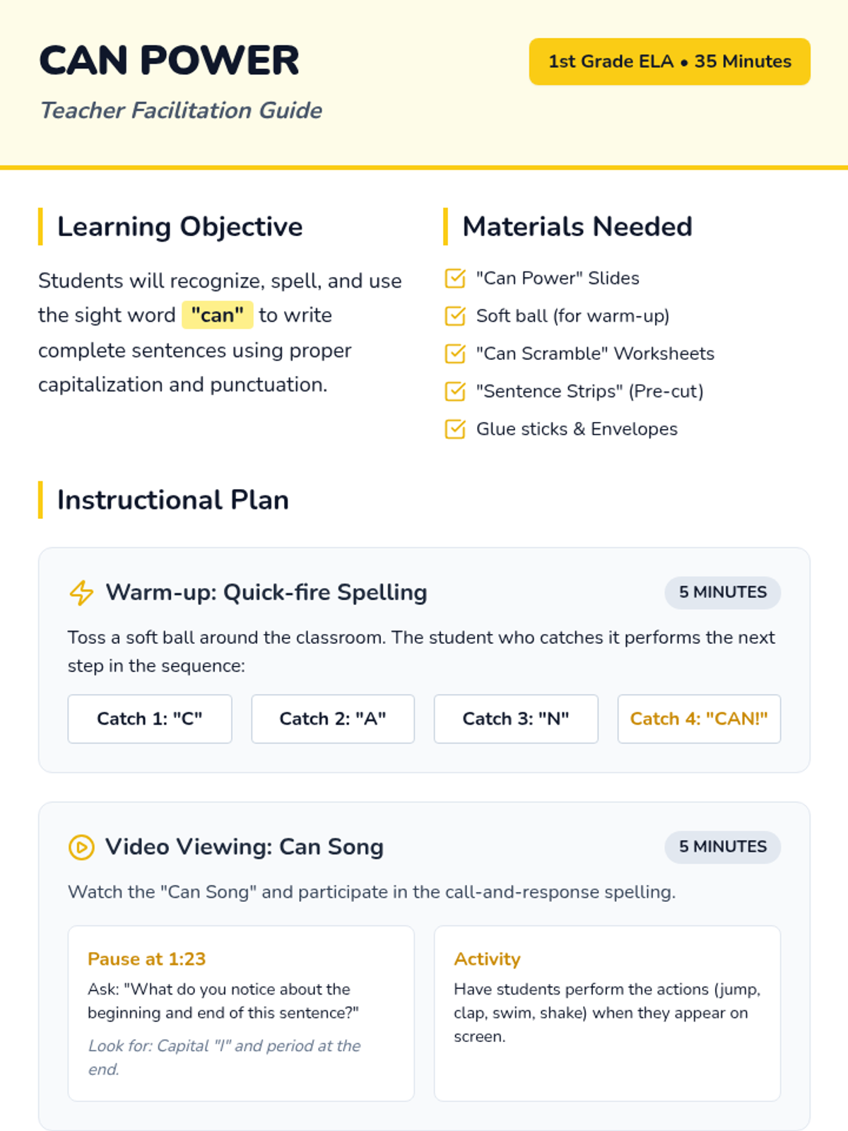 Students learn to recognize, spell, and use the sight word 'can' in complete sentences with proper capitalization and punctuation through music, movement, and a hands-on sentence scramble activity.