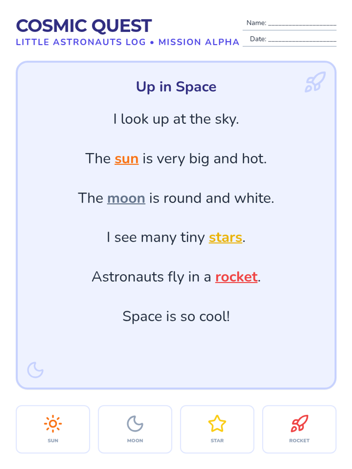 An introductory space exploration lesson for Kindergarteners focusing on basic concepts like the sun, moon, and stars through simple text and visual engagement.