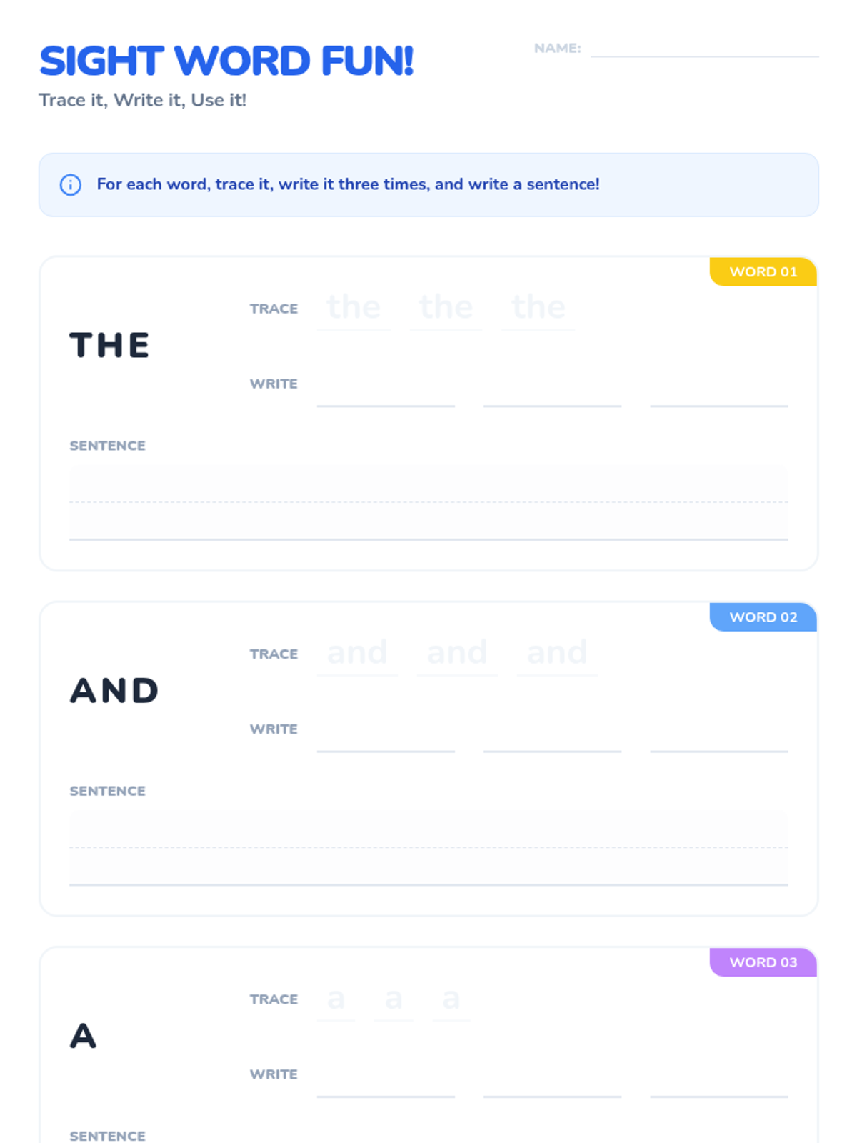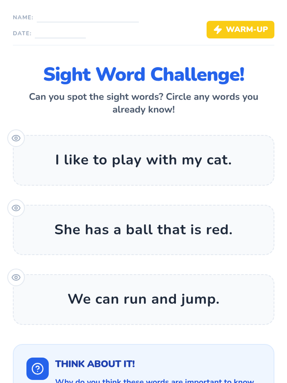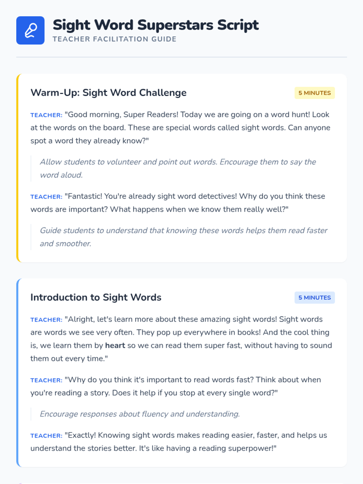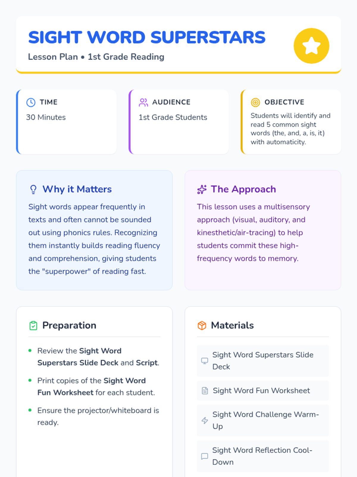 An interactive 30-minute lesson for 1st-grade students to master five core sight words (the, and, a, is, it) through guided practice, movement, and independent work.