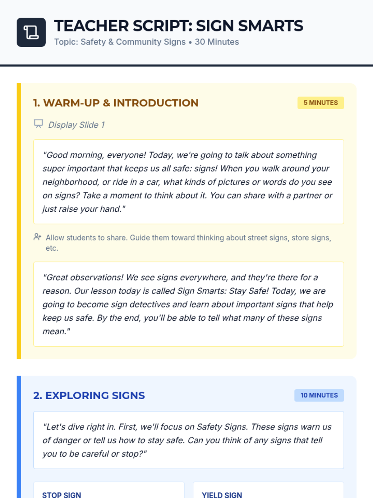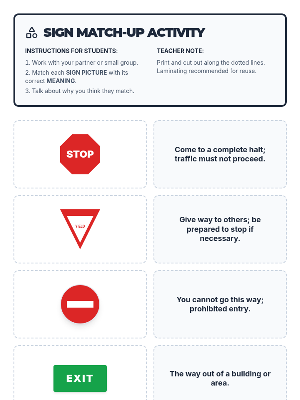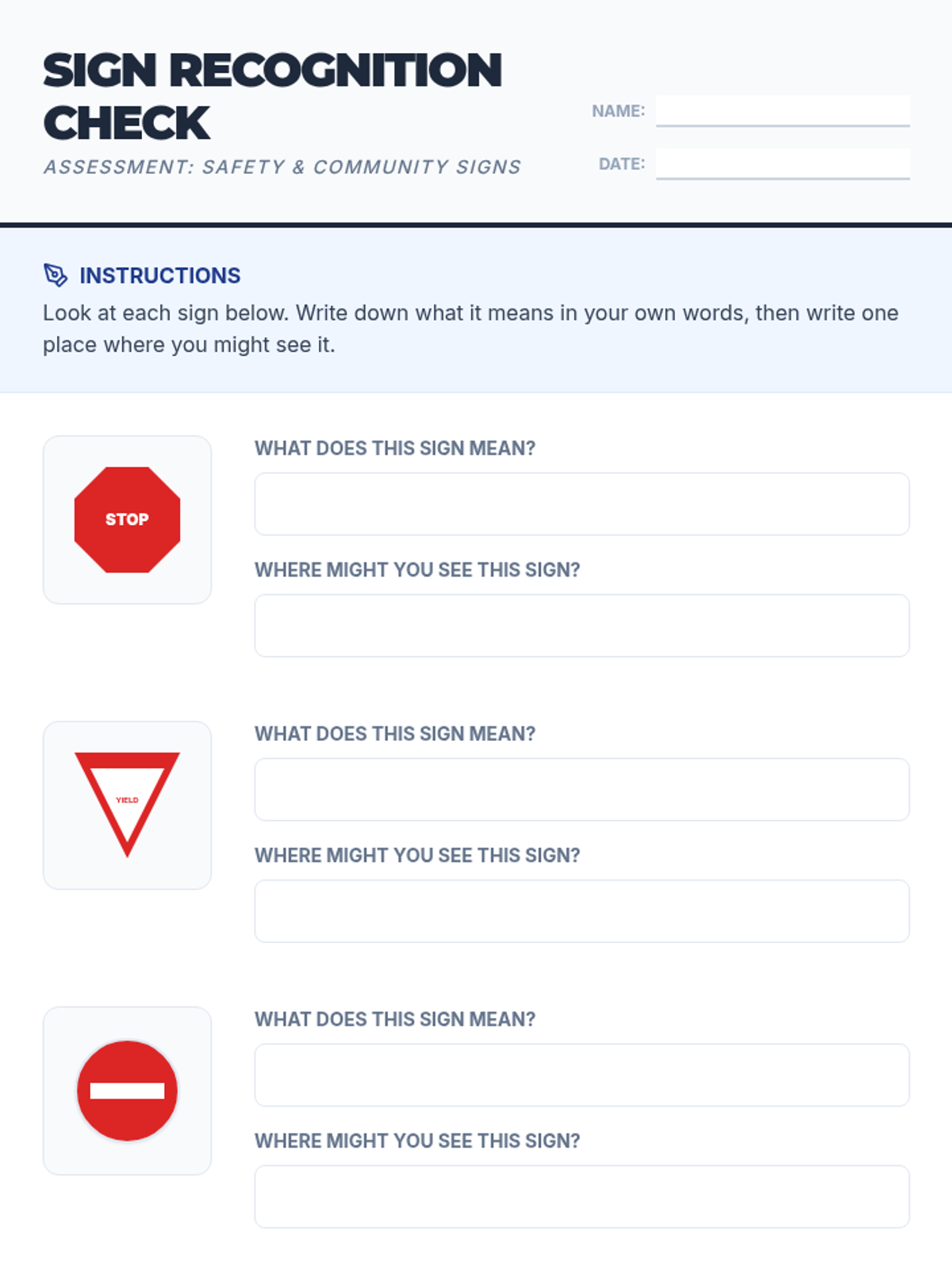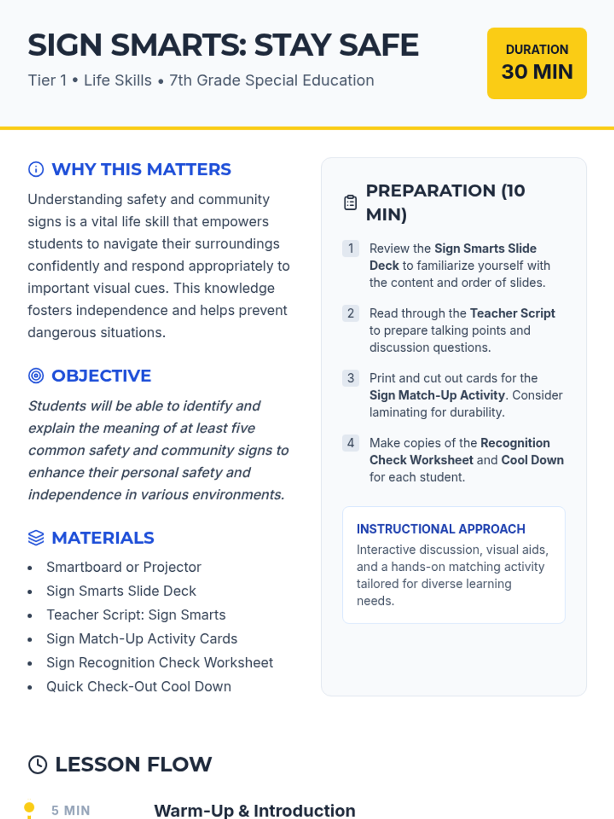 This 30-minute Tier 1 lesson helps 7th-grade special education students recognize and understand common safety and community signs. Learning these signs is crucial for navigating public spaces independently and safely.