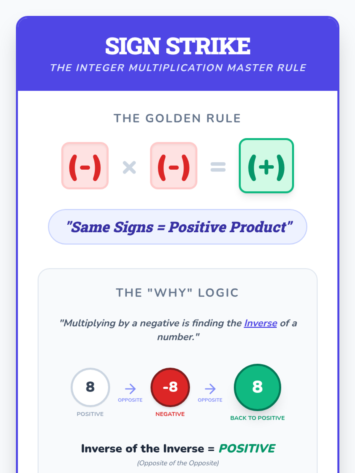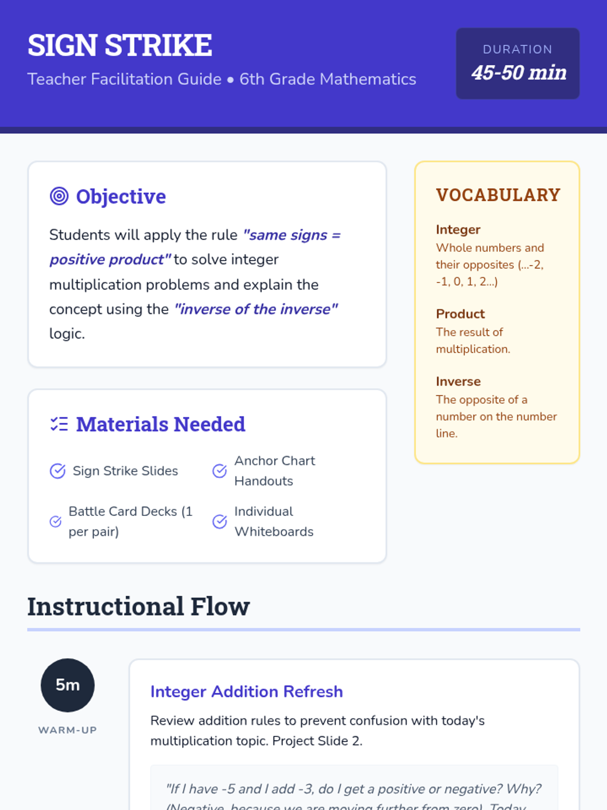 A 6th-grade math lesson focusing on the procedural and conceptual understanding of multiplying two negative integers using the 'inverse of the inverse' concept and a card game called 'Integer War'.