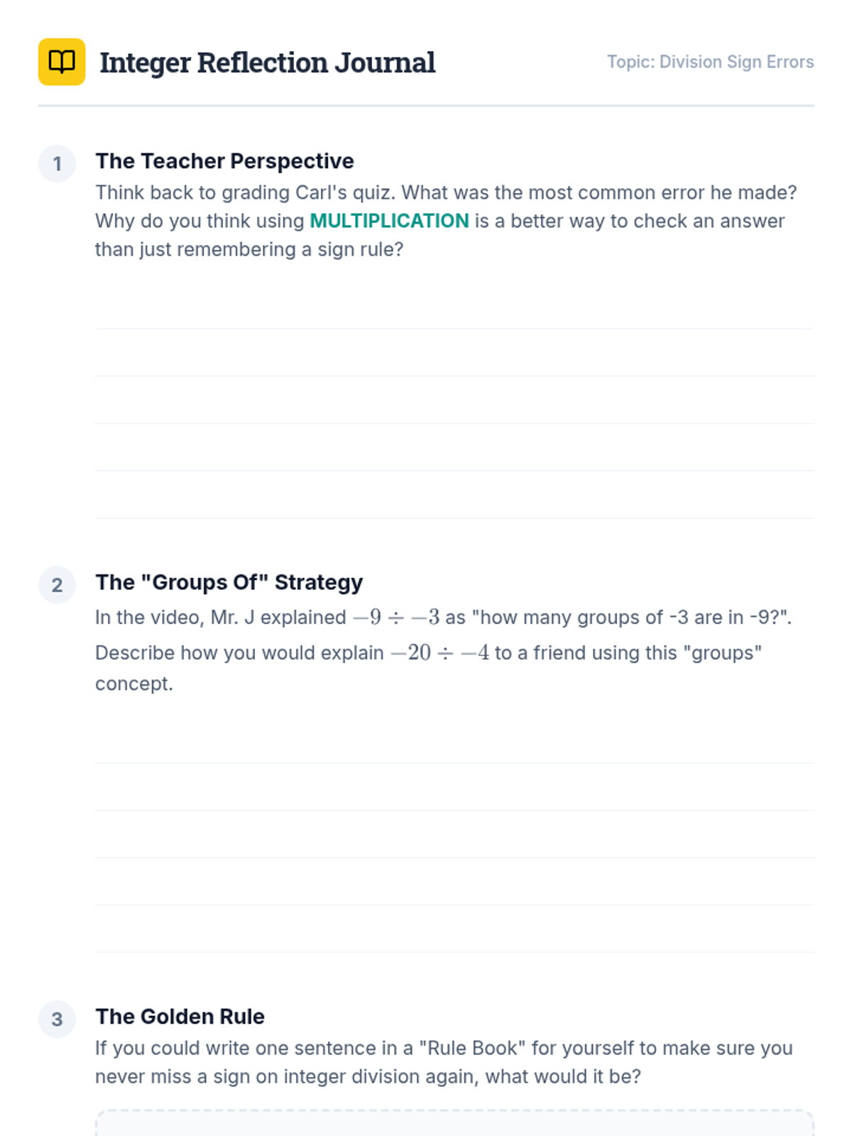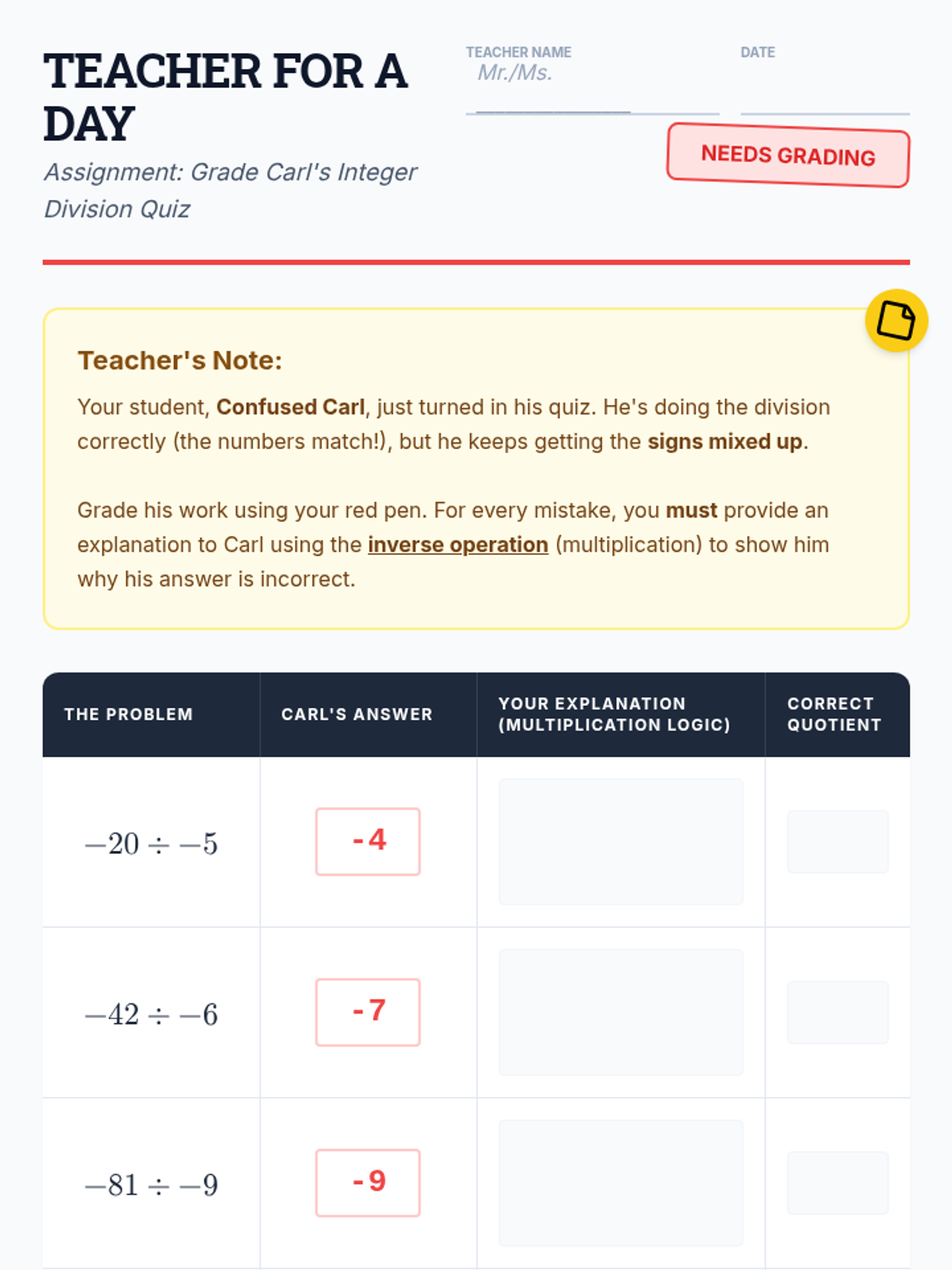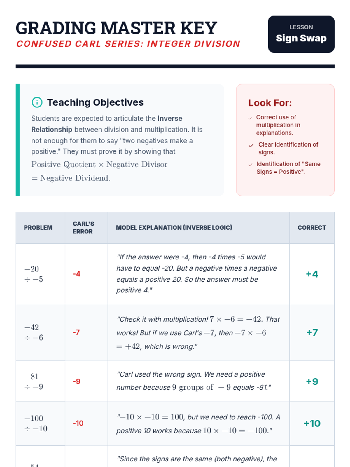 Students will identify and correct common errors in integer division using inverse operation logic and conceptual grouping.