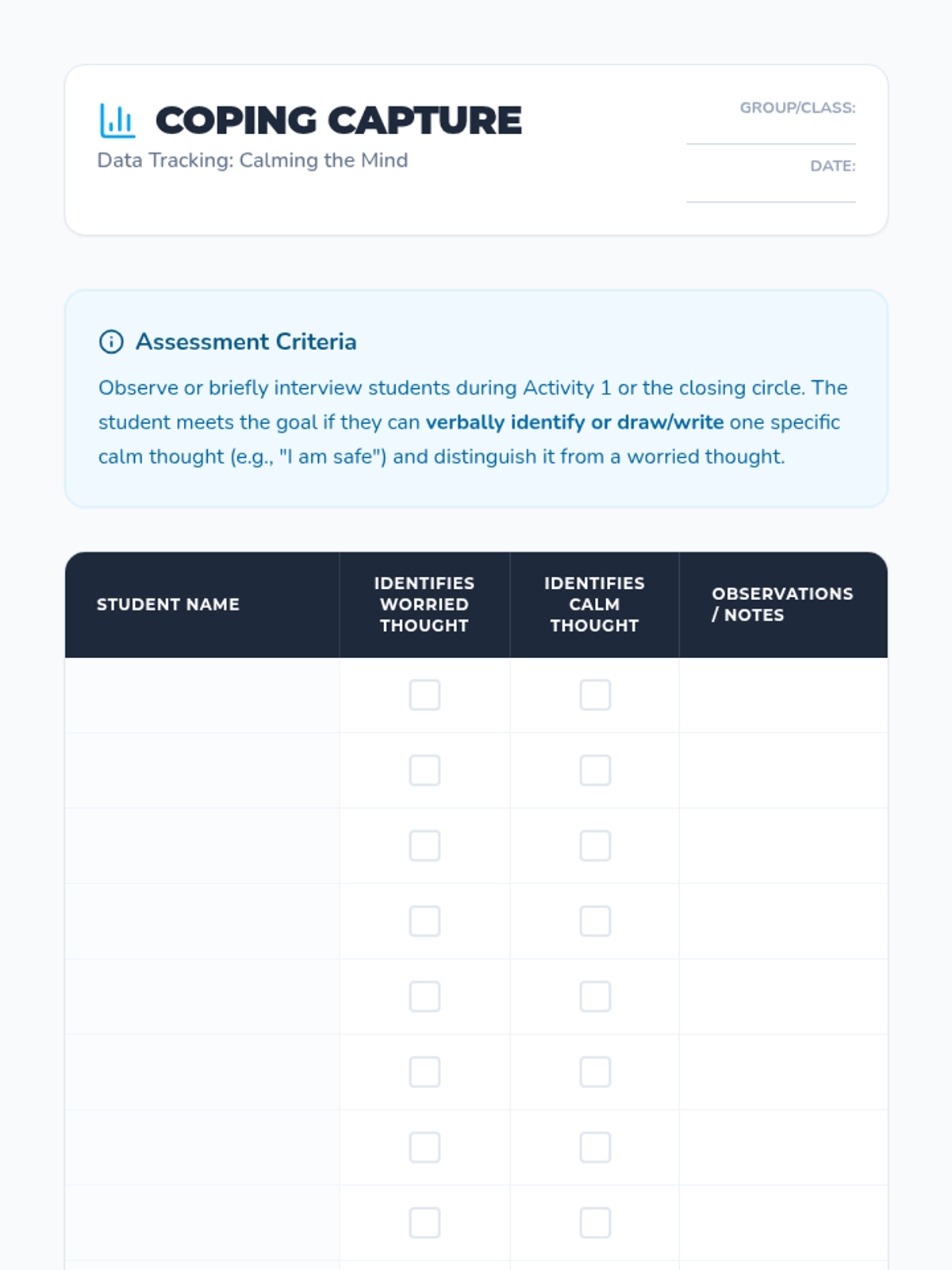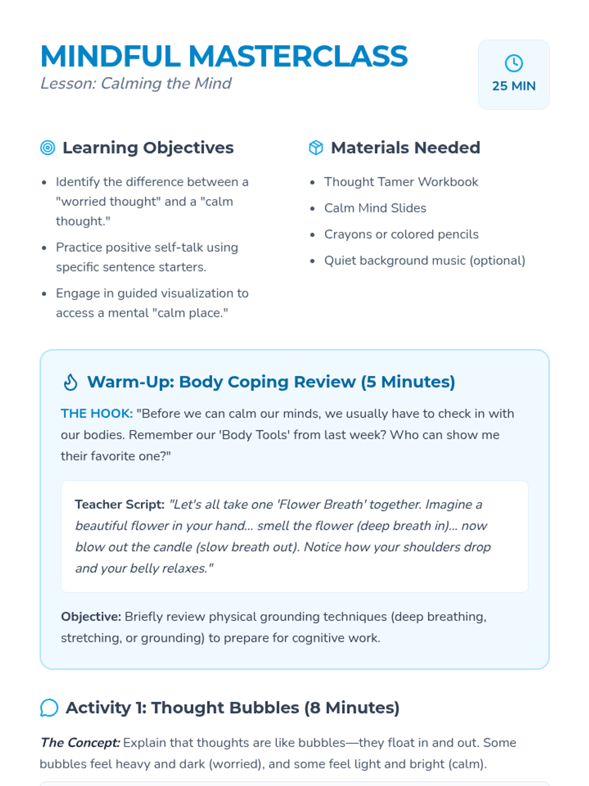 A 25-minute lesson focused on thought awareness and cognitive coping, teaching students to identify worried thoughts and replace them with calm, positive self-talk.