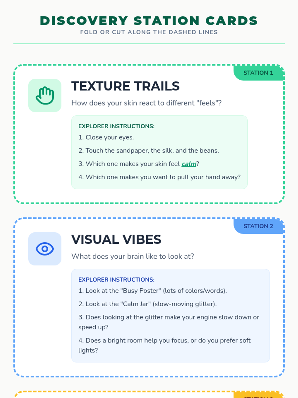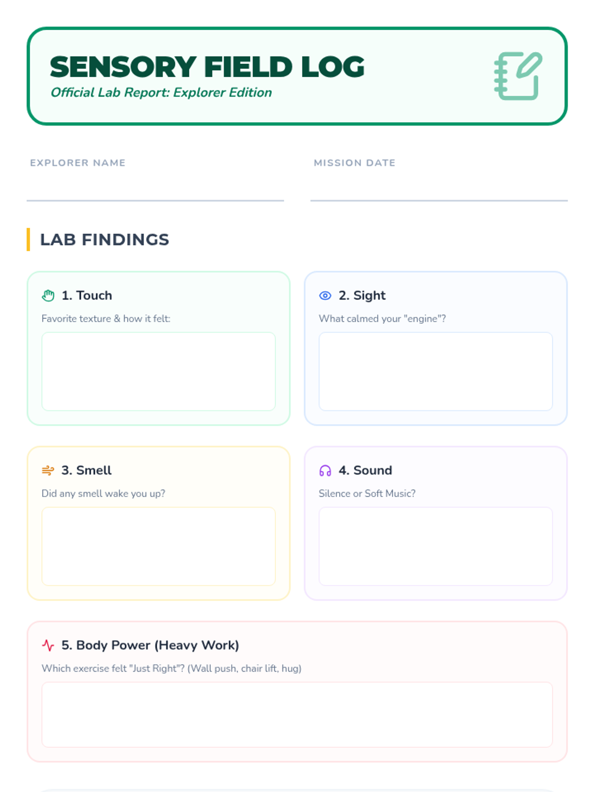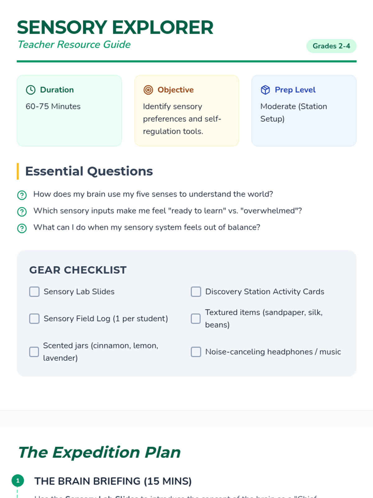 A multi-sensory lesson for 2nd-4th graders to explore their five senses, identify personal sensory preferences, and learn self-regulation strategies through a playful 'field guide' approach.