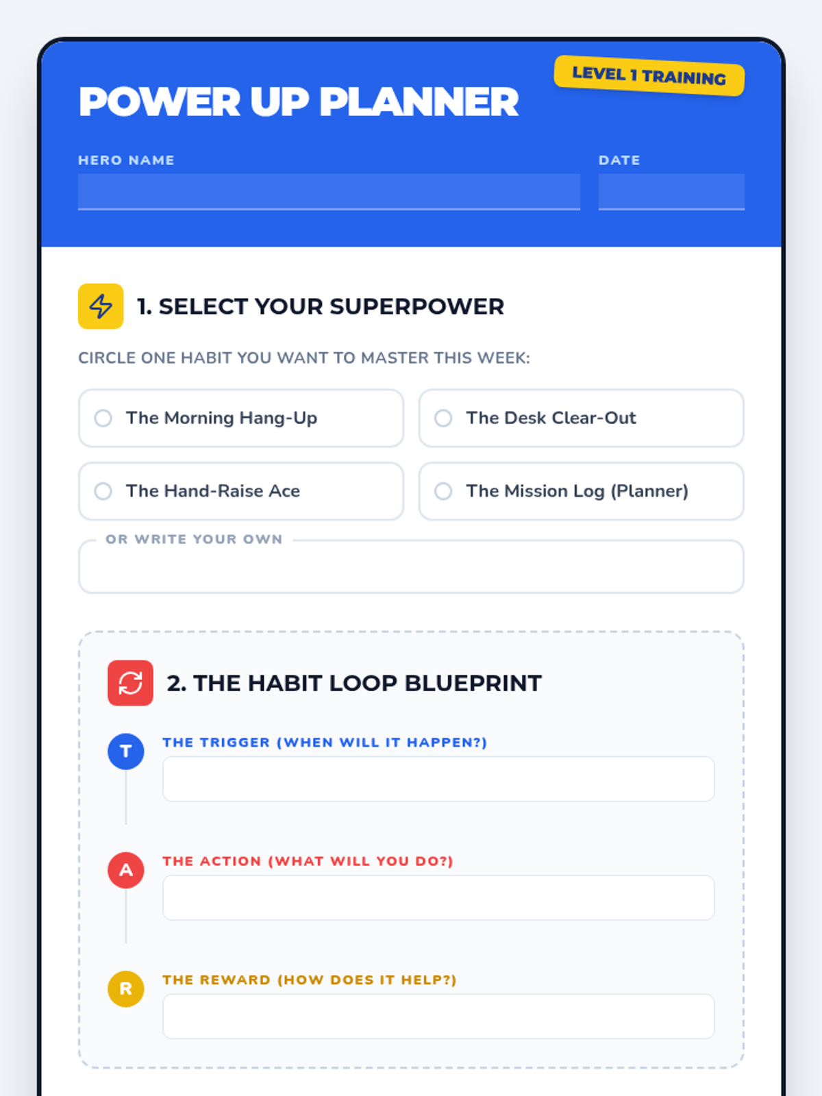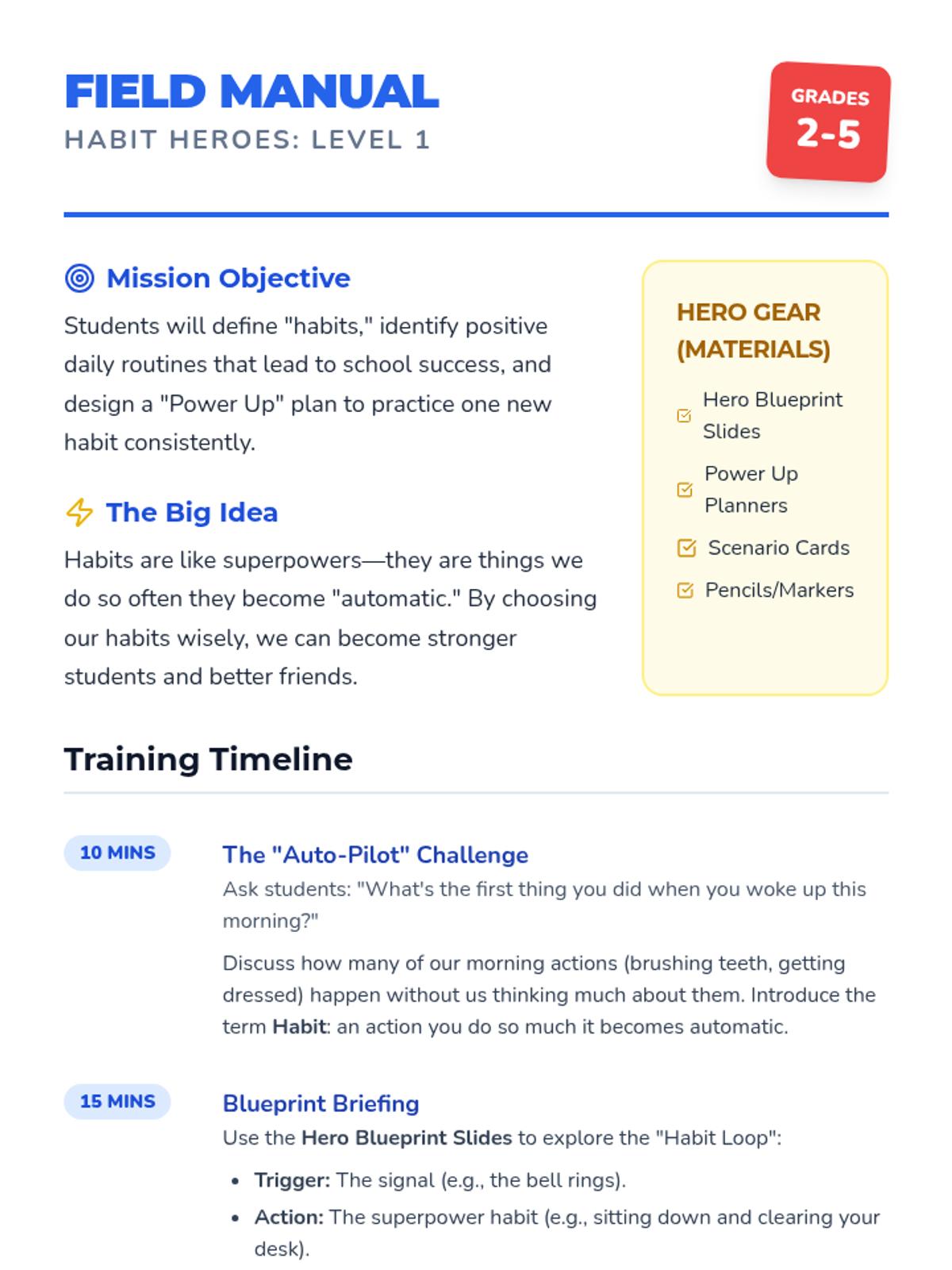 A high-energy lesson that transforms daily routines into 'superpowers.' Students learn the mechanics of habit formation and design a personal plan for self-management and school success.