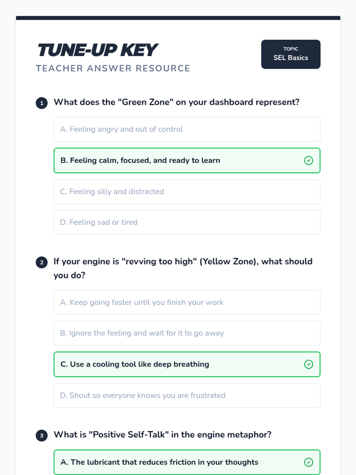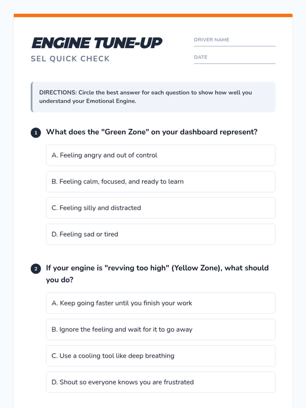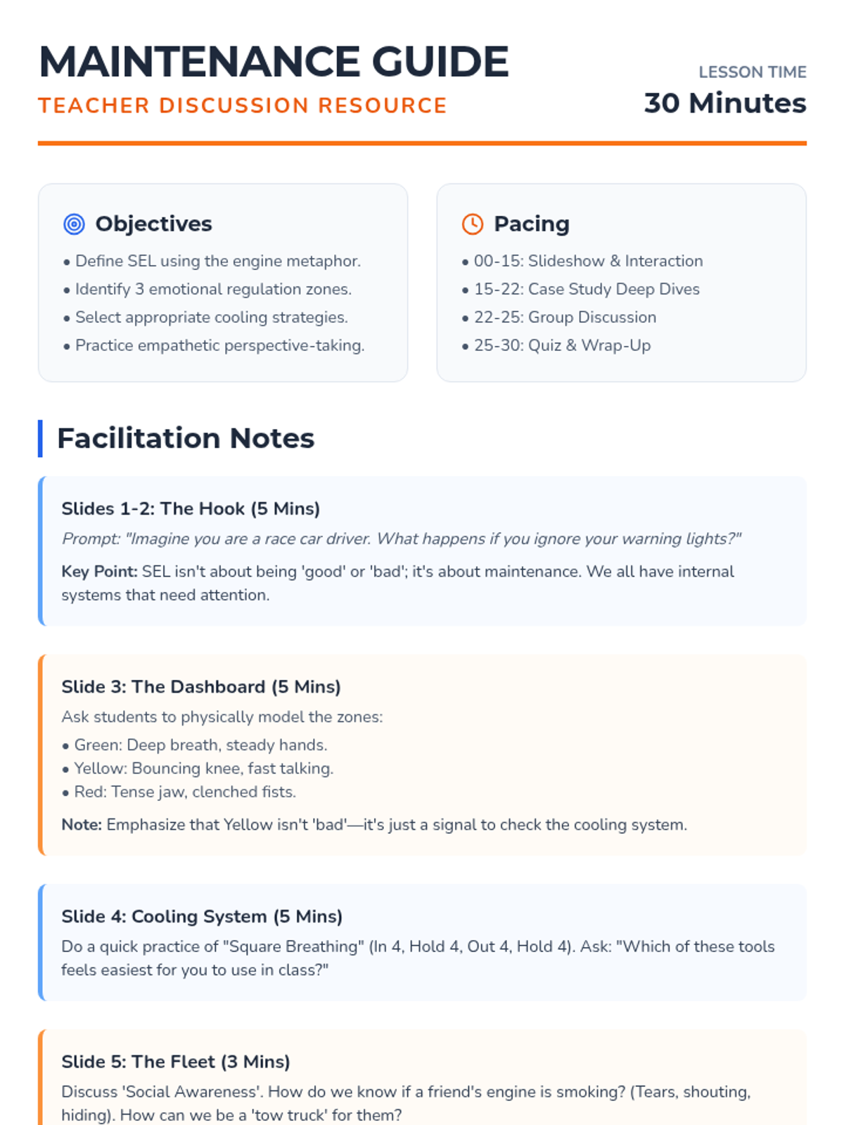A 30-minute introductory lesson on Social Emotional Learning (SEL) focused on self-regulation and empathy using the 'Emotional Engine' metaphor. Includes a presentation, discussion guide, quiz, and answer key.