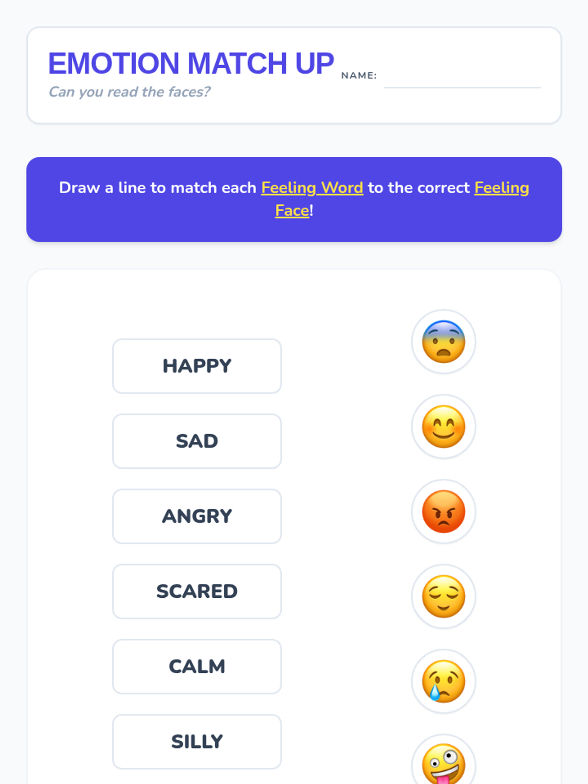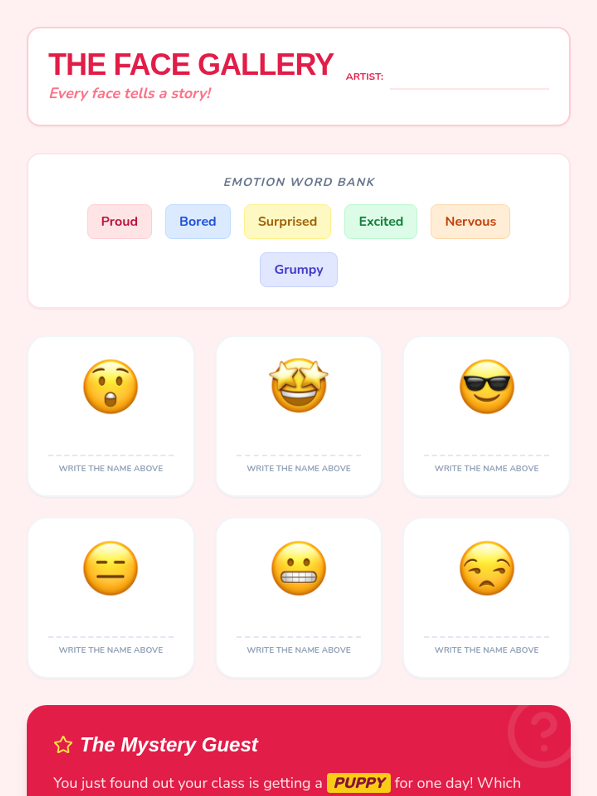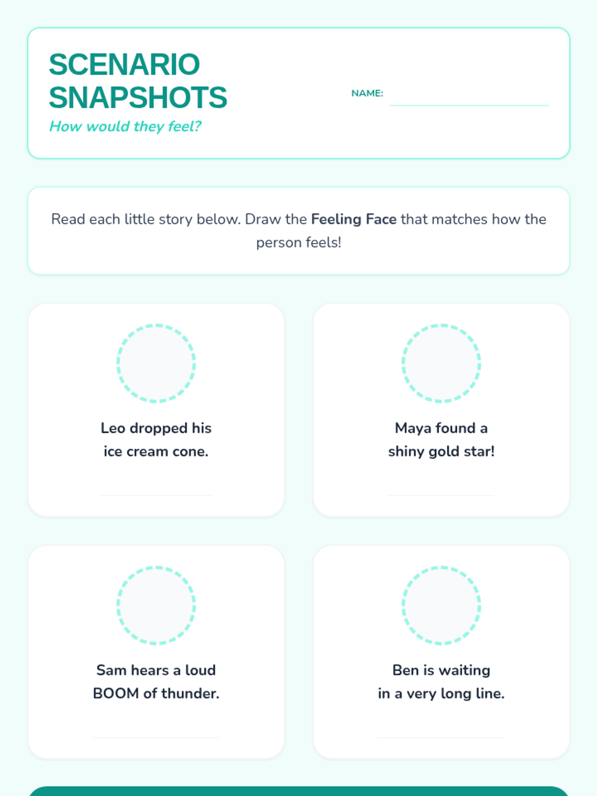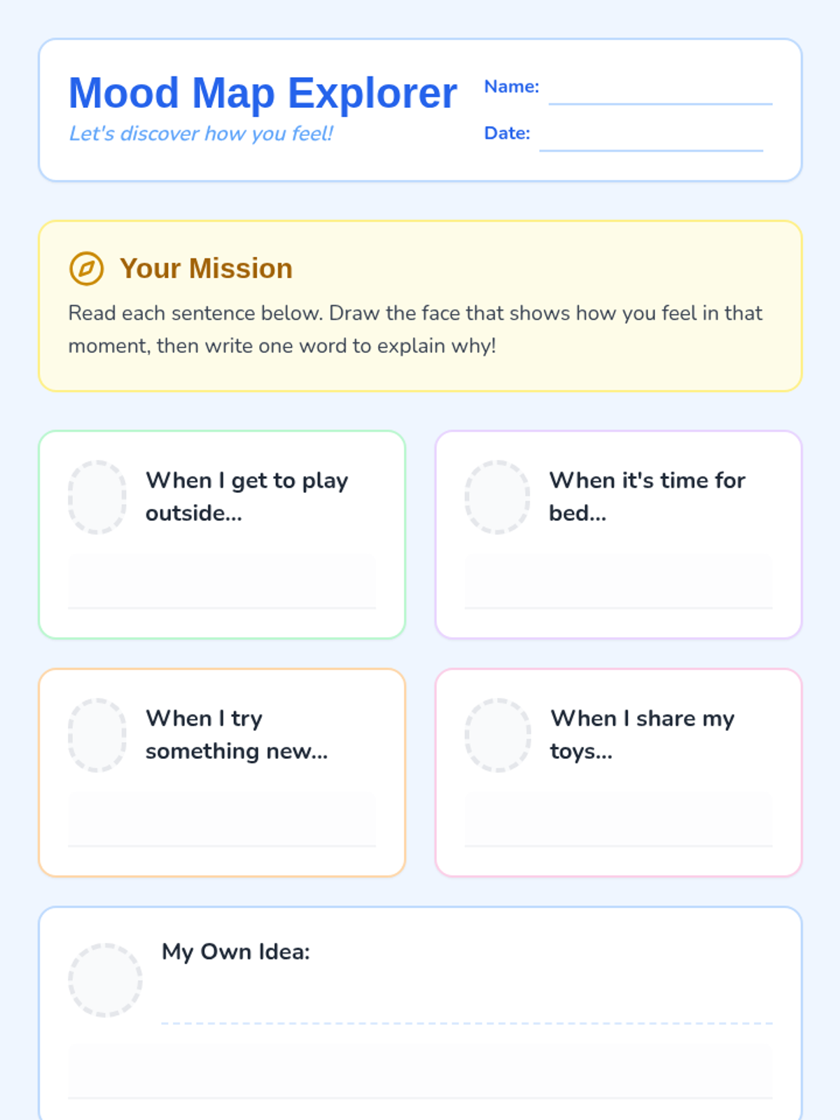 A set of interactive worksheets and activities designed for 2nd graders to share their personalities and experiences through the lens of emotional awareness. Students will map out their 'inner weather,' identify what makes them feel various emotions, and practice recognizing feelings in themselves and others.